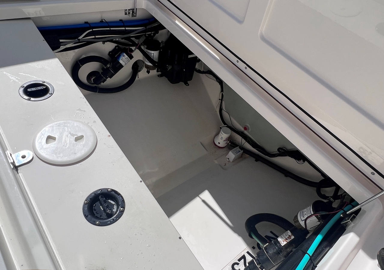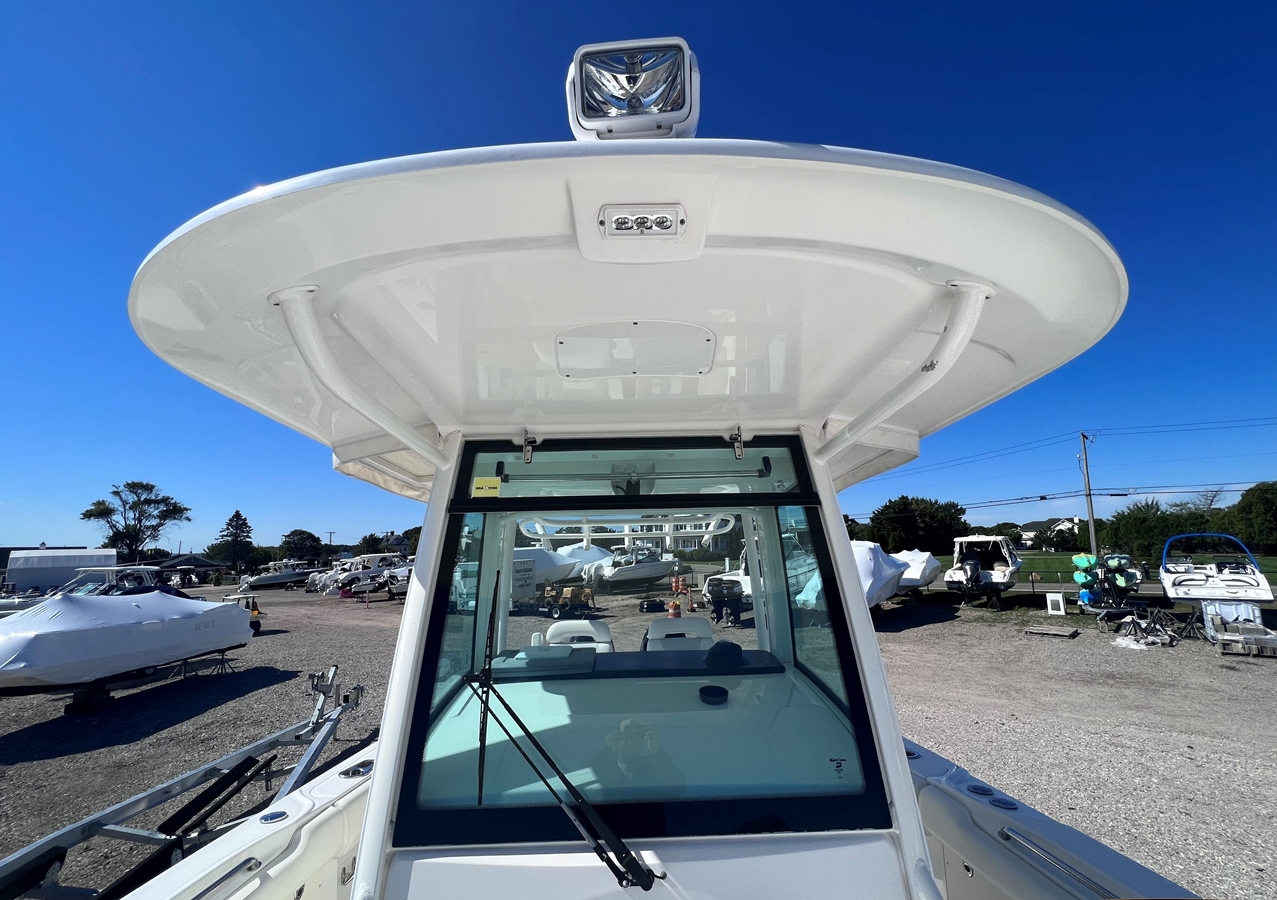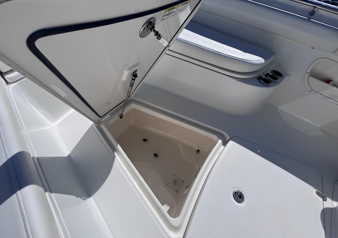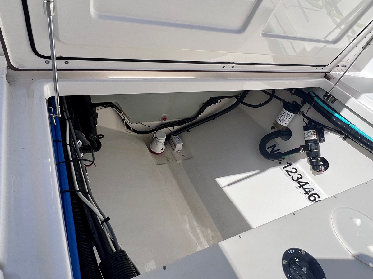 Options: White hull, heavy duty rub rail, electric trim tabs w/ indicator, covered telescoping swim ladder w/ SS grab rail, (3) transom mounted rod holders, transom door w/ SS latch, shorepower w/ battery charger & galvanic isolator, transom shower, port aft 20 gallon livewell, cockpit coaming bolsters, foldaway stern bench seat, (2) aftinsulated floor fishboxes w/ pumpout, SS toe rails w/ downrigger weight holders, (6) gunnel mounted rod holders, deluxe leaning post w/ livewell, prep station, freshwater sink, cutting board & aft storage net, helm & companion bolster style seats, hardtop w/ electronics box, lifejacket storage, (5) rod holders, & radial outriggers, 12V DC receptacle, cast SS steering wheel w/ knb, compass, tempered glass windshield w/ wiper, vacuflush toilet w/ ob discharge & dockside pumpout, fresh water shower in console, forward console seat w/ backrest, forward insulated in-floor fishbox w/ pumpout, forward deck seating w/ bolsters & (2) drink holders, anchor windlass w/ SS anchor & freshwater washdown, (3) lines, (2) fenders, fire extinguisher & throw cushion.