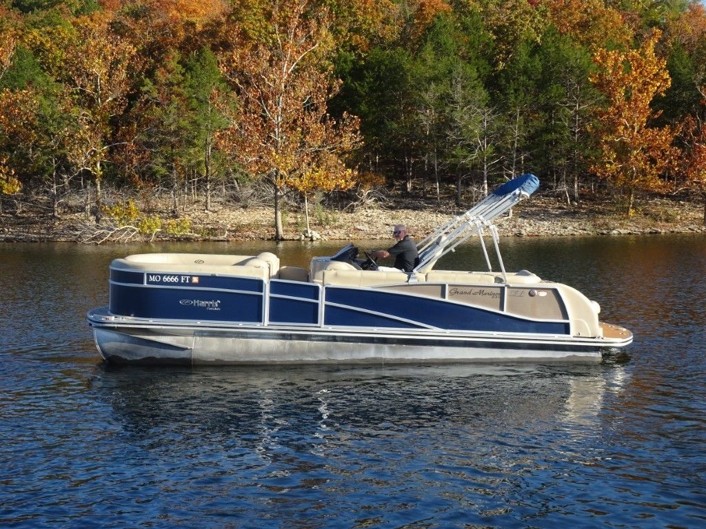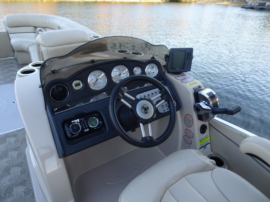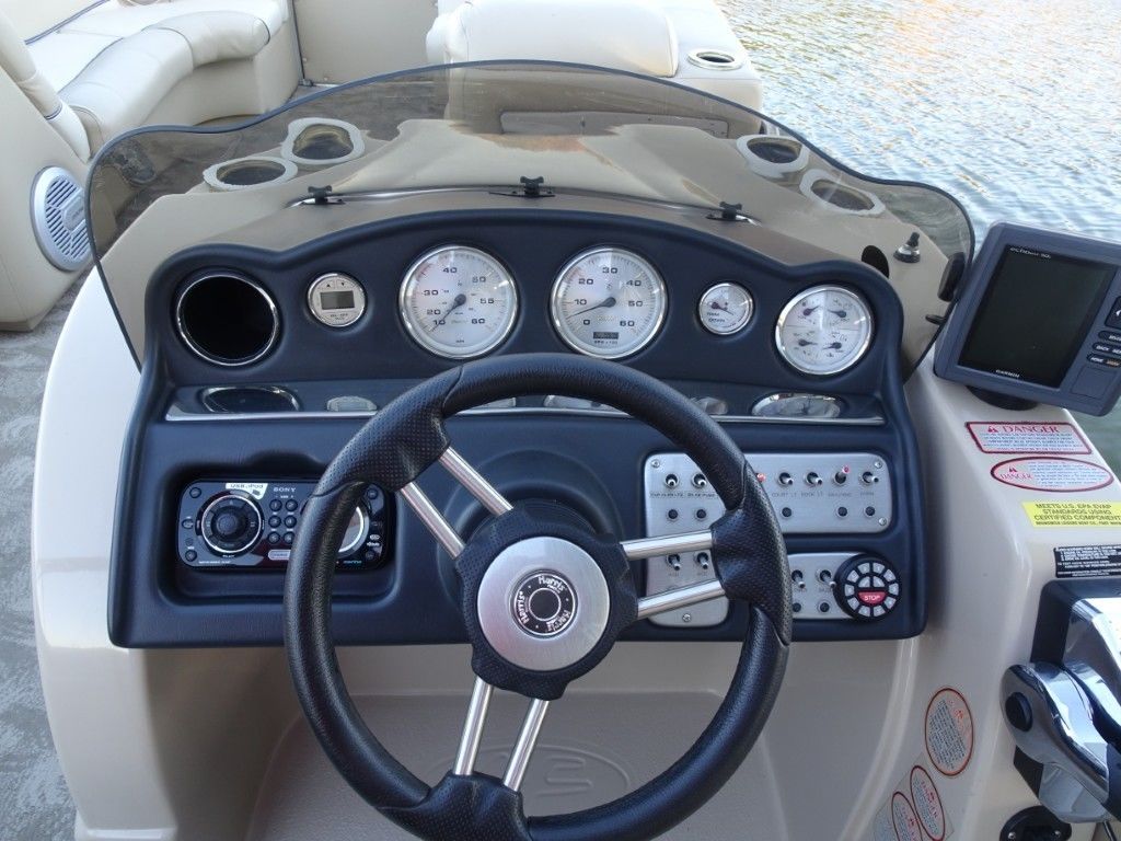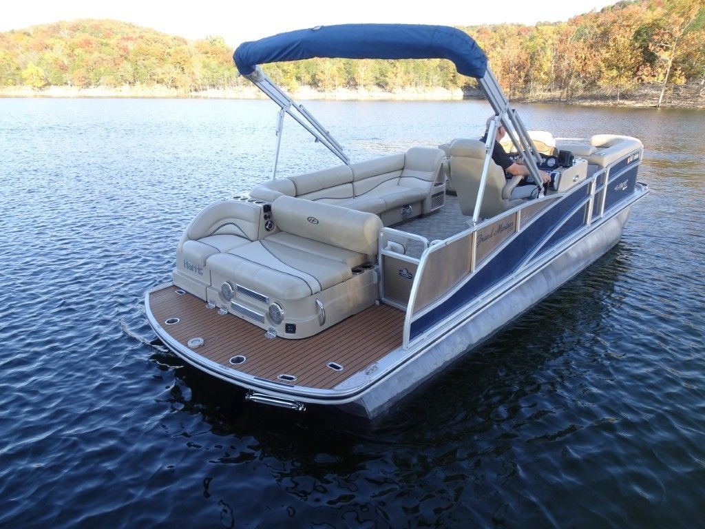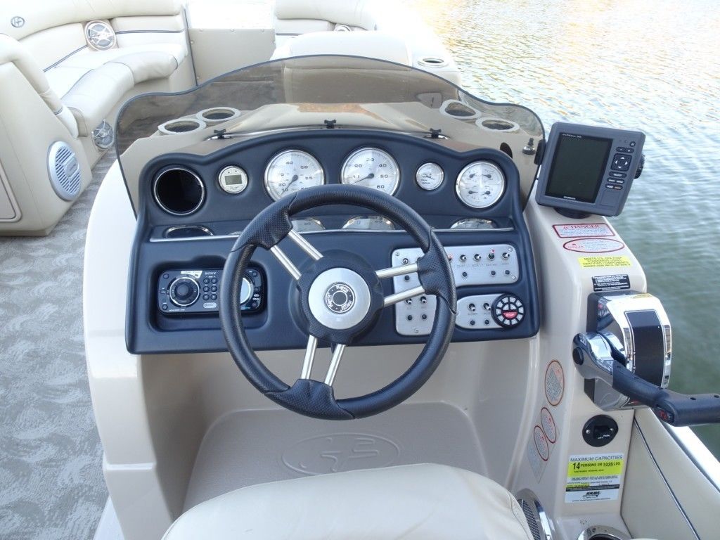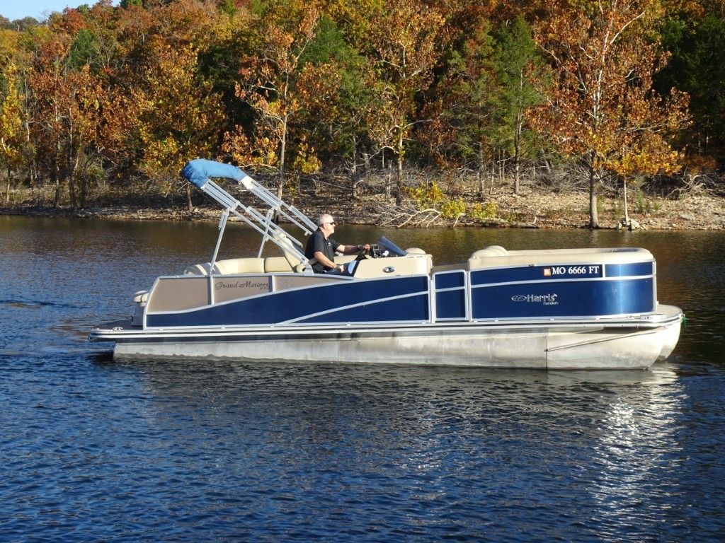 This is a 2010 Harris Grand Mariner 230 SEL Tri-toon in Navy/Gold and Tan Interior. It is powered by a Mercruiser 350MAG 300hp w/558 hours and has the following options:
