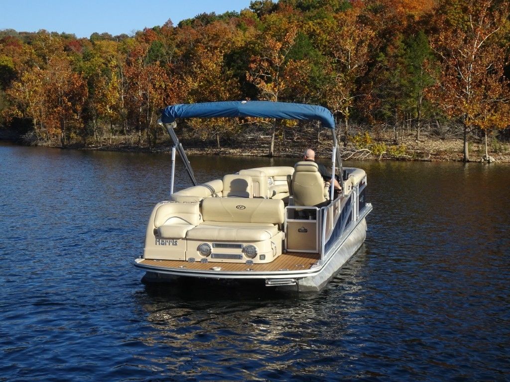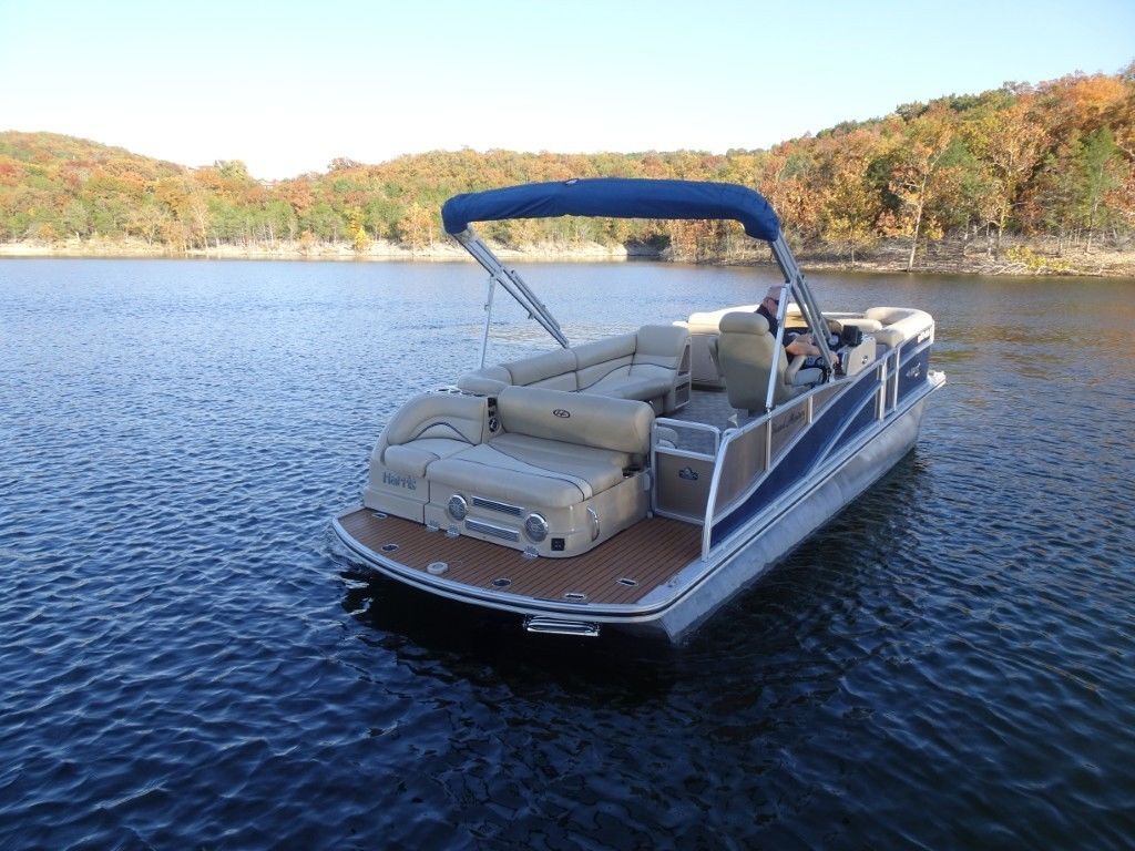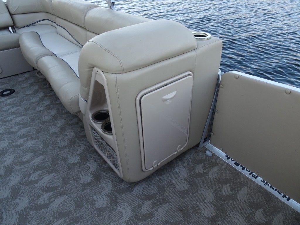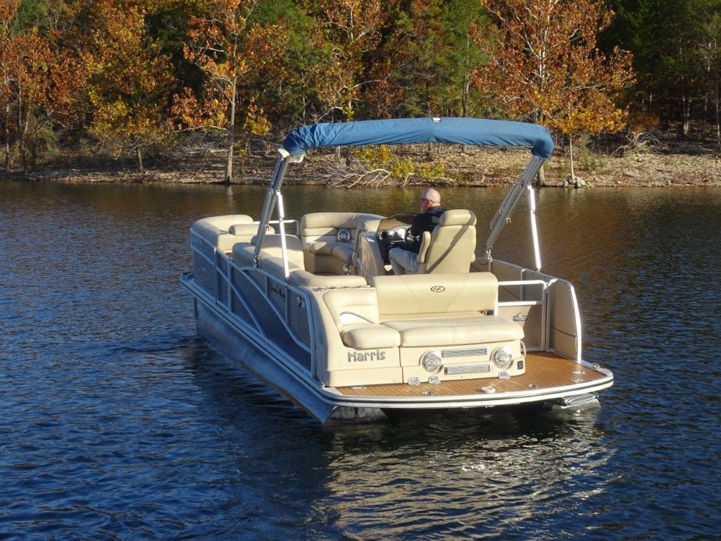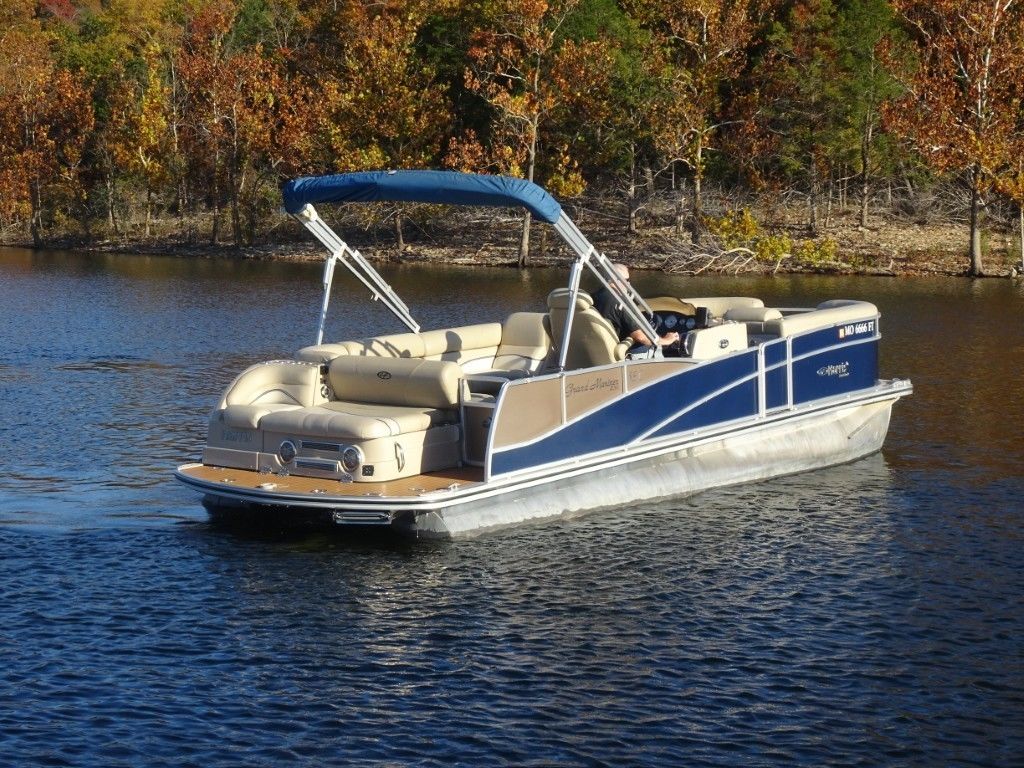 This is a 2010 Harris Grand Mariner 230 SEL Tri-toon in Navy/Gold and Tan Interior. It is powered by a Mercruiser 350MAG 300hp w/558 hours and has the following options: