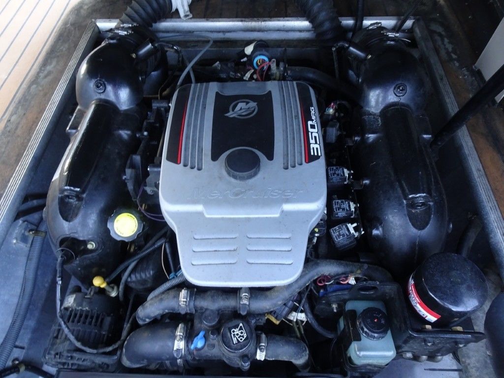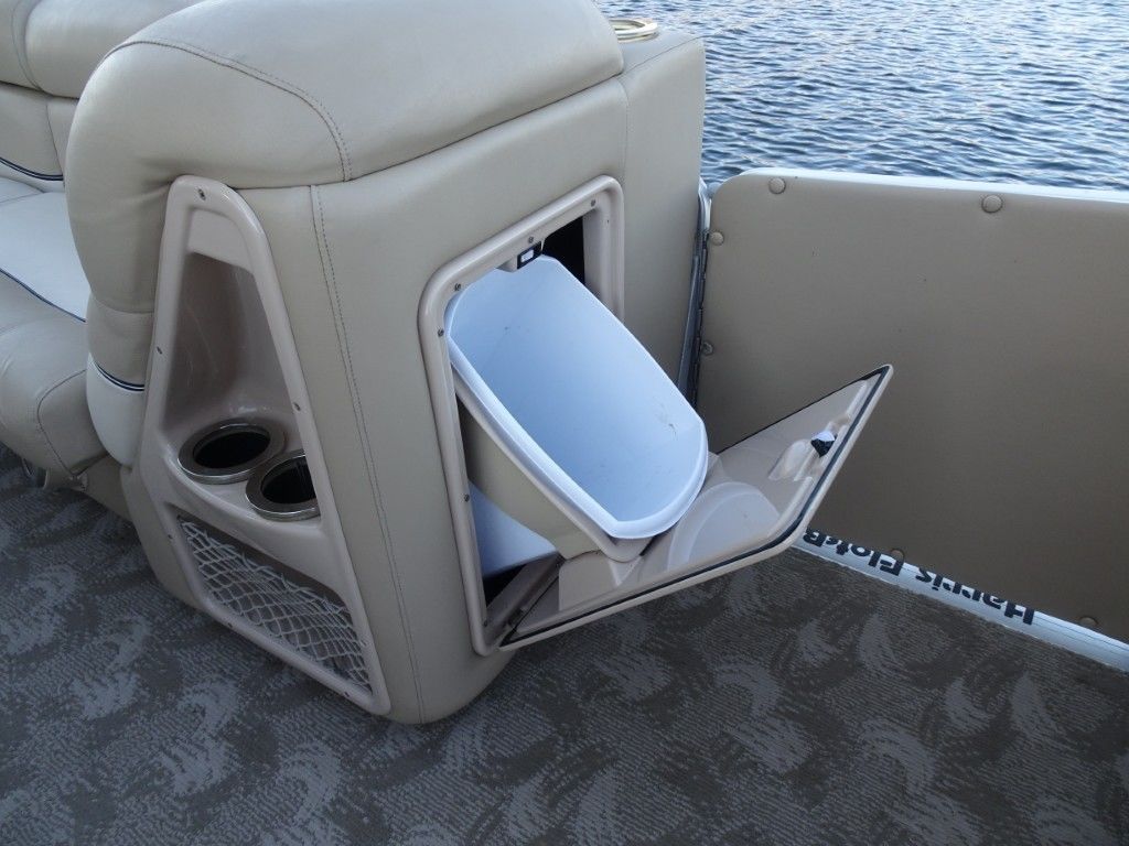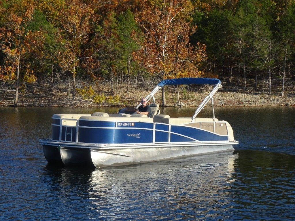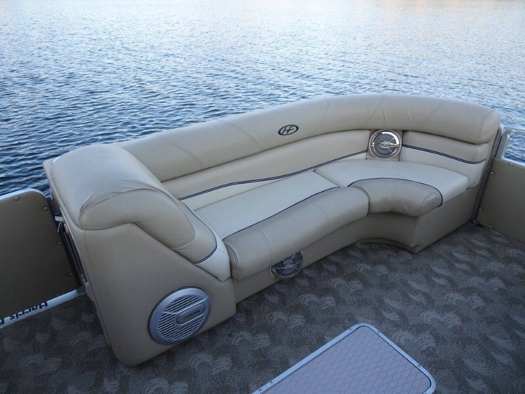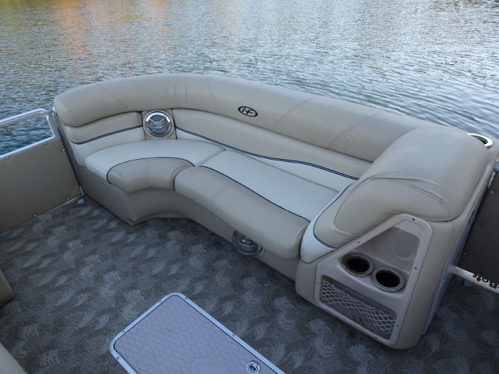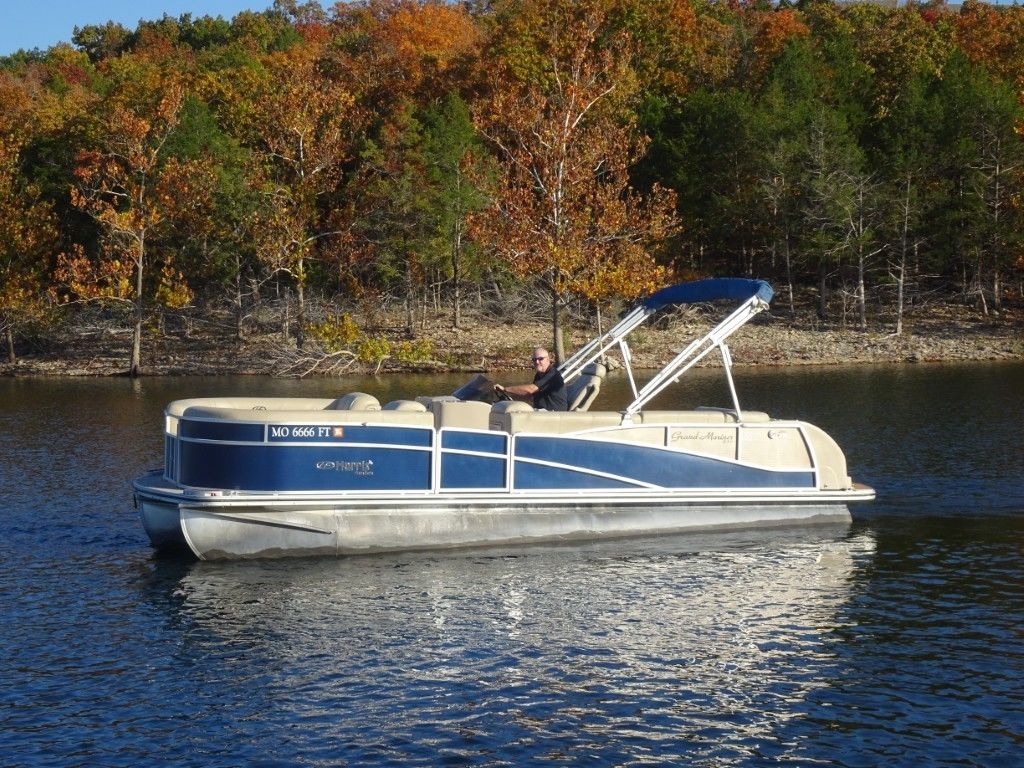 This is a 2010 Harris Grand Mariner 230 SEL Tri-toon in Navy/Gold and Tan Interior. It is powered by a Mercruiser 350MAG 300hp w/558 hours and has the following options: