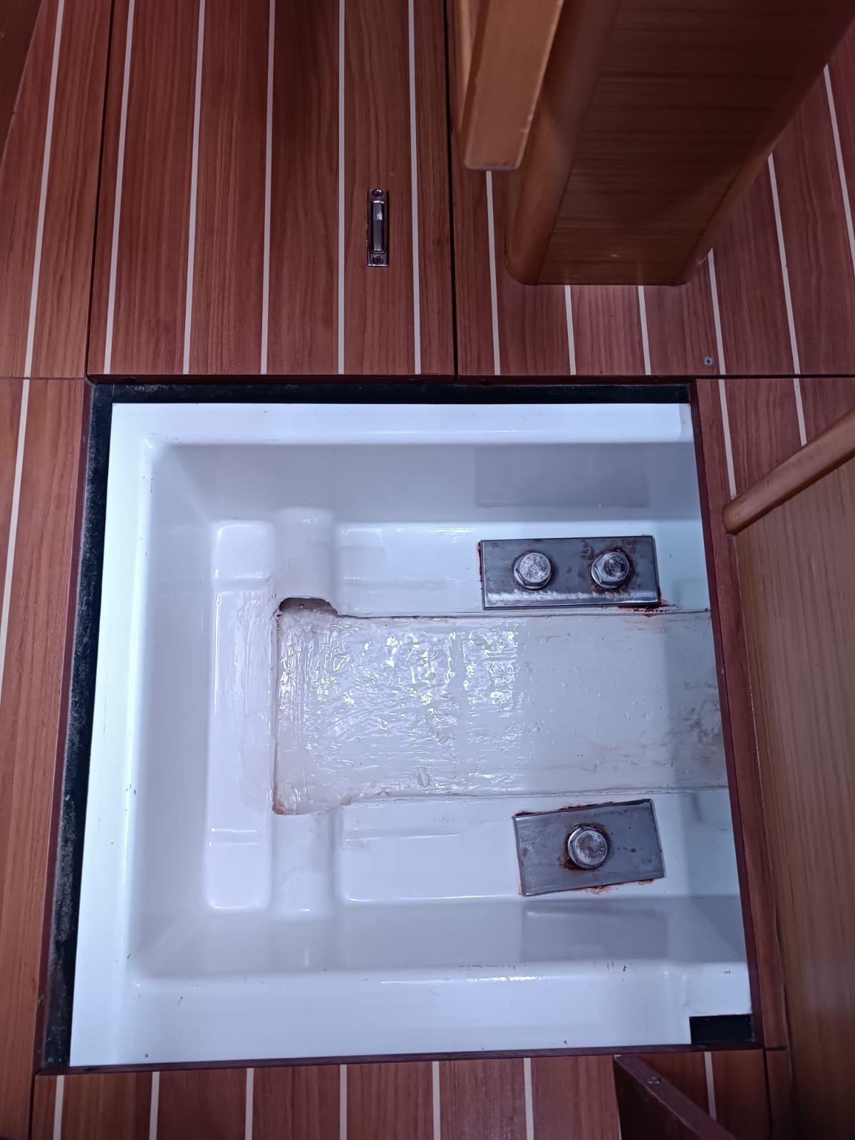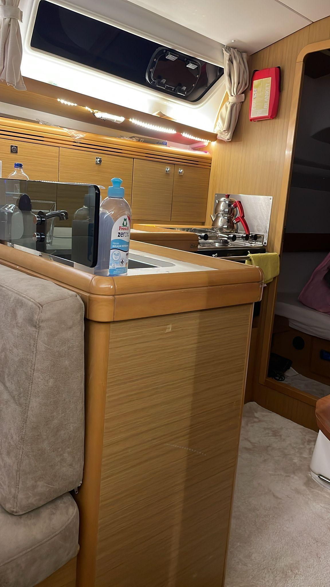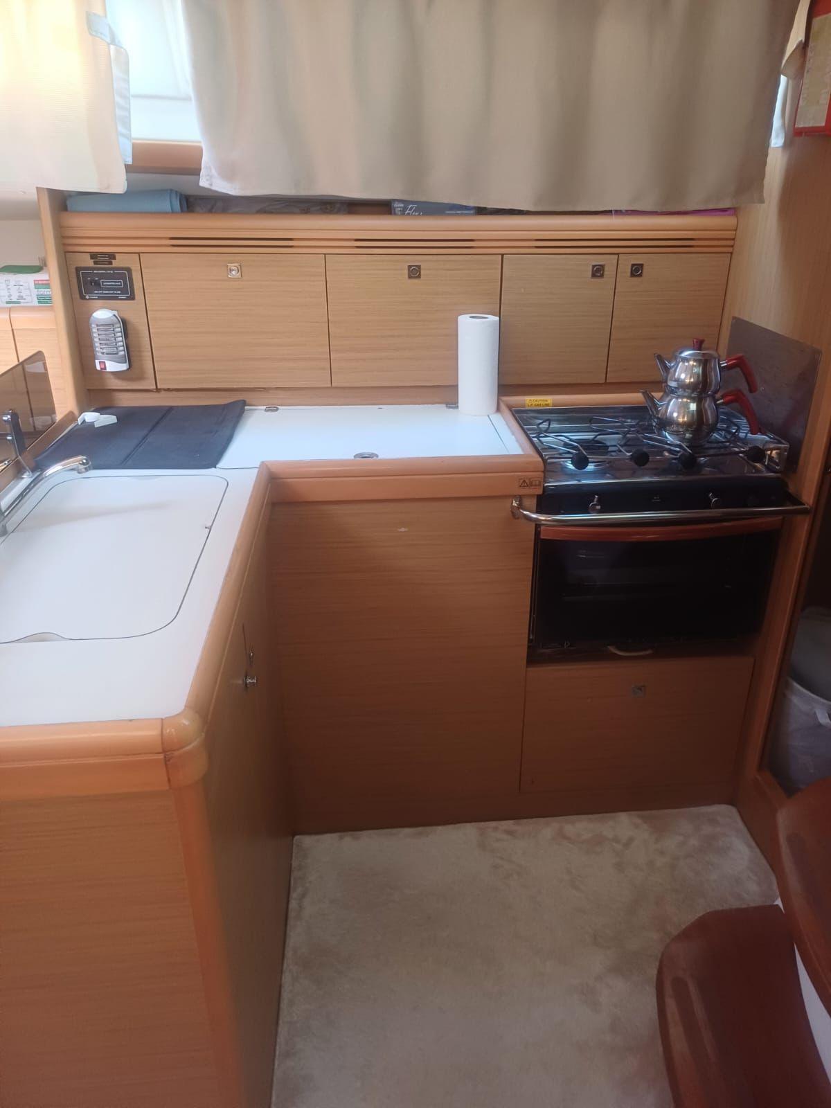 Fully equipped galley with a two-burner stove, oven, top-loading fridge, and sink