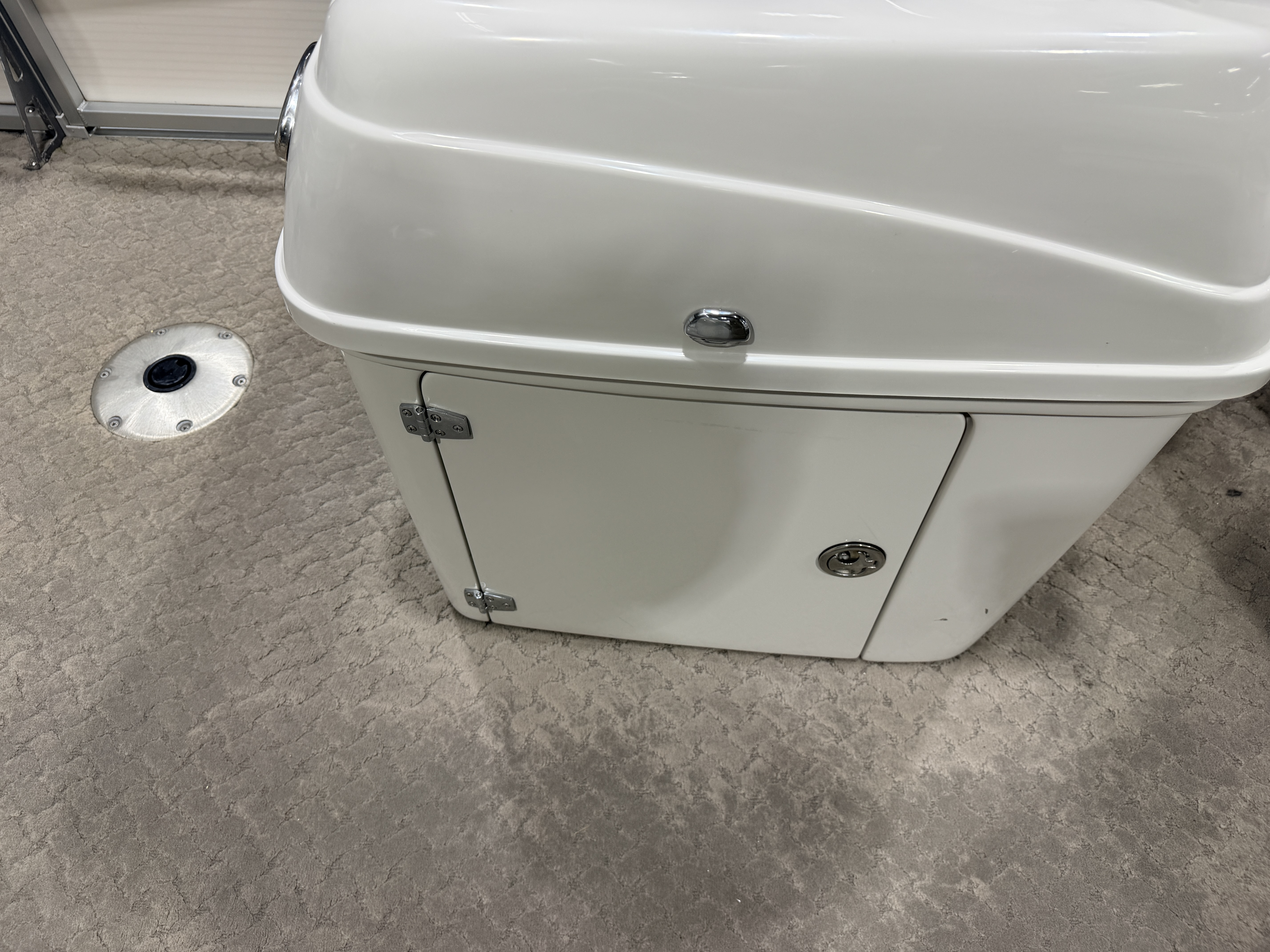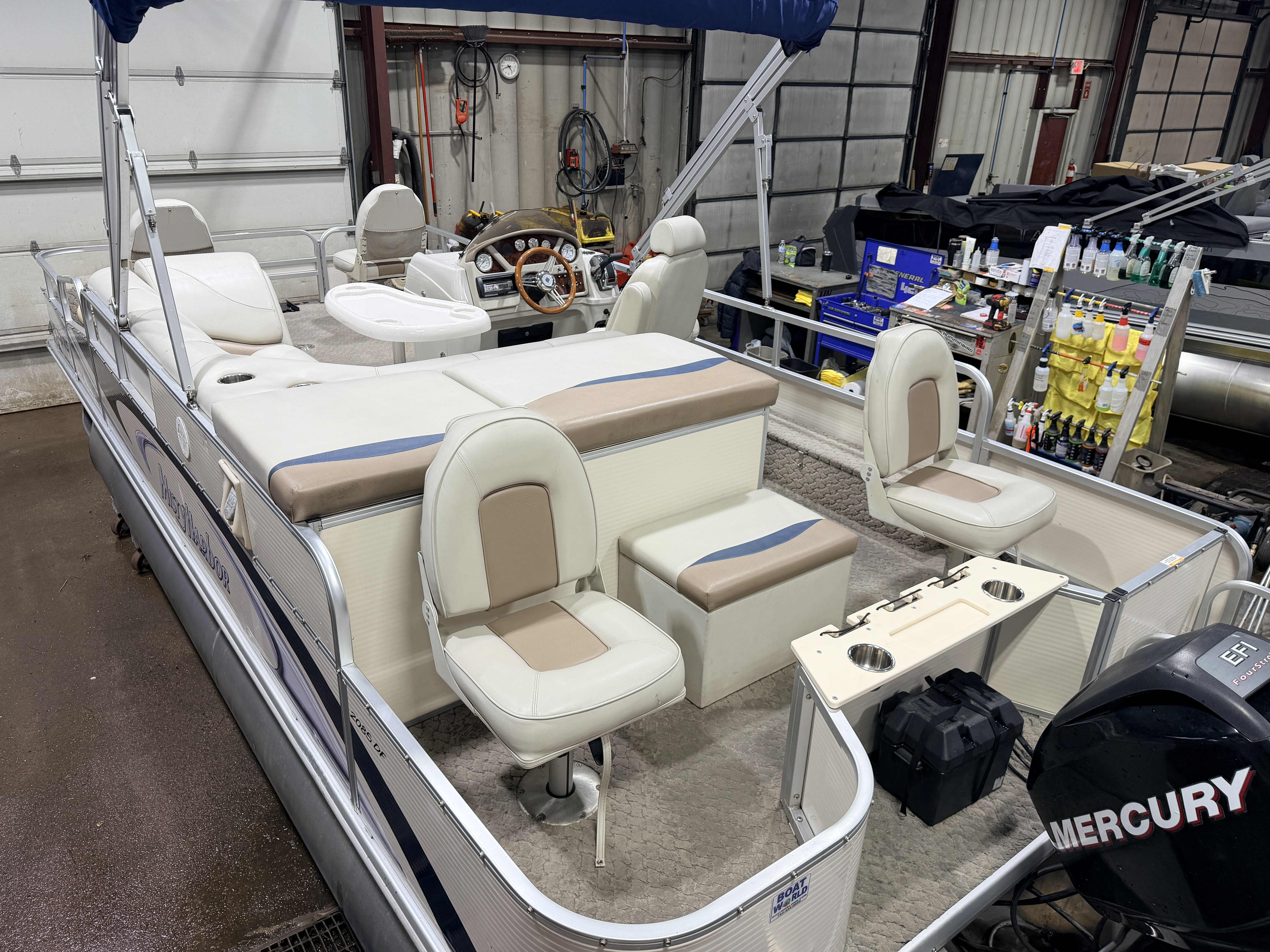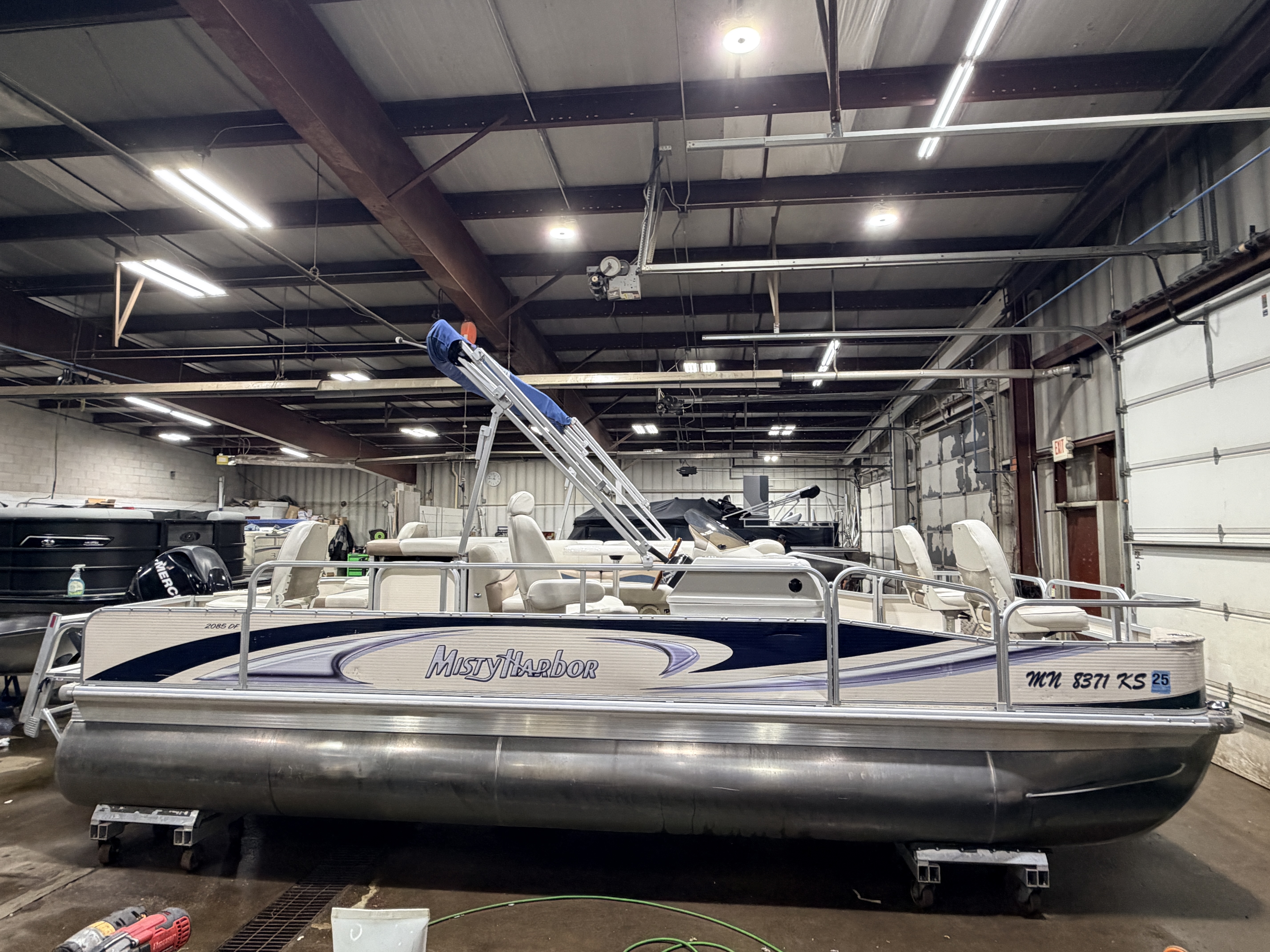 2010 Misty Harbor 2085DF Quad Fish Pontoon & 50HP Mercury Fourstroke EFI. Interior seating includes Captain's Chair, L-shaped couch, and 4 fishing seats with 6 mounting locations. Features include fiberglass helm stand with Speedometer, Tachometer, Fuel, Volt and Trim gauge, Clarion Stereo, Bimini top, mini corner consoles in front, Fishing Rod Storage, vertical rod storage, Livewell, Privacy/Changing Station, Sun Deck, Table with 2 mounting locations, Courtesy Lights, Docking Lights, Fold-down Swim Ladder with platform.