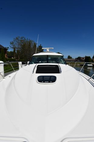 Features Twin Cummins QSB 380 HO P 380-hp Diesel Engine's w/Zues Pod's (w/Skyhook / Joy-Stick Piloting) and 1034 original hours. Notable features include but are not limited to the following: Air-Conditioning & Heat (3-Units - Including Cockpit AC/Heat), Head (Vacuflush) w/Vanity/Sink/Stall-Shower, Central Vacuum, Onan 11.5kw Generator (885-hrs), Windlass Anchor w/Forward Pedal-Controls (Note Anchor Locker Freshwater Washdown), Raymarine E120 Color MFD w/Radar/GPS/Chartplotter - Mercury Precision-Pilot w/Sky-Hook / Joy-Stick Piloting, Sony Premium Sound System, Cockpit Wet Bar w/Sink/Refrigerator/Electric BBQ-Grill, Hardtop w/Electric Sun-Roof, Plasteak Cockpit / Swim-Platform Decking, and MUCH more!