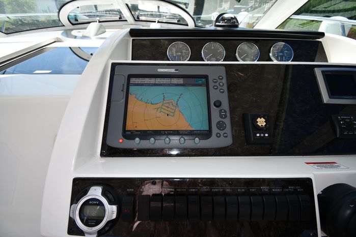 Features Twin Cummins QSB 380 HO P 380-hp Diesel Engine's w/Zues Pod's (w/Skyhook / Joy-Stick Piloting) and 1034 original hours. Notable features include but are not limited to the following: Air-Conditioning & Heat (3-Units - Including Cockpit AC/Heat), Head (Vacuflush) w/Vanity/Sink/Stall-Shower, Central Vacuum, Onan 11.5kw Generator (885-hrs), Windlass Anchor w/Forward Pedal-Controls (Note Anchor Locker Freshwater Washdown), Raymarine E120 Color MFD w/Radar/GPS/Chartplotter - Mercury Precision-Pilot w/Sky-Hook / Joy-Stick Piloting, Sony Premium Sound System, Cockpit Wet Bar w/Sink/Refrigerator/Electric BBQ-Grill, Hardtop w/Electric Sun-Roof, Plasteak Cockpit / Swim-Platform Decking, and MUCH more!