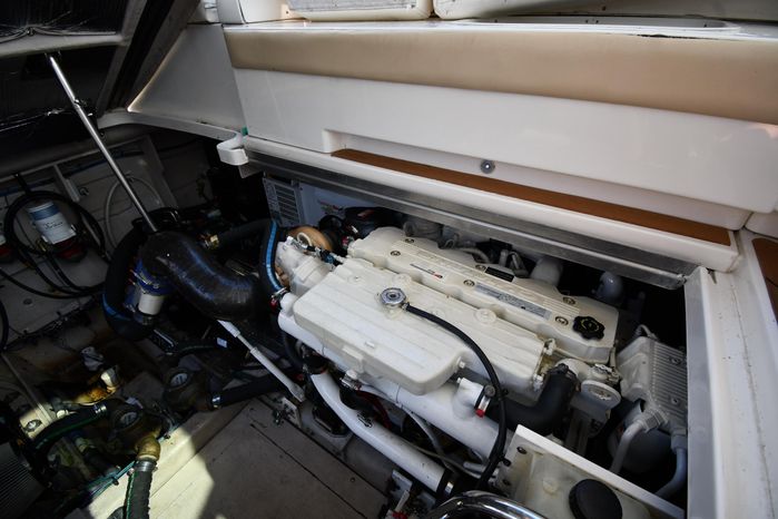 Features Twin Cummins QSB 380 HO P 380-hp Diesel Engine's w/Zues Pod's (w/Skyhook / Joy-Stick Piloting) and 1034 original hours. Notable features include but are not limited to the following: Air-Conditioning & Heat (3-Units - Including Cockpit AC/Heat), Head (Vacuflush) w/Vanity/Sink/Stall-Shower, Central Vacuum, Onan 11.5kw Generator (885-hrs), Windlass Anchor w/Forward Pedal-Controls (Note Anchor Locker Freshwater Washdown), Raymarine E120 Color MFD w/Radar/GPS/Chartplotter - Mercury Precision-Pilot w/Sky-Hook / Joy-Stick Piloting, Sony Premium Sound System, Cockpit Wet Bar w/Sink/Refrigerator/Electric BBQ-Grill, Hardtop w/Electric Sun-Roof, Plasteak Cockpit / Swim-Platform Decking, and MUCH more!