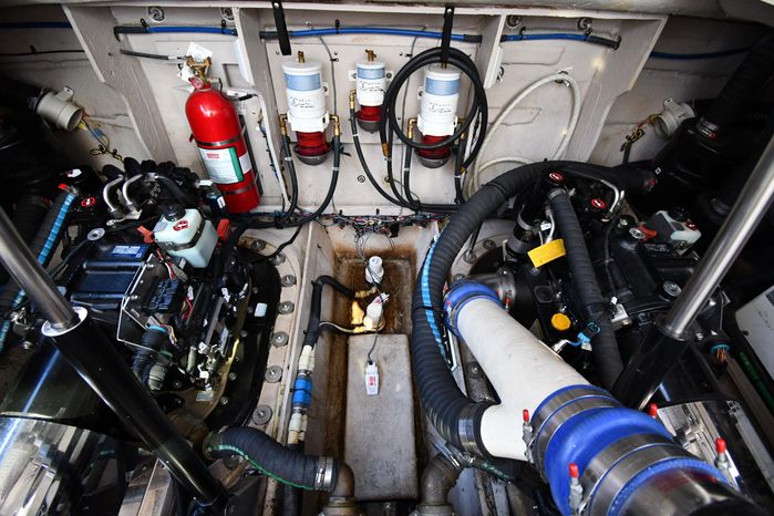 Features Twin Cummins QSB 380 HO P 380-hp Diesel Engine's w/Zues Pod's (w/Skyhook / Joy-Stick Piloting) and 1034 original hours. Notable features include but are not limited to the following: Air-Conditioning & Heat (3-Units - Including Cockpit AC/Heat), Head (Vacuflush) w/Vanity/Sink/Stall-Shower, Central Vacuum, Onan 11.5kw Generator (885-hrs), Windlass Anchor w/Forward Pedal-Controls (Note Anchor Locker Freshwater Washdown), Raymarine E120 Color MFD w/Radar/GPS/Chartplotter - Mercury Precision-Pilot w/Sky-Hook / Joy-Stick Piloting, Sony Premium Sound System, Cockpit Wet Bar w/Sink/Refrigerator/Electric BBQ-Grill, Hardtop w/Electric Sun-Roof, Plasteak Cockpit / Swim-Platform Decking, and MUCH more!