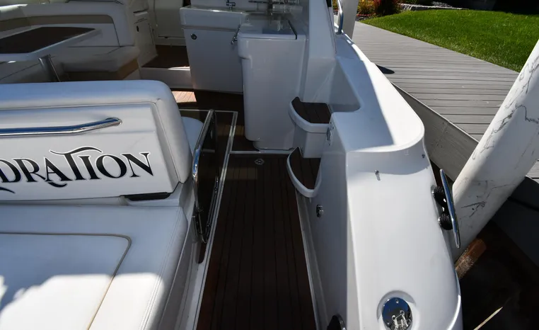 Features Twin Cummins QSB 380 HO P 380-hp Diesel Engine's w/Zues Pod's (w/Skyhook / Joy-Stick Piloting) and 1034 original hours. Notable features include but are not limited to the following: Air-Conditioning & Heat (3-Units - Including Cockpit AC/Heat), Head (Vacuflush) w/Vanity/Sink/Stall-Shower, Central Vacuum, Onan 11.5kw Generator (885-hrs), Windlass Anchor w/Forward Pedal-Controls (Note Anchor Locker Freshwater Washdown), Raymarine E120 Color MFD w/Radar/GPS/Chartplotter - Mercury Precision-Pilot w/Sky-Hook / Joy-Stick Piloting, Sony Premium Sound System, Cockpit Wet Bar w/Sink/Refrigerator/Electric BBQ-Grill, Hardtop w/Electric Sun-Roof, Plasteak Cockpit / Swim-Platform Decking, and MUCH more!