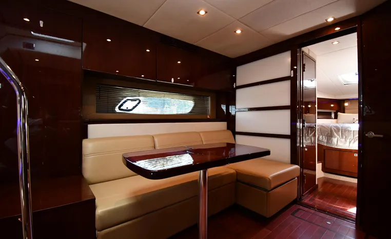 Features Twin Cummins QSB 380 HO P 380-hp Diesel Engine's w/Zues Pod's (w/Skyhook / Joy-Stick Piloting) and 1034 original hours. Notable features include but are not limited to the following: Air-Conditioning & Heat (3-Units - Including Cockpit AC/Heat), Head (Vacuflush) w/Vanity/Sink/Stall-Shower, Central Vacuum, Onan 11.5kw Generator (885-hrs), Windlass Anchor w/Forward Pedal-Controls (Note Anchor Locker Freshwater Washdown), Raymarine E120 Color MFD w/Radar/GPS/Chartplotter - Mercury Precision-Pilot w/Sky-Hook / Joy-Stick Piloting, Sony Premium Sound System, Cockpit Wet Bar w/Sink/Refrigerator/Electric BBQ-Grill, Hardtop w/Electric Sun-Roof, Plasteak Cockpit / Swim-Platform Decking, and MUCH more!