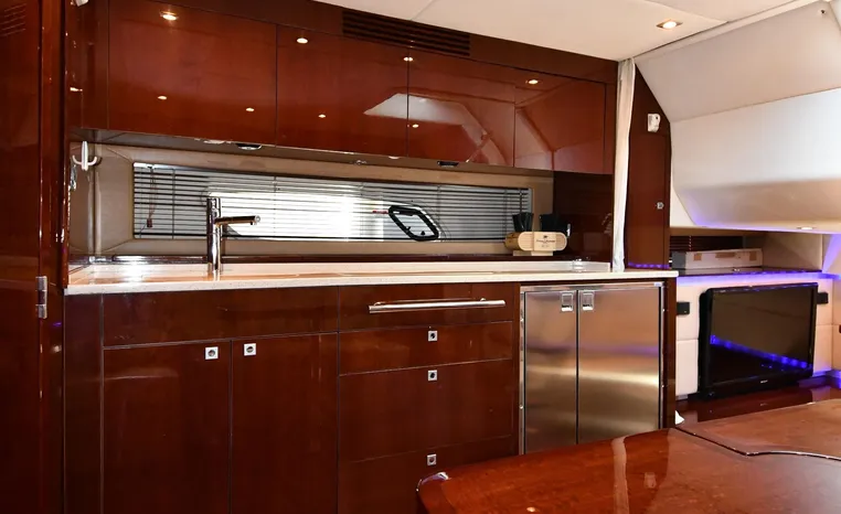 Features Twin Cummins QSB 380 HO P 380-hp Diesel Engine's w/Zues Pod's (w/Skyhook / Joy-Stick Piloting) and 1034 original hours. Notable features include but are not limited to the following: Air-Conditioning & Heat (3-Units - Including Cockpit AC/Heat), Head (Vacuflush) w/Vanity/Sink/Stall-Shower, Central Vacuum, Onan 11.5kw Generator (885-hrs), Windlass Anchor w/Forward Pedal-Controls (Note Anchor Locker Freshwater Washdown), Raymarine E120 Color MFD w/Radar/GPS/Chartplotter - Mercury Precision-Pilot w/Sky-Hook / Joy-Stick Piloting, Sony Premium Sound System, Cockpit Wet Bar w/Sink/Refrigerator/Electric BBQ-Grill, Hardtop w/Electric Sun-Roof, Plasteak Cockpit / Swim-Platform Decking, and MUCH more!