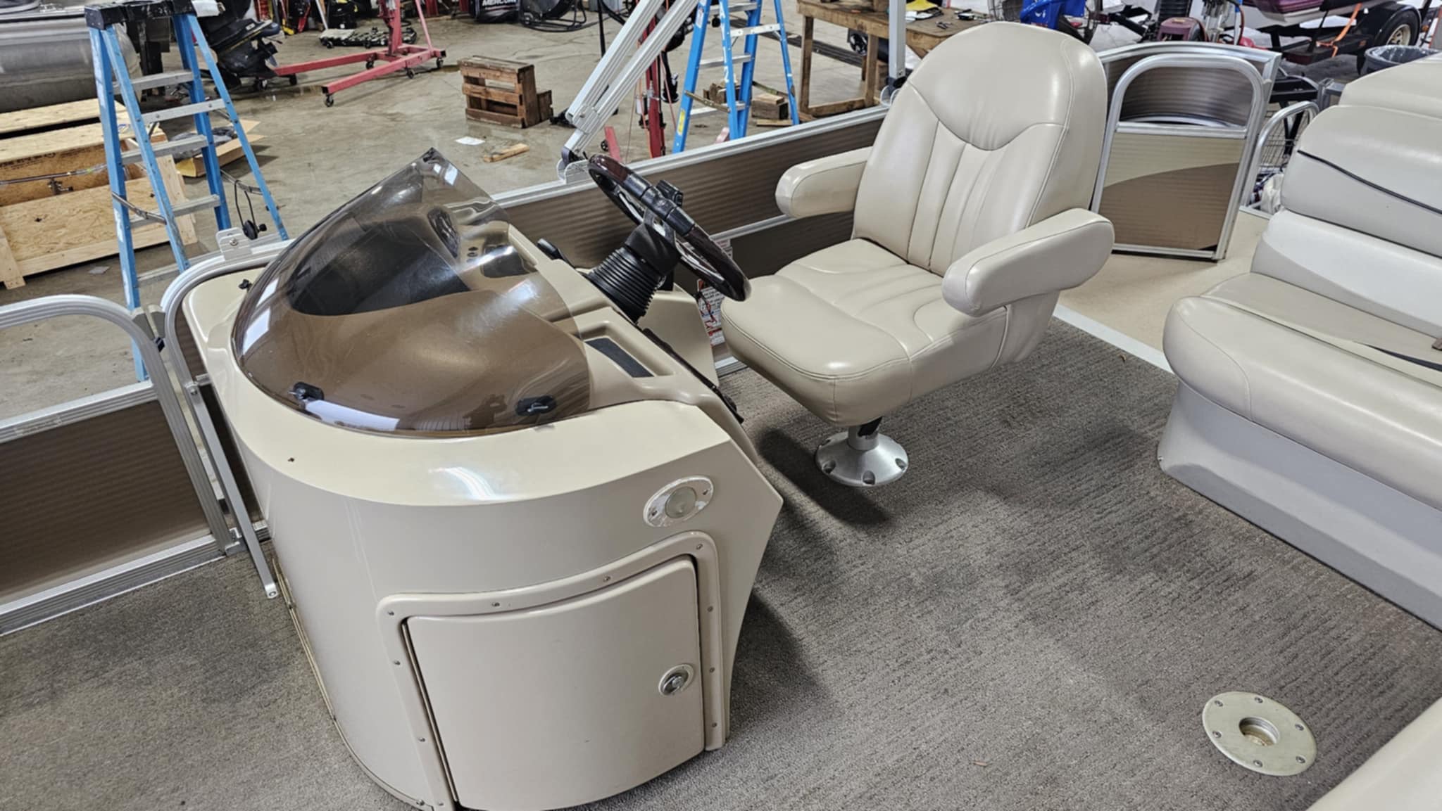 Boat has individual seat covers, full cover, bimini top, Sony stereo with speakers, rear swim ladder, docking lights, fish finder at console and more!