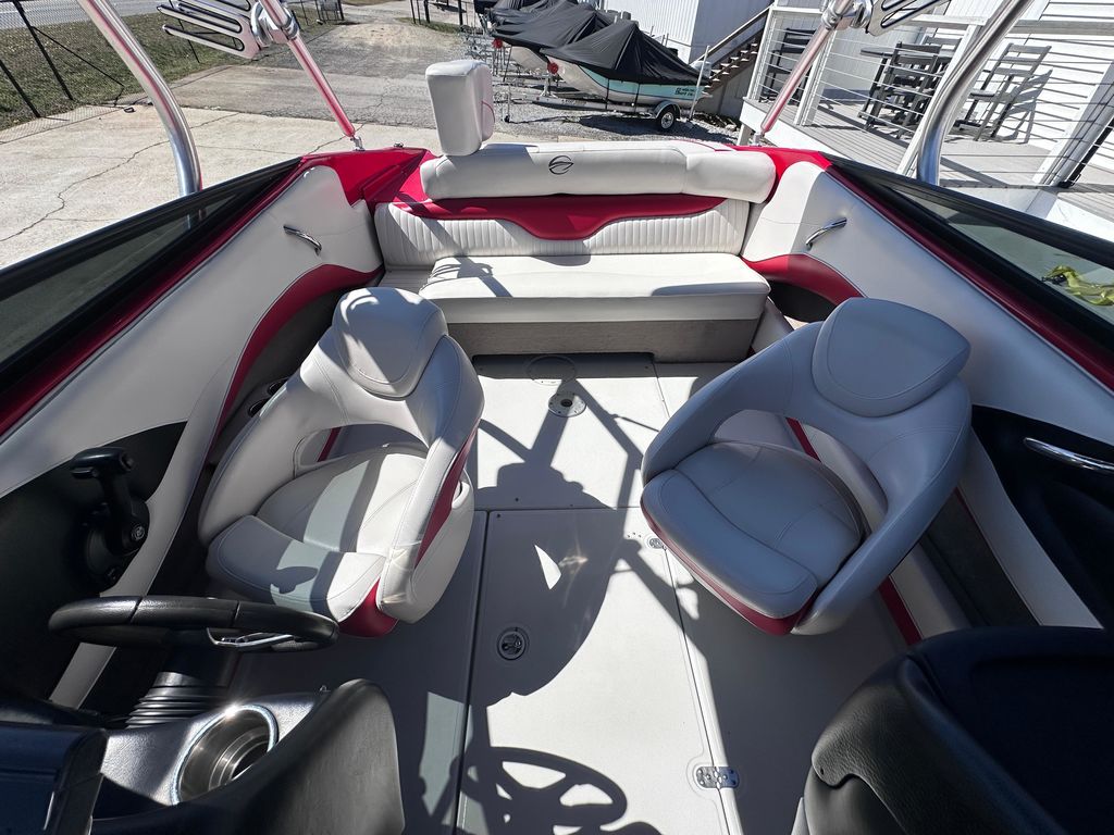 A dynamic silhouette of sporty, yet elegant style lines are perfectly accentuated by the lustrous double hull band gelcoat design of the Eclipse E 235. The look is further enhanced by Crownline’s patented F.A.S.T. Tab® hull design, adding a sexy edge while improving performance by providing enhanced planing efficiency, stability in high speed turns and improving fuel economy by minimizing drag. This beauty performs like a bowrider, but has added space and readily available amenities throughout. The party starts at the rear of the boat with Crownline’s trademarked Social Swim™ transom design with two Wetsounds speakers. There are six additional Wetsounds speakers throughout the boat. There’s also a handy handheld shower at the transom to rinse off after swimming. The comfortable aft sun lounge seat is electric, with a dual actuator allowing you to vary your position as desired.