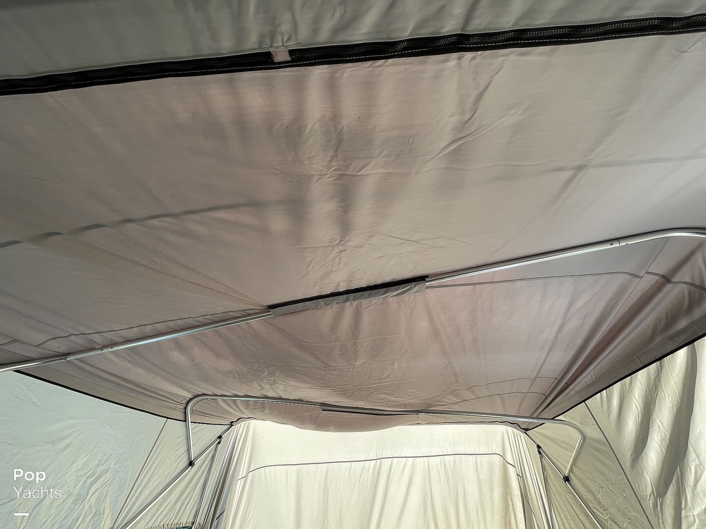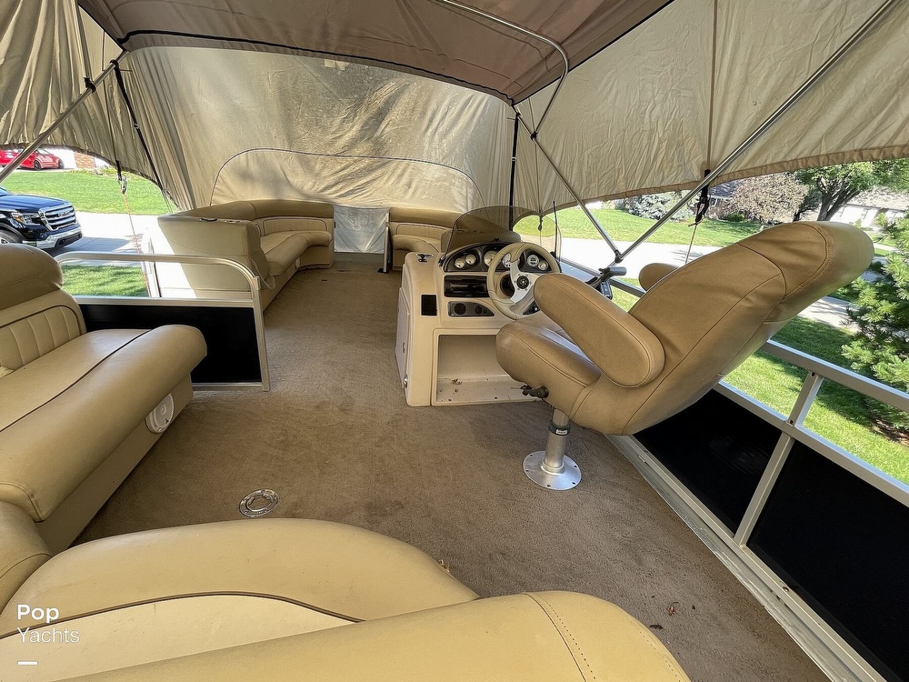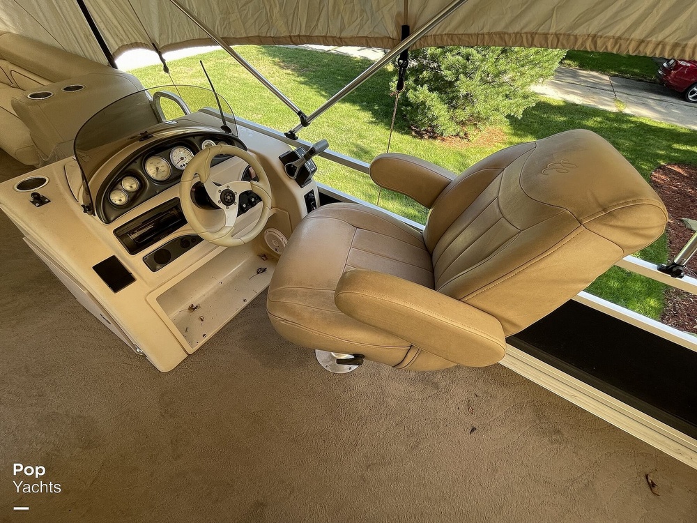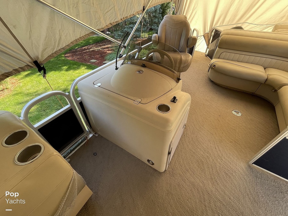The helm features gauges to monitor the boat, a depth gauge, a stereo head unit, a 12-volt plug, and a beverage holder. There is also a windscreen, storage locker in the helm, and a glovebox atop the helm station.