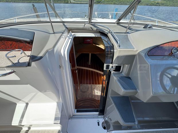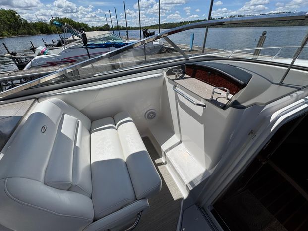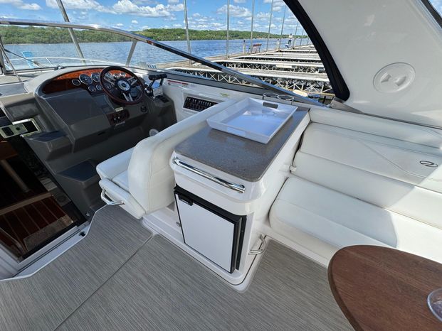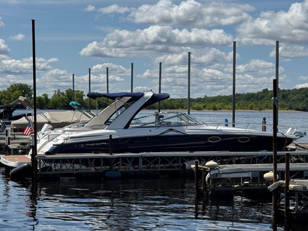This is the big one for those who favor pursuing their pleasures in the lap of luxury at 55 mph. Think of it as combining deep-V high performance with a penthouse (ocean view, of course). The penthouse part includes a cherry wood dining table that converts to a double bed, a fully enclosed head, hanging locker, large skylight with hatch and ample storage for long weekend escapes. For maximum entertaining flexibility, cockpits can be configured to suit individual needs. Forty square feet of convertible sun lounge area and the weatherproof six-speaker, 100-watt marine stereo system is all part of a huge list of features and equipment that you'll find standard only on the Regal 3350.