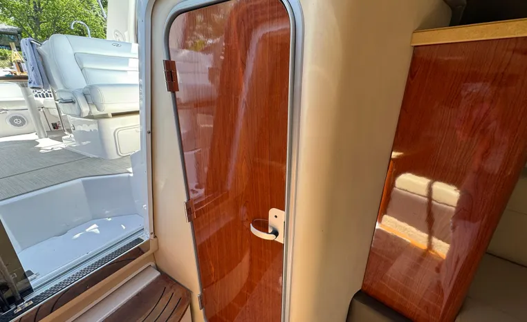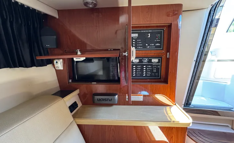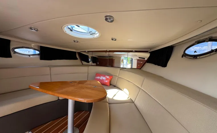 This is the big one for those who favor pursuing their pleasures in the lap of luxury at 55 mph. Think of it as combining deep-V high performance with a penthouse (ocean view, of course). The penthouse part includes a cherry wood dining table that converts to a double bed, a fully enclosed head, hanging locker, large skylight with hatch and ample storage for long weekend escapes. For maximum entertaining flexibility, cockpits can be configured to suit individual needs. Forty square feet of convertible sun lounge area and the weatherproof six-speaker, 100-watt marine stereo system is all part of a huge list of features and equipment that you'll find standard only on the Regal 3350.