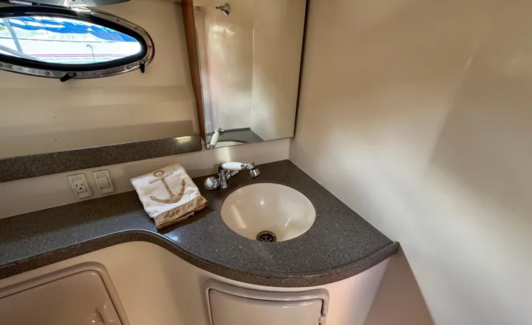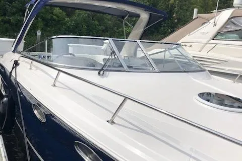 This is the big one for those who favor pursuing their pleasures in the lap of luxury at 55 mph. Think of it as combining deep-V high performance with a penthouse (ocean view, of course). The penthouse part includes a cherry wood dining table that converts to a double bed, a fully enclosed head, hanging locker, large skylight with hatch and ample storage for long weekend escapes. For maximum entertaining flexibility, cockpits can be configured to suit individual needs. Forty square feet of convertible sun lounge area and the weatherproof six-speaker, 100-watt marine stereo system is all part of a huge list of features and equipment that you'll find standard only on the Regal 3350.