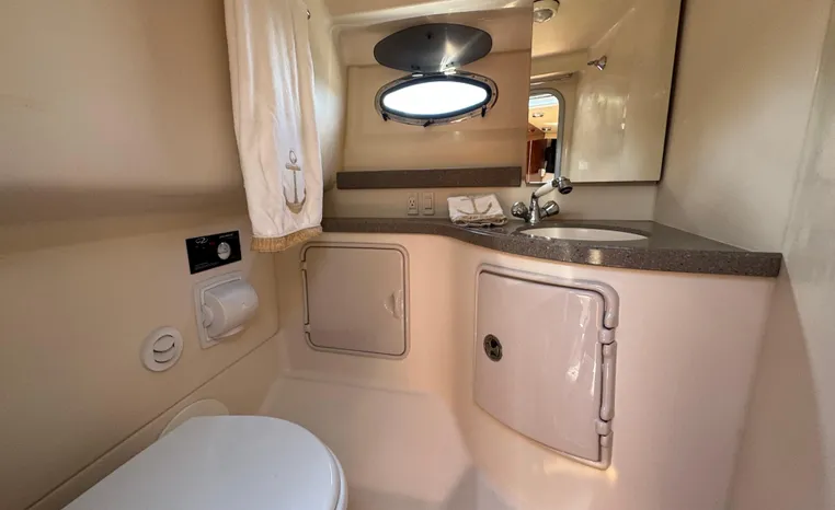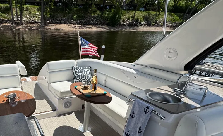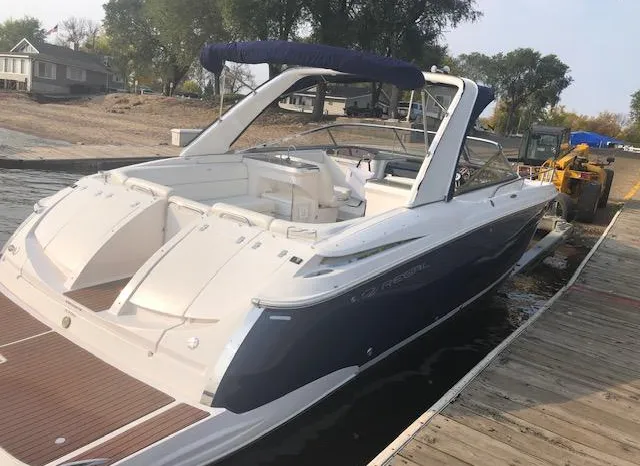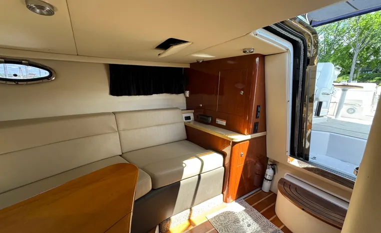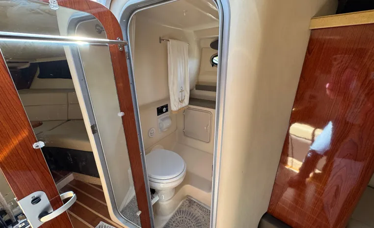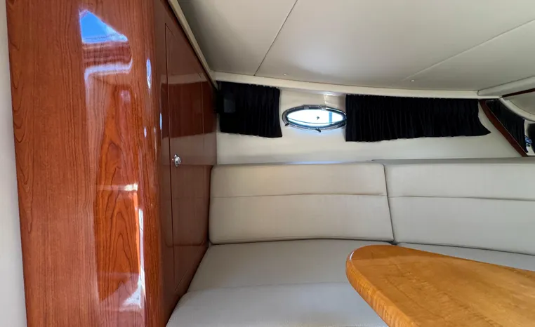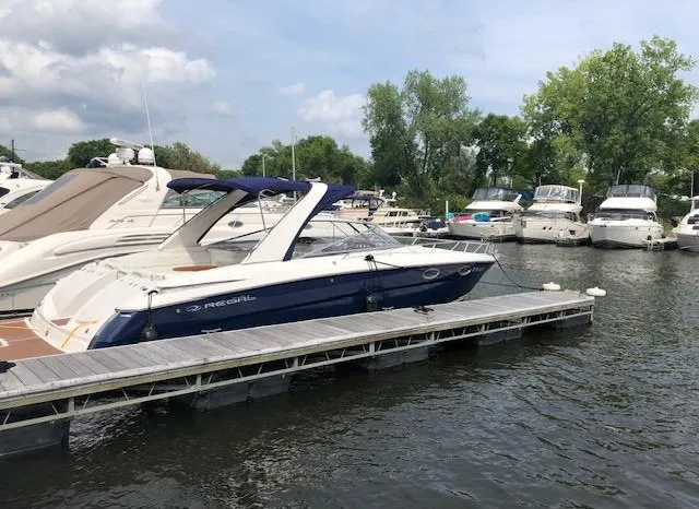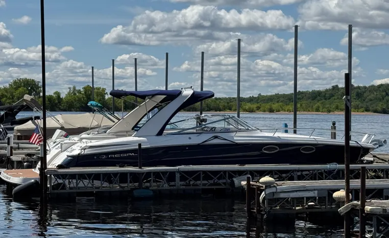 This is the big one for those who favor pursuing their pleasures in the lap of luxury at 55 mph. Think of it as combining deep-V high performance with a penthouse (ocean view, of course). The penthouse part includes a cherry wood dining table that converts to a double bed, a fully enclosed head, hanging locker, large skylight with hatch and ample storage for long weekend escapes. For maximum entertaining flexibility, cockpits can be configured to suit individual needs. Forty square feet of convertible sun lounge area and the weatherproof six-speaker, 100-watt marine stereo system is all part of a huge list of features and equipment that you'll find standard only on the Regal 3350.