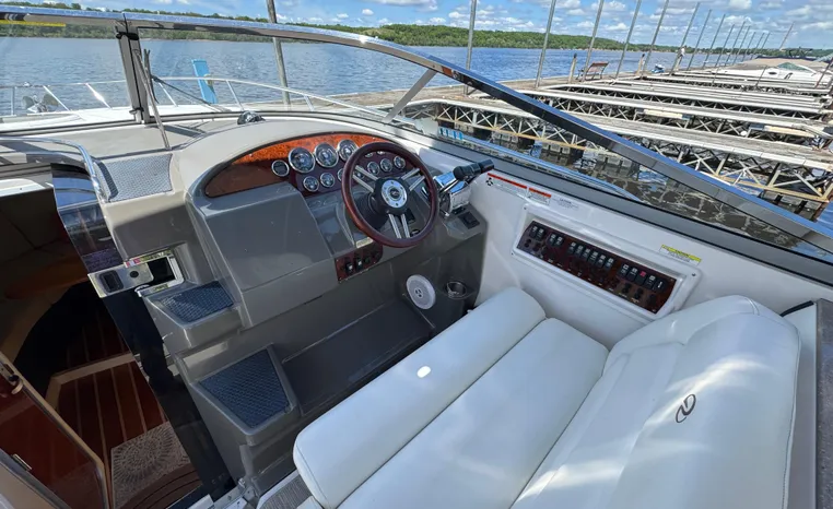 This is the big one for those who favor pursuing their pleasures in the lap of luxury at 55 mph. Think of it as combining deep-V high performance with a penthouse (ocean view, of course). The penthouse part includes a cherry wood dining table that converts to a double bed, a fully enclosed head, hanging locker, large skylight with hatch and ample storage for long weekend escapes. For maximum entertaining flexibility, cockpits can be configured to suit individual needs. Forty square feet of convertible sun lounge area and the weatherproof six-speaker, 100-watt marine stereo system is all part of a huge list of features and equipment that you'll find standard only on the Regal 3350.