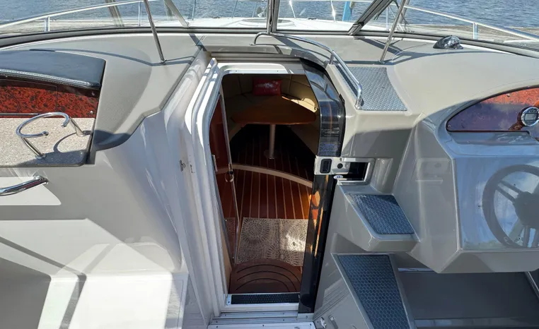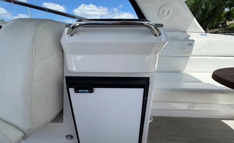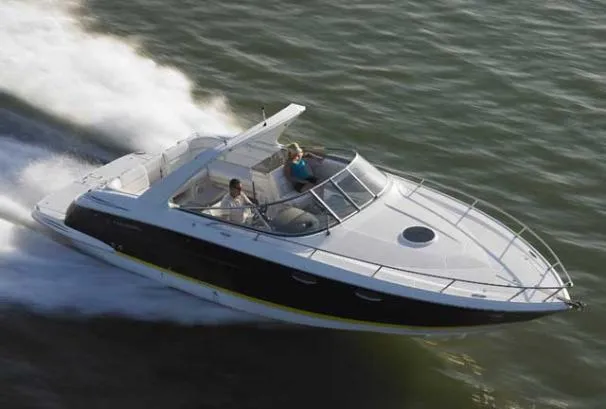 This is the big one for those who favor pursuing their pleasures in the lap of luxury at 55 mph. Think of it as combining deep-V high performance with a penthouse (ocean view, of course). The penthouse part includes a cherry wood dining table that converts to a double bed, a fully enclosed head, hanging locker, large skylight with hatch and ample storage for long weekend escapes. For maximum entertaining flexibility, cockpits can be configured to suit individual needs. Forty square feet of convertible sun lounge area and the weatherproof six-speaker, 100-watt marine stereo system is all part of a huge list of features and equipment that you'll find standard only on the Regal 3350.