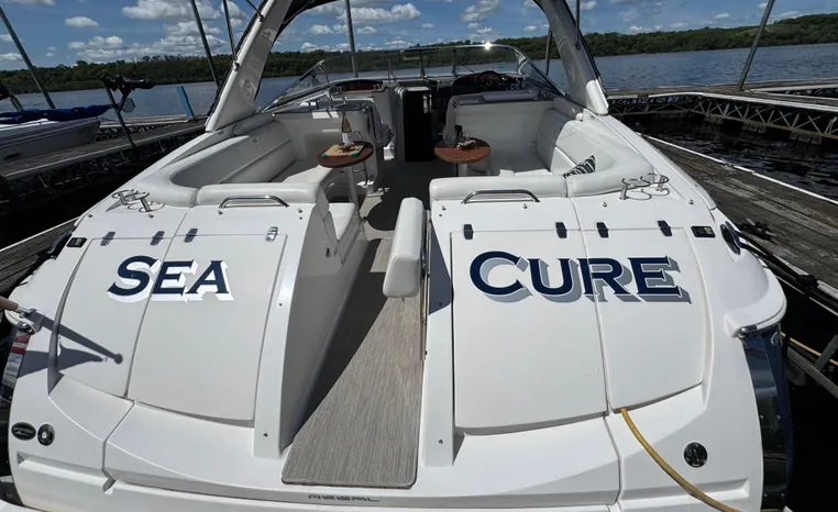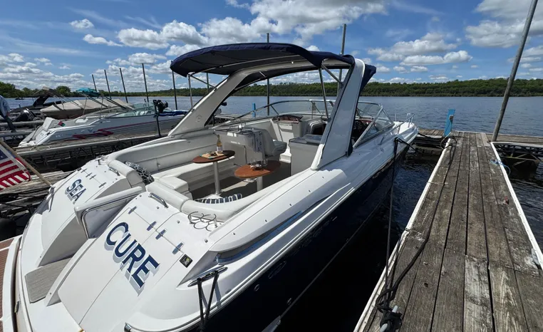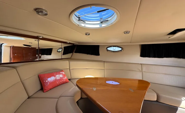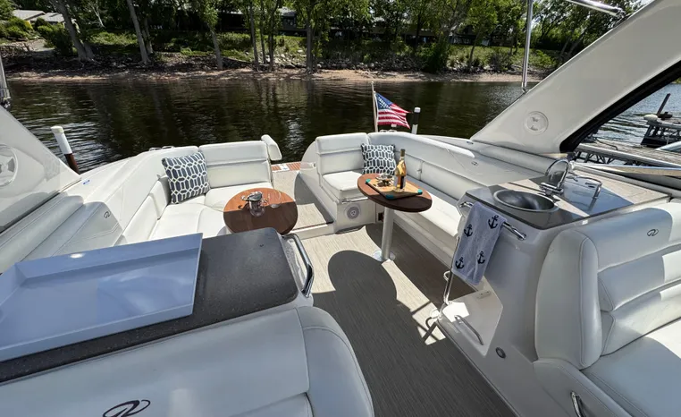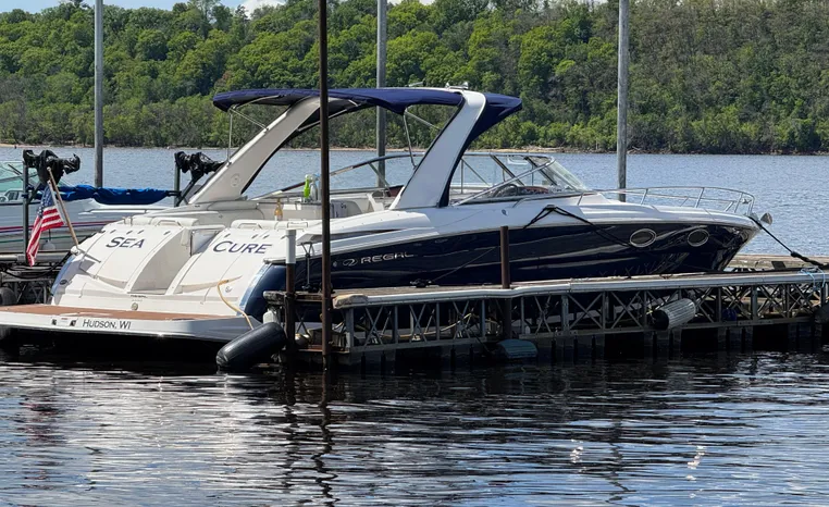 This is the big one for those who favor pursuing their pleasures in the lap of luxury at 55 mph. Think of it as combining deep-V high performance with a penthouse (ocean view, of course). The penthouse part includes a cherry wood dining table that converts to a double bed, a fully enclosed head, hanging locker, large skylight with hatch and ample storage for long weekend escapes. For maximum entertaining flexibility, cockpits can be configured to suit individual needs. Forty square feet of convertible sun lounge area and the weatherproof six-speaker, 100-watt marine stereo system is all part of a huge list of features and equipment that you'll find standard only on the Regal 3350.