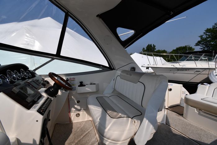 Freshwater / Great Lakes boat since new this vessel features Twin MerCruiser 350-MAG 300-hp Gas Engine's with DTS Bravo III Stenrdrives (w/Joy-Stick Piloting) with 504 hours. Notable features include but are not limited to the following: 2021 Tandem-Axle Trailer, Air-Conditioning & Heat, Head (Vacuflush) w/Vanity/Sink/Shower, Raymarine A70D (Color) GPS w/Chartplotter, Sony Premium Sound System w/Helm-Mounted Control & iPod/MP3-Connection, Cockpit Wet Bar w/Sink/Refrigerator - Note Built-in Cooler Storage, Power Engine Hatch Lift, and MUCH more!