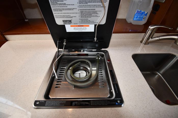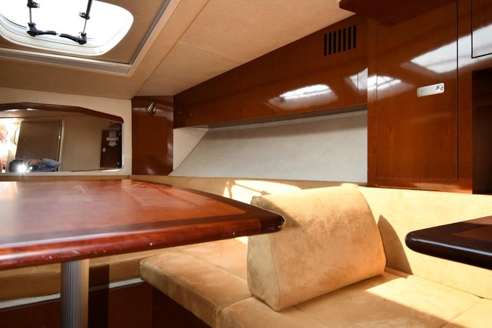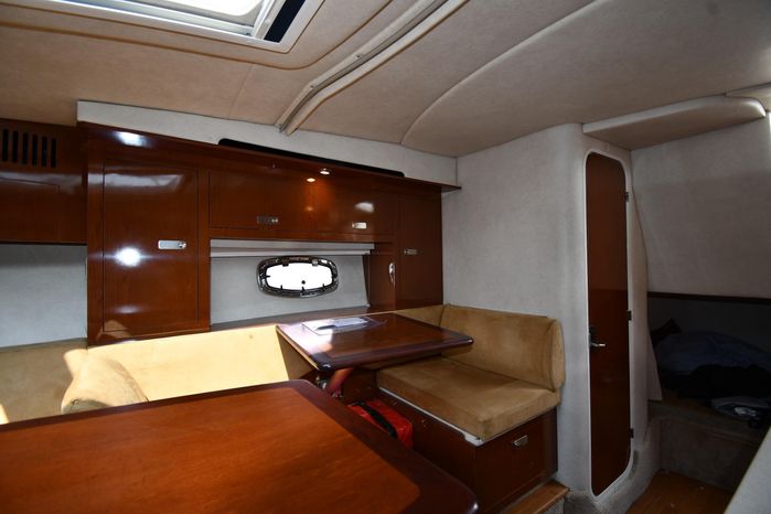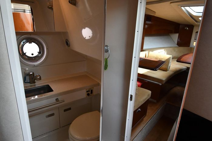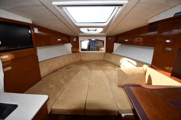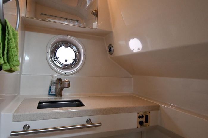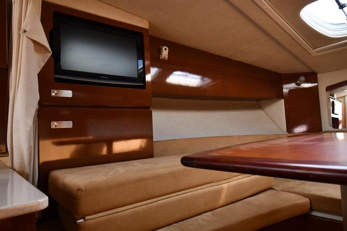 Few segments of the American boating industry are as competitive as the market for midsize, 30-something express cruisers. This is the sweet spot for many boaters, the intersection of size andvalue where several manufacturers slug it out for valuable market share. The Sea Ray 310 Sundancer—latest in a series of 310 Sundancer models reaching back to 1990—combines leading-edge styling with the luxury one expects in a modern Sea Ray yacht. Like most of her Sundancer siblings, the 310 rides on a deep-V hull with moderate beam, cored hullsides, and a solid fiberglass bottom. Below decks, the mid-cabin accommodations are a rich blend of satin-finished cherry cabinets, hardwood flooring, leather upholstery, and designer galley appliances. Privacy curtains separate the sleeping areas from the main salon, and a 19" flat- screen TV can be viewed from anywhere in the cabin. Note that the 310 Sundancer’s modest 10-foot beam—slender compared with many express cruisers her size—dramatically improves handling, performance, and fuel-efficiency. Cruise at 25 knots (high 30s top) with twin 260hp Mercury Bravo III drives.