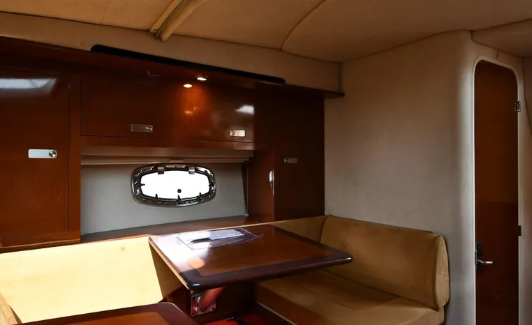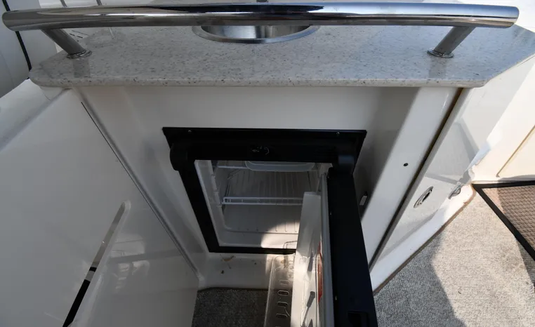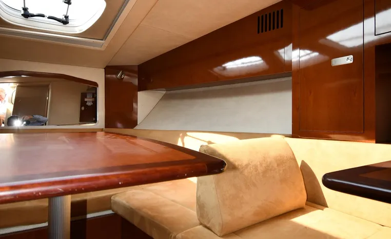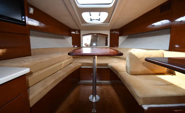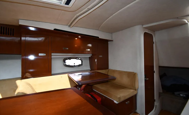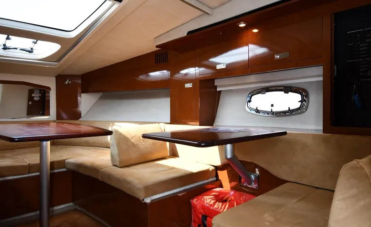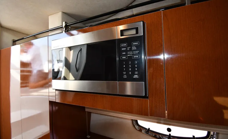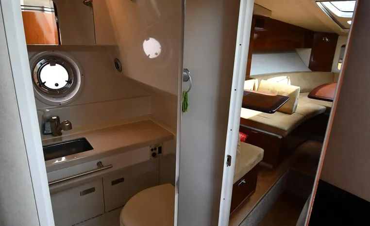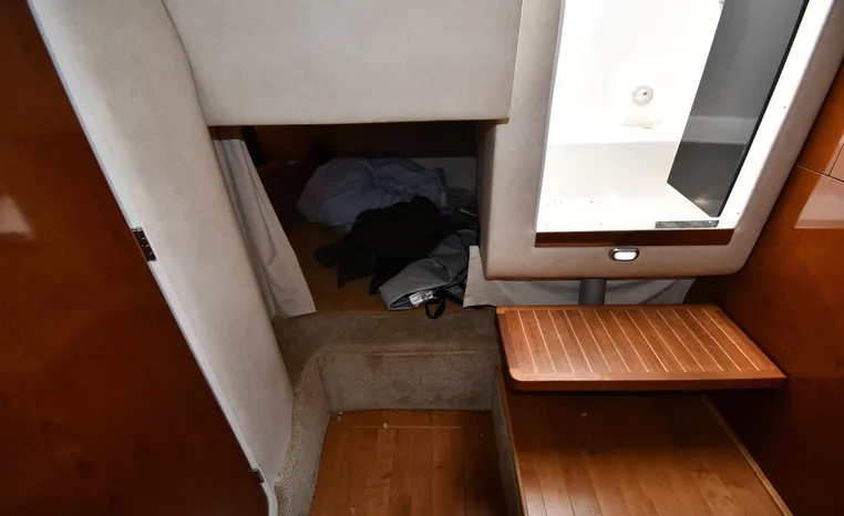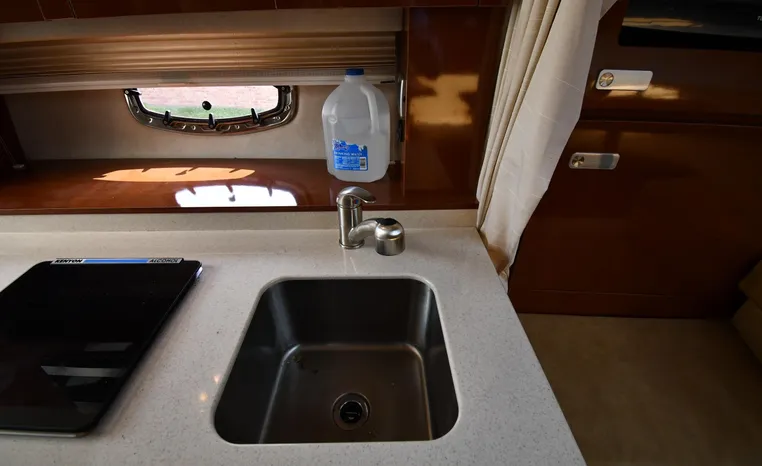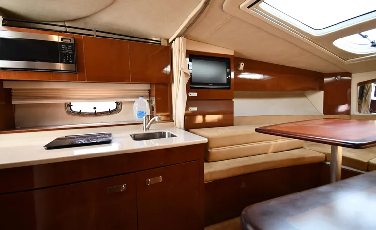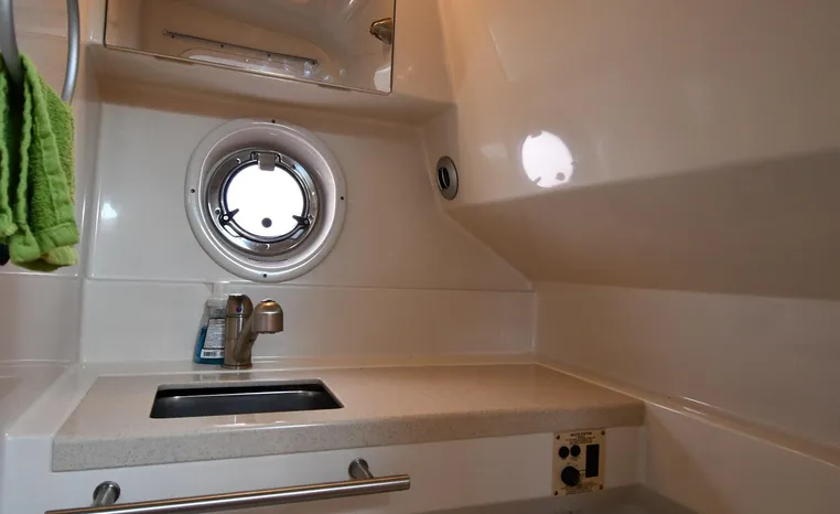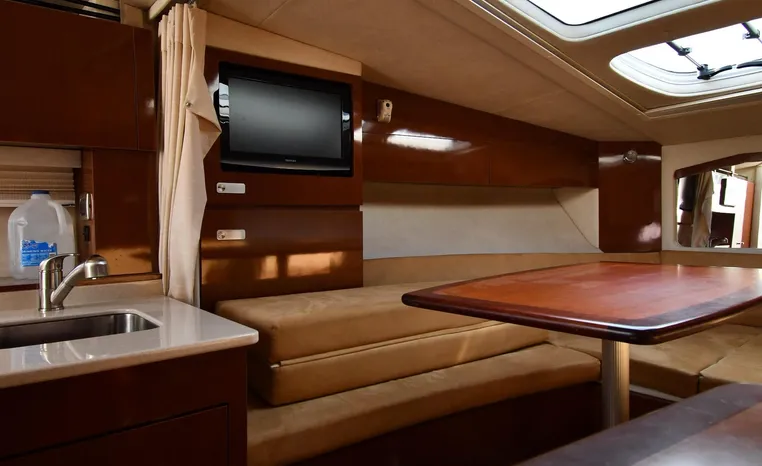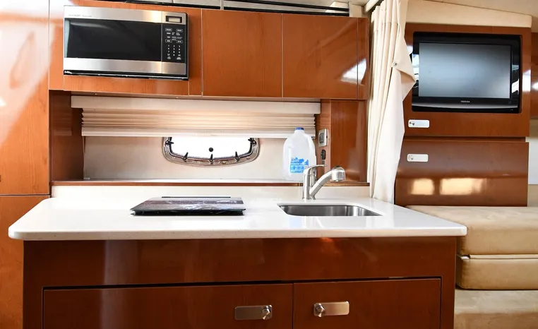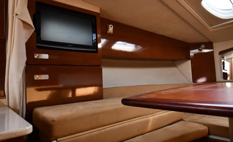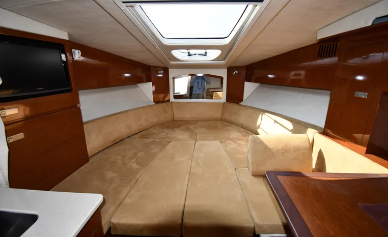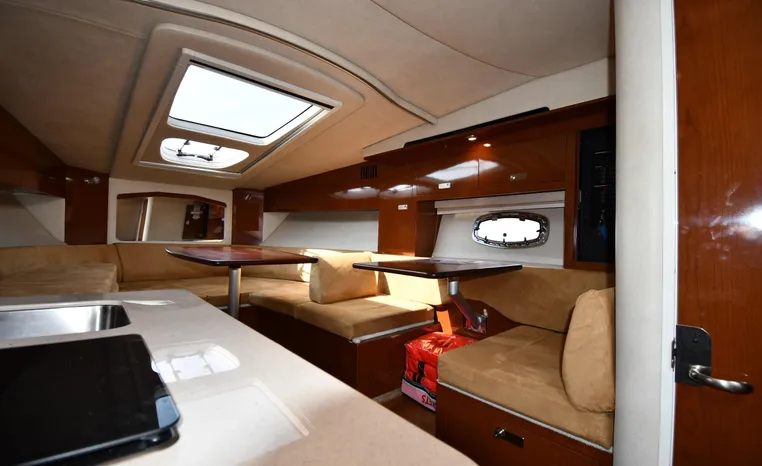 Few segments of the American boating industry are as competitive as the market for midsize, 30-something express cruisers. This is the sweet spot for many boaters, the intersection of size andvalue where several manufacturers slug it out for valuable market share. The Sea Ray 310 Sundancer—latest in a series of 310 Sundancer models reaching back to 1990—combines leading-edge styling with the luxury one expects in a modern Sea Ray yacht. Like most of her Sundancer siblings, the 310 rides on a deep-V hull with moderate beam, cored hullsides, and a solid fiberglass bottom. Below decks, the mid-cabin accommodations are a rich blend of satin-finished cherry cabinets, hardwood flooring, leather upholstery, and designer galley appliances. Privacy curtains separate the sleeping areas from the main salon, and a 19" flat- screen TV can be viewed from anywhere in the cabin. Note that the 310 Sundancer’s modest 10-foot beam—slender compared with many express cruisers her size—dramatically improves handling, performance, and fuel-efficiency. Cruise at 25 knots (high 30s top) with twin 260hp Mercury Bravo III drives.