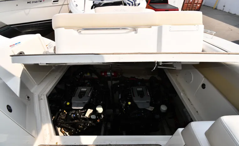 Freshwater / Great Lakes boat since new this vessel features Twin MerCruiser 350-MAG 300-hp Gas Engine's with DTS Bravo III Stenrdrives (w/Joy-Stick Piloting) with 504 hours. Notable features include but are not limited to the following: 2021 Tandem-Axle Trailer, Air-Conditioning & Heat, Head (Vacuflush) w/Vanity/Sink/Shower, Raymarine A70D (Color) GPS w/Chartplotter, Sony Premium Sound System w/Helm-Mounted Control & iPod/MP3-Connection, Cockpit Wet Bar w/Sink/Refrigerator - Note Built-in Cooler Storage, Power Engine Hatch Lift, and MUCH more!
