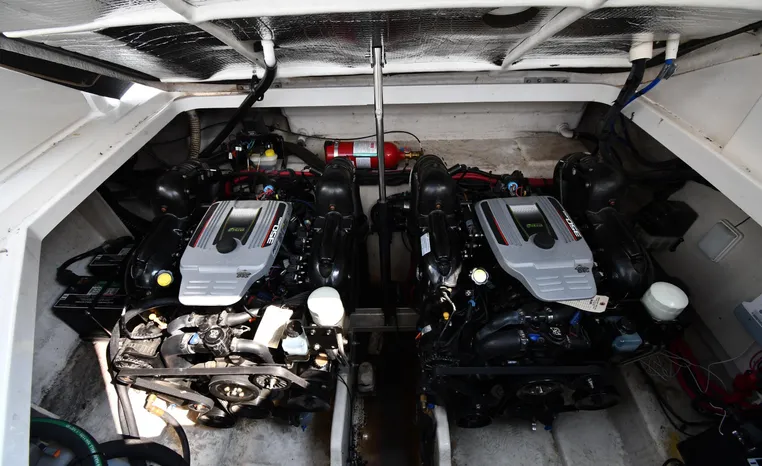 Freshwater / Great Lakes boat since new this vessel features Twin MerCruiser 350-MAG 300-hp Gas Engine's with DTS Bravo III Stenrdrives (w/Joy-Stick Piloting) with 504 hours. Notable features include but are not limited to the following: 2021 Tandem-Axle Trailer, Air-Conditioning & Heat, Head (Vacuflush) w/Vanity/Sink/Shower, Raymarine A70D (Color) GPS w/Chartplotter, Sony Premium Sound System w/Helm-Mounted Control & iPod/MP3-Connection, Cockpit Wet Bar w/Sink/Refrigerator - Note Built-in Cooler Storage, Power Engine Hatch Lift, and MUCH more!