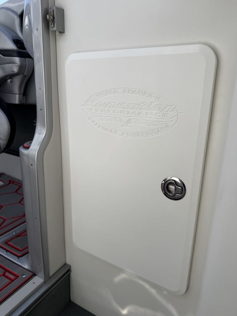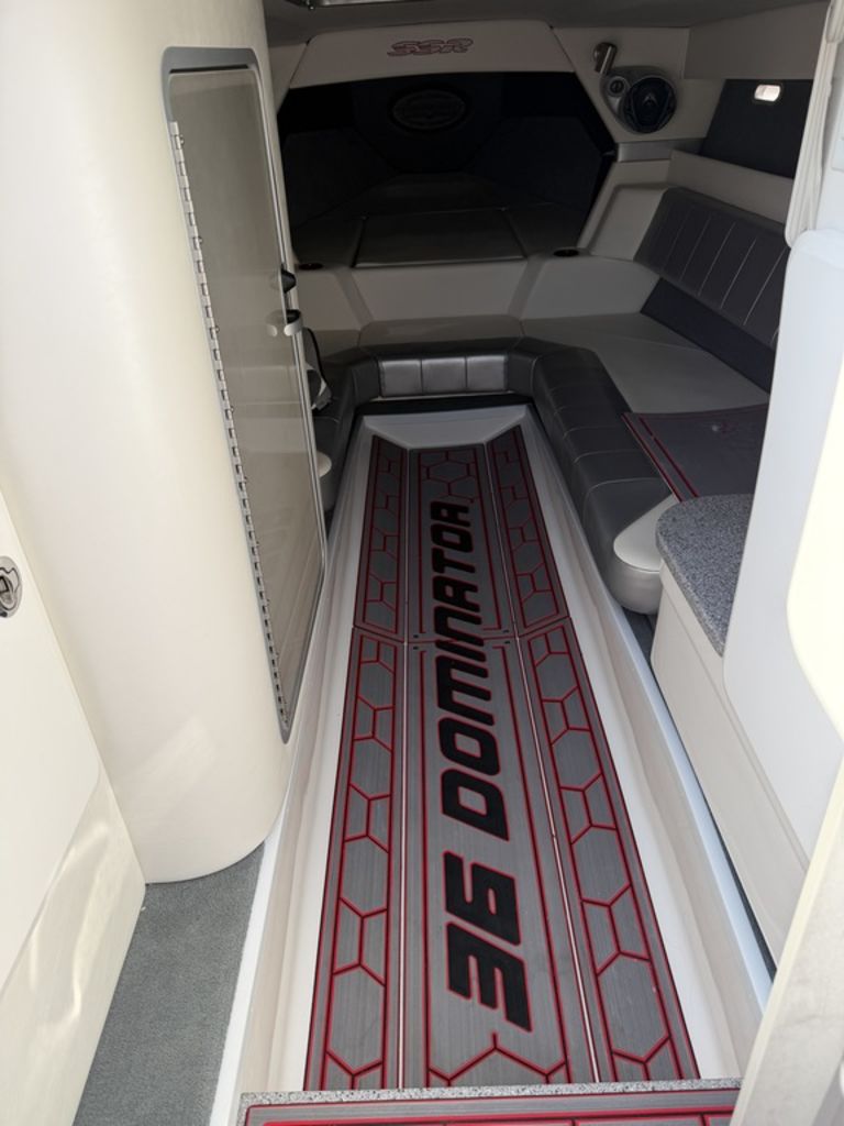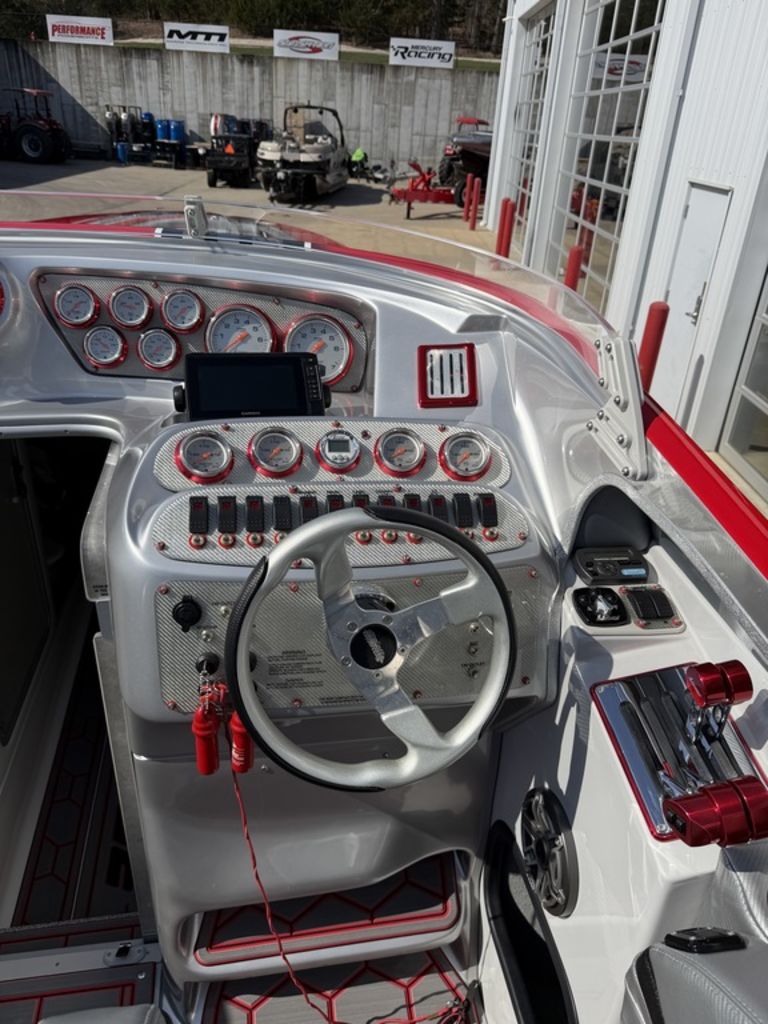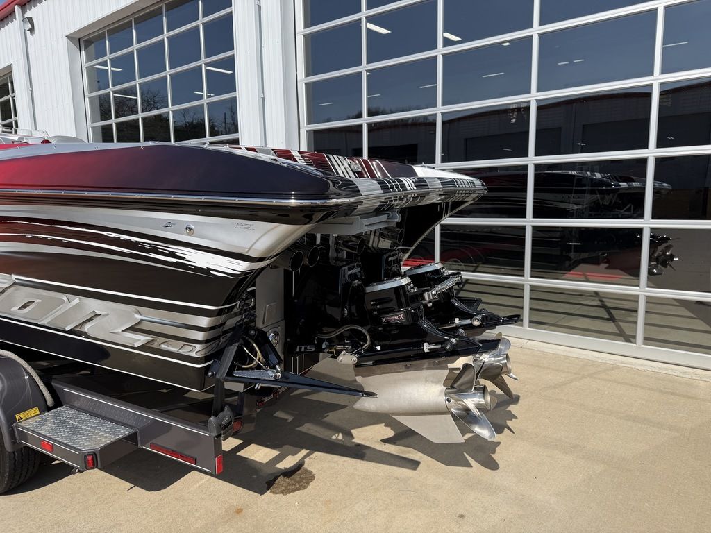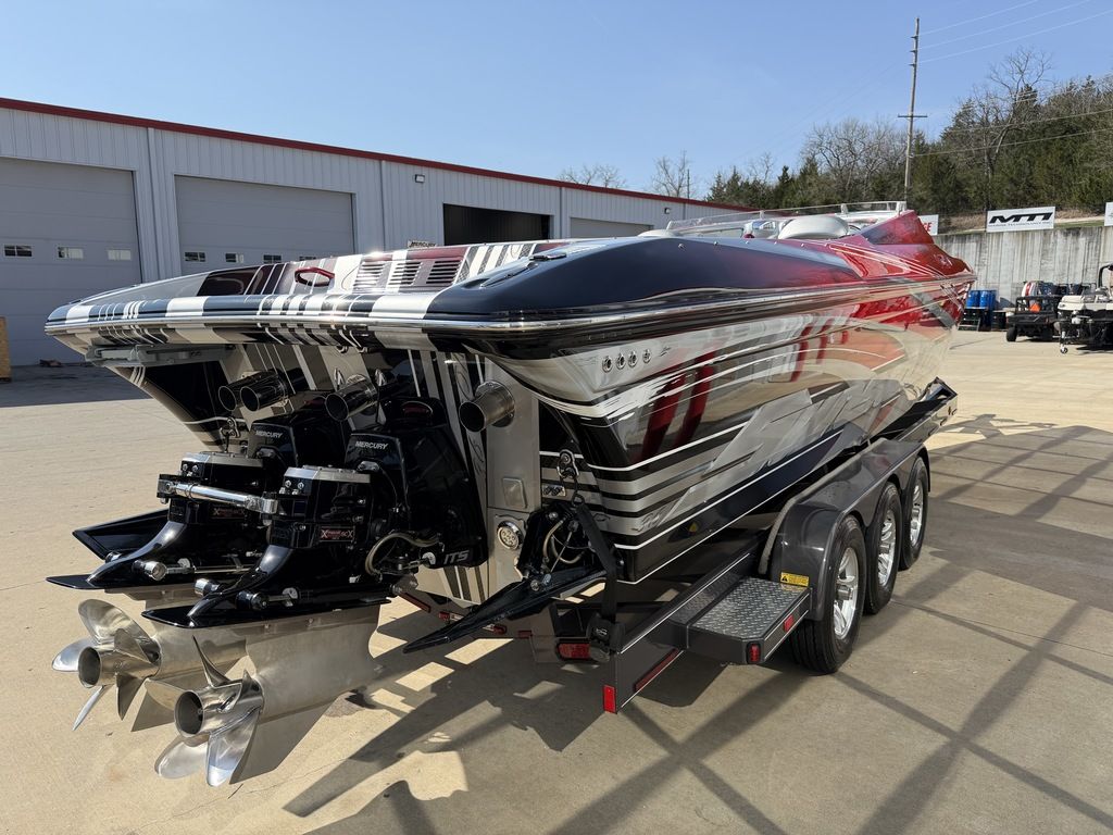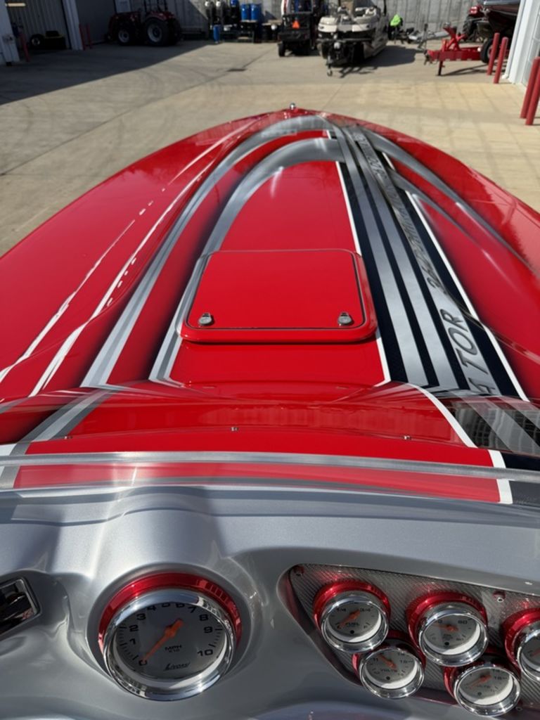 2011 Sunsation 36 Dominator SSR powered by Twin Mercury 525EFI with Whipple superchargers, IMCO SCX drives, Mitcher T custom paint, 380 kplanes, Mechanical indicators, Underwater lights, Livorsi Gauges, GPS speedometer, Garmin GPS, Fusion stereo with JL Audio components, Billet controls, Custom snap in sea deck flooring, McCloud electric bolsters, Rear passenger speedometers, Pump out porta potty, sink, Cabin A/C, 120volt outlet, Onboard charger, Cabin lounge area, Forward V berth, Custom hatch with etched Sunsation logo, Custom Mercury racing logos in bilge, Triple axle trailer included