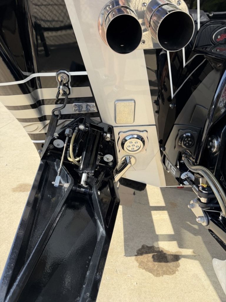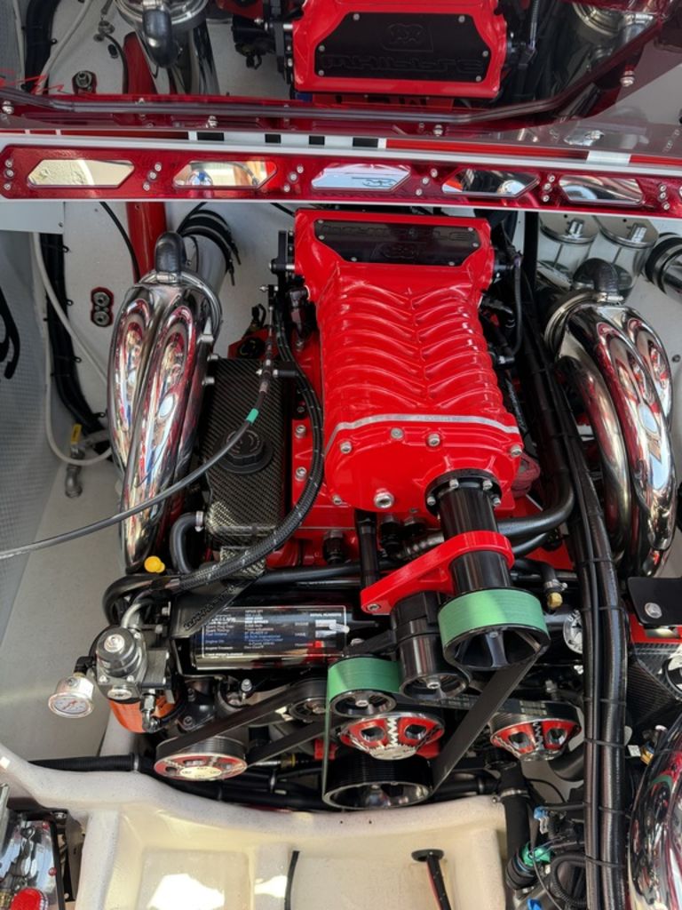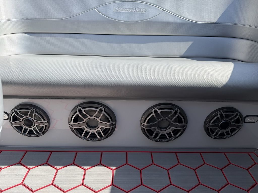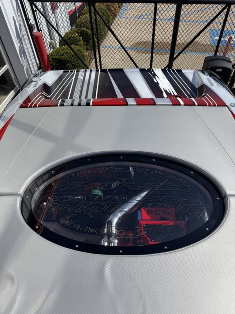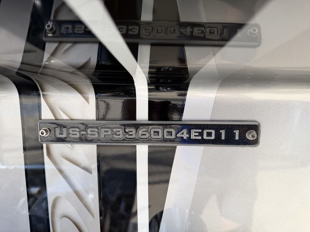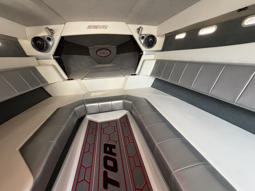 2011 Sunsation 36 Dominator SSR powered by Twin Mercury 525EFI with Whipple superchargers, IMCO SCX drives, Mitcher T custom paint, 380 kplanes, Mechanical indicators, Underwater lights, Livorsi Gauges, GPS speedometer, Garmin GPS, Fusion stereo with JL Audio components, Billet controls, Custom snap in sea deck flooring, McCloud electric bolsters, Rear passenger speedometers, Pump out porta potty, sink, Cabin A/C, 120volt outlet, Onboard charger, Cabin lounge area, Forward V berth, Custom hatch with etched Sunsation logo, Custom Mercury racing logos in bilge, Triple axle trailer included