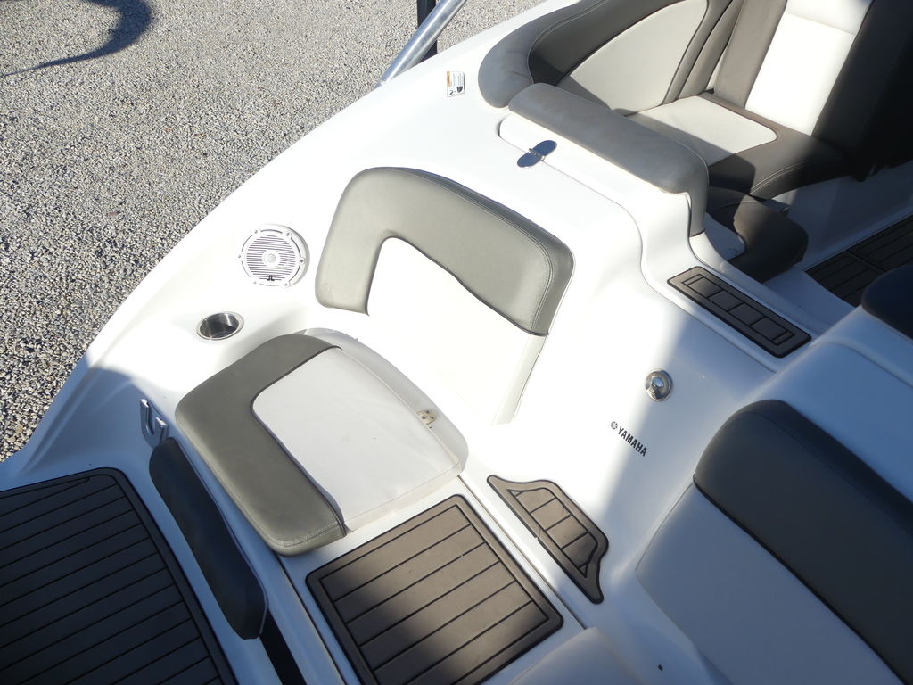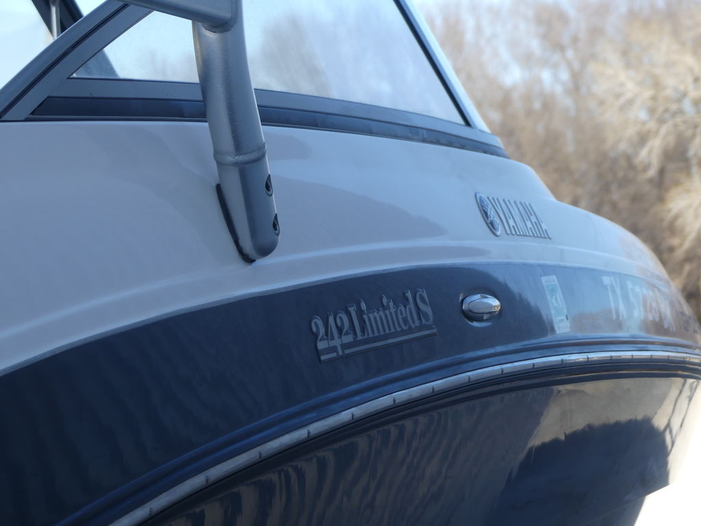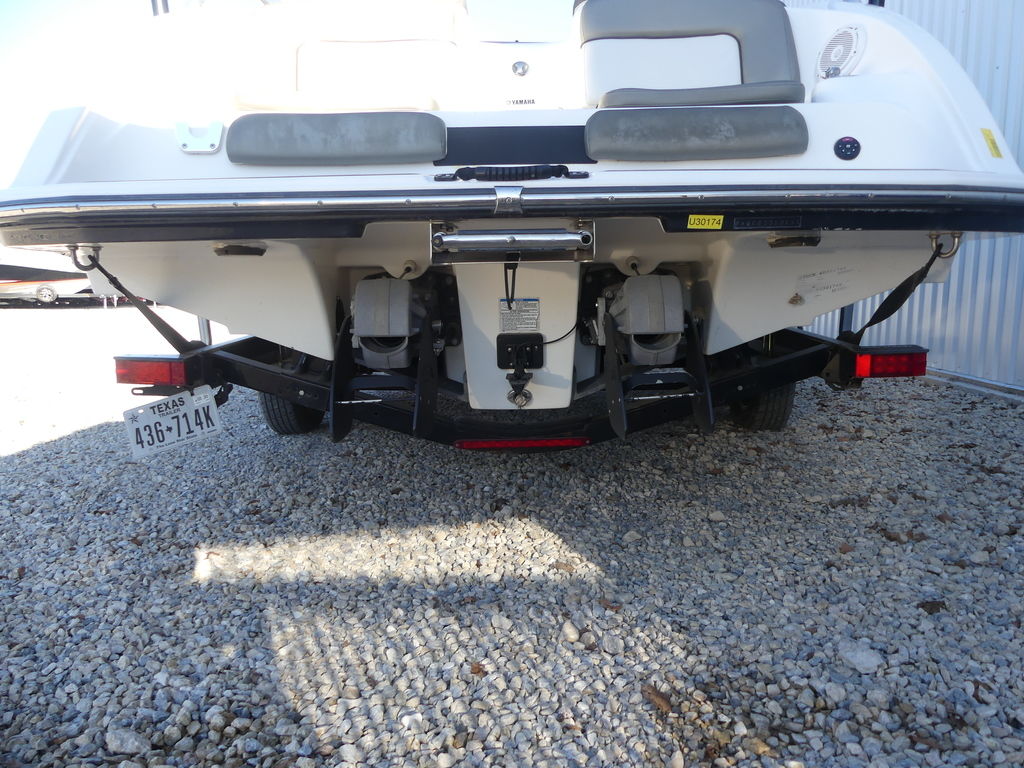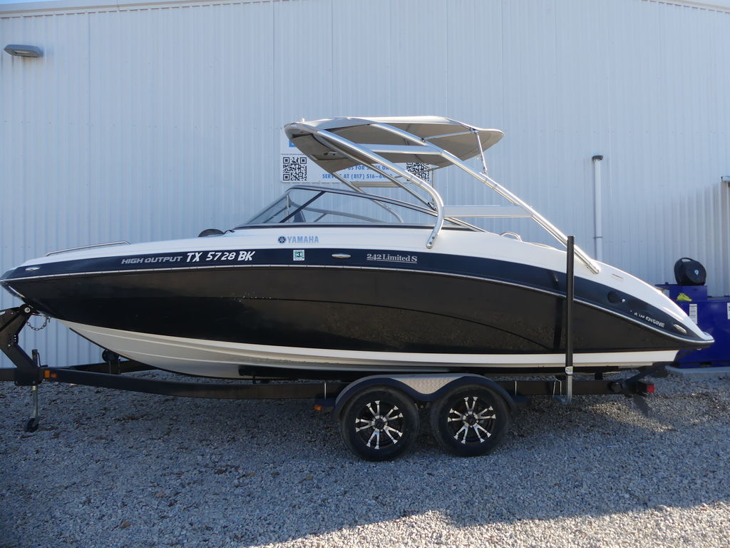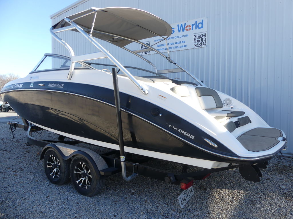 The 2011 Yamaha 242 Limited is a 24-foot jet boat featuring twin 1.8L High Output Yamaha marine engines, providing 360 horsepower for watersports and day cruising. It's designed for families and boasts a spacious, comfortable cockpit with ample seating, innovative rear-facing transom lounge seats, and a low, spacious swim platform. Key features include a jet-drive system with no exposed propellers, advanced helm technology with Cruise Assist and No Wake Mode™, a premium stereo system, integrated storage, and a watersports tower with lighting and speakers.