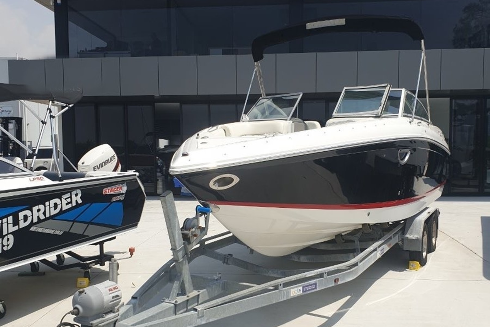 This 2012 Cobalt 242, used in freshwater and featuring a sleek black exterior with a red stripe, is a stunning option.
