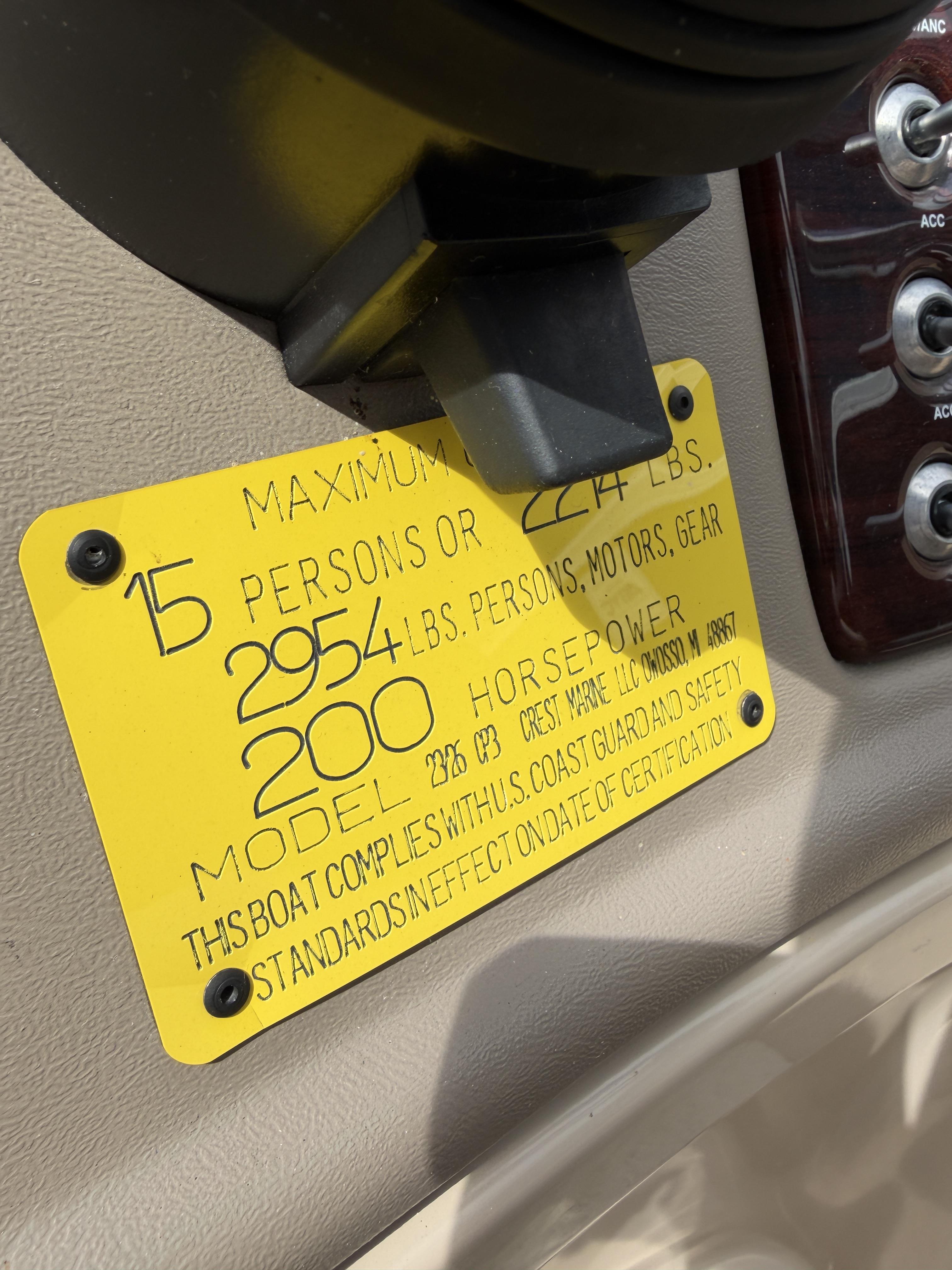 Max Carry Capacity: Standard: 14 persons; 2074 lb.; 3 Pontoon option: 15 persons; 2214 lb.