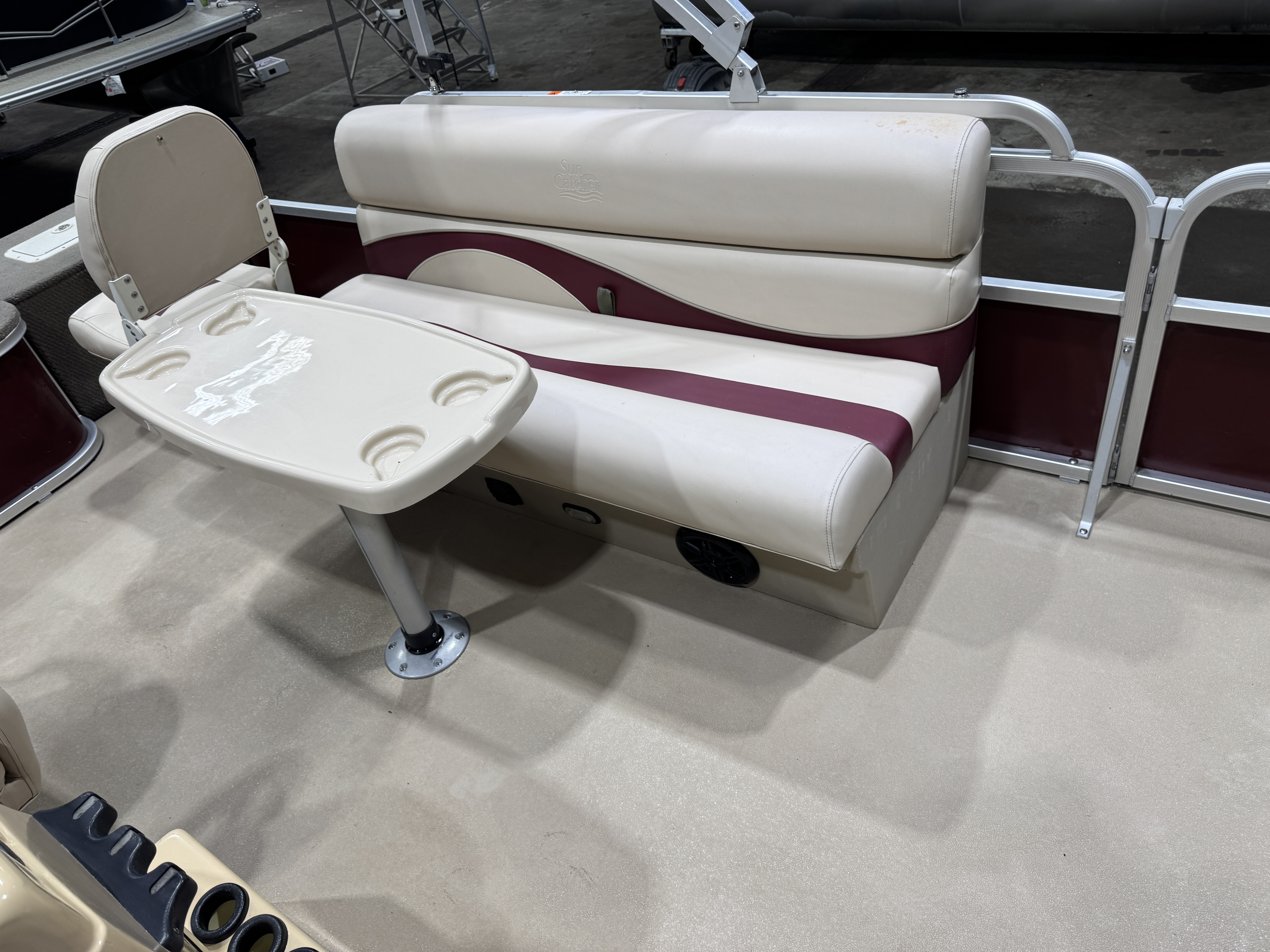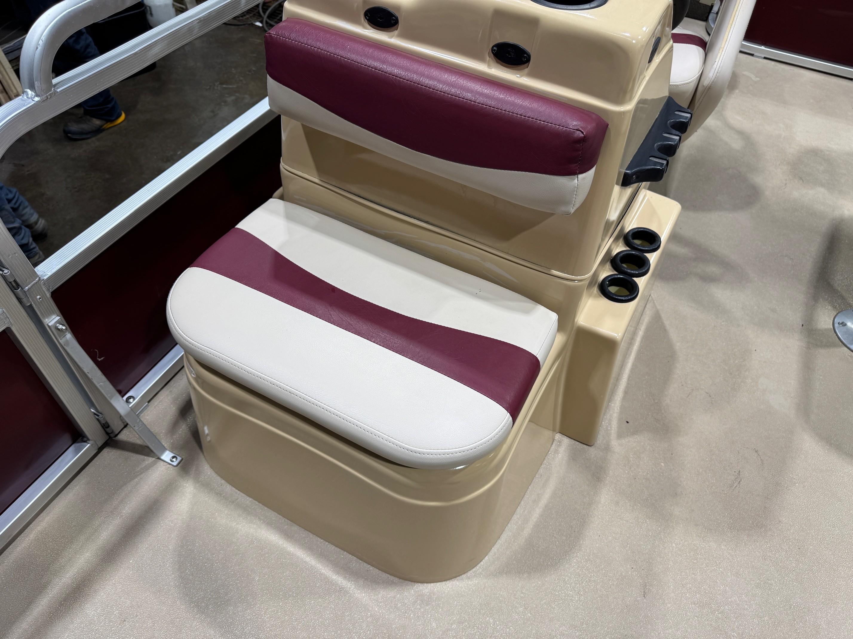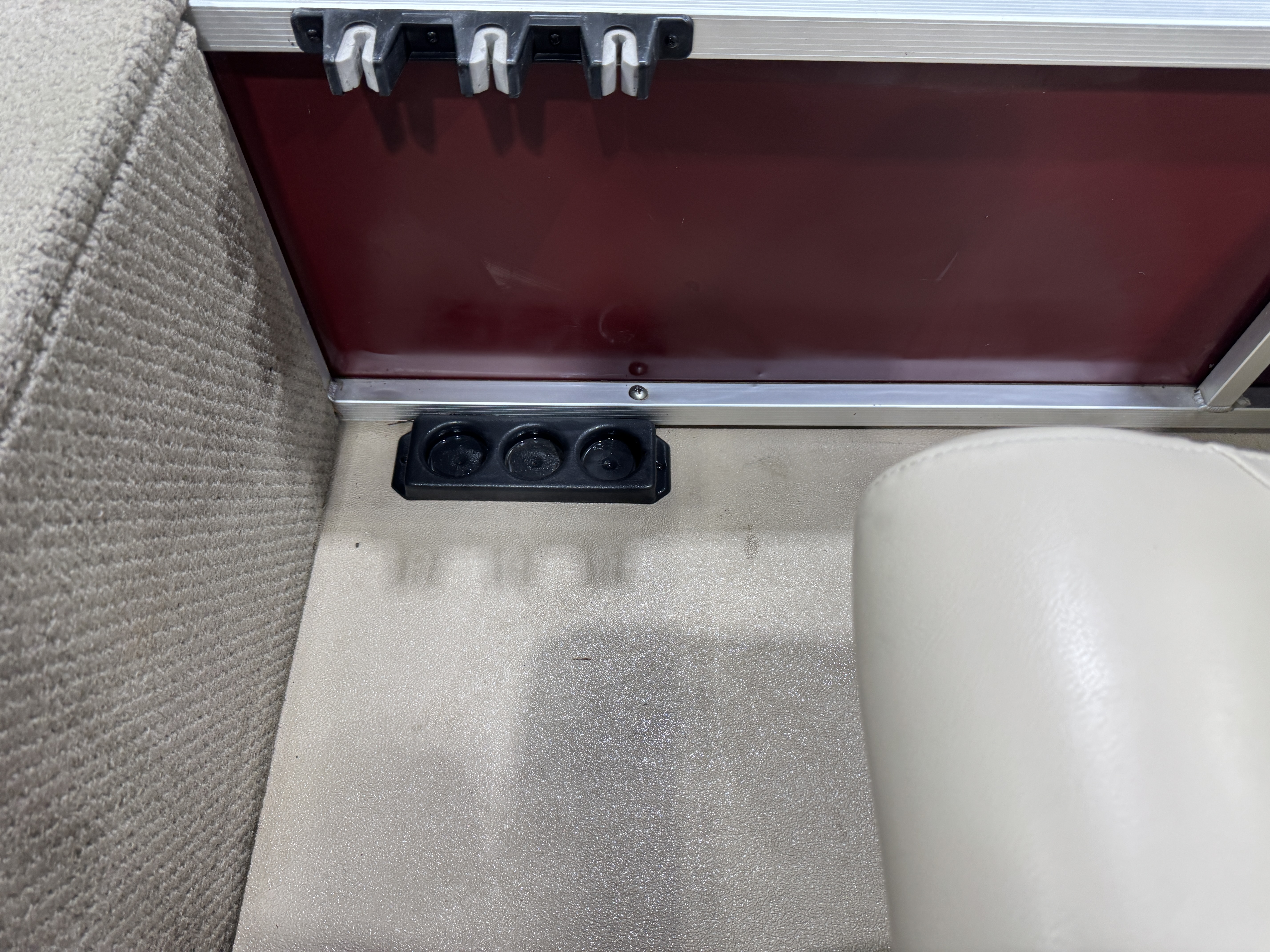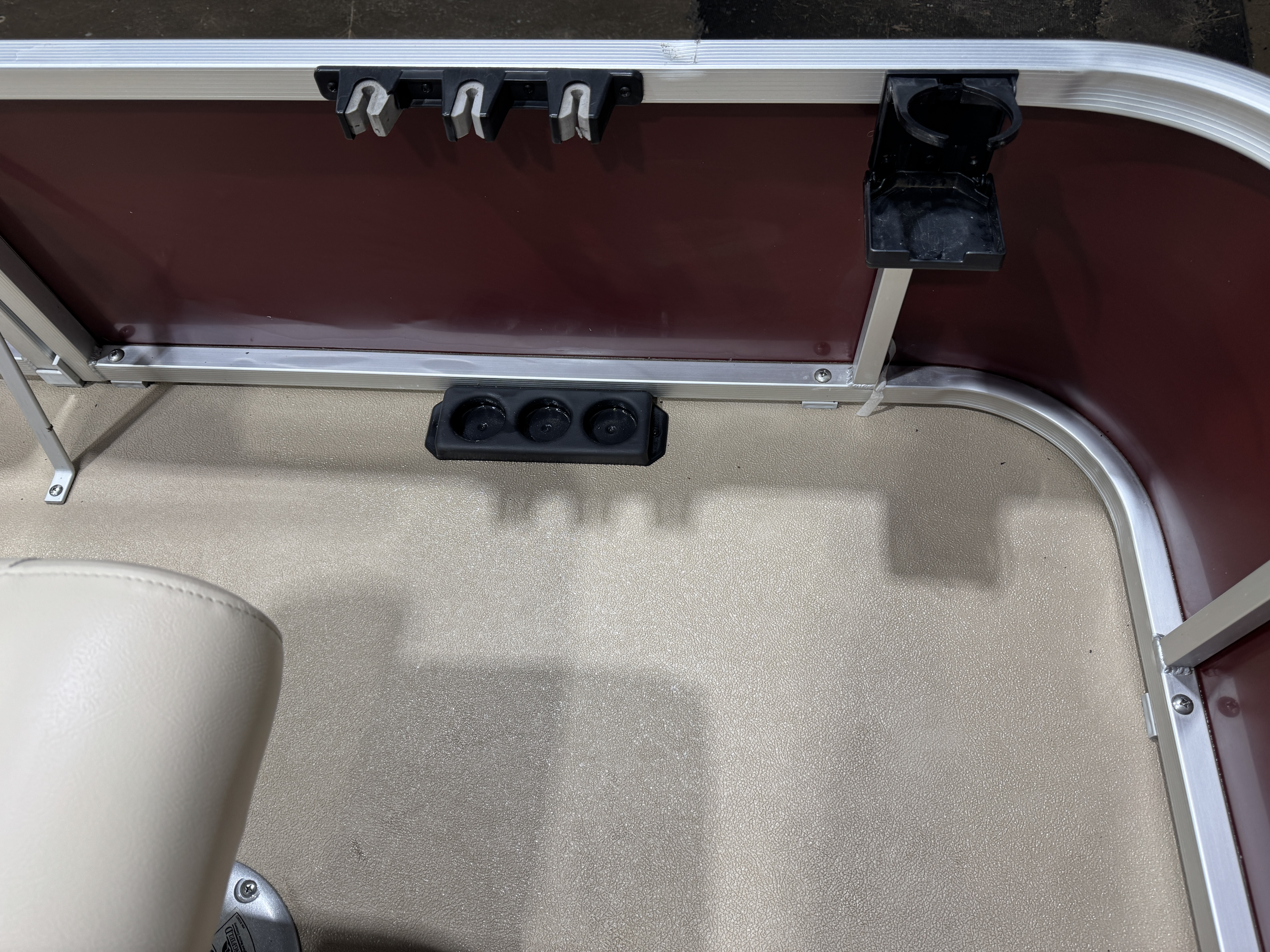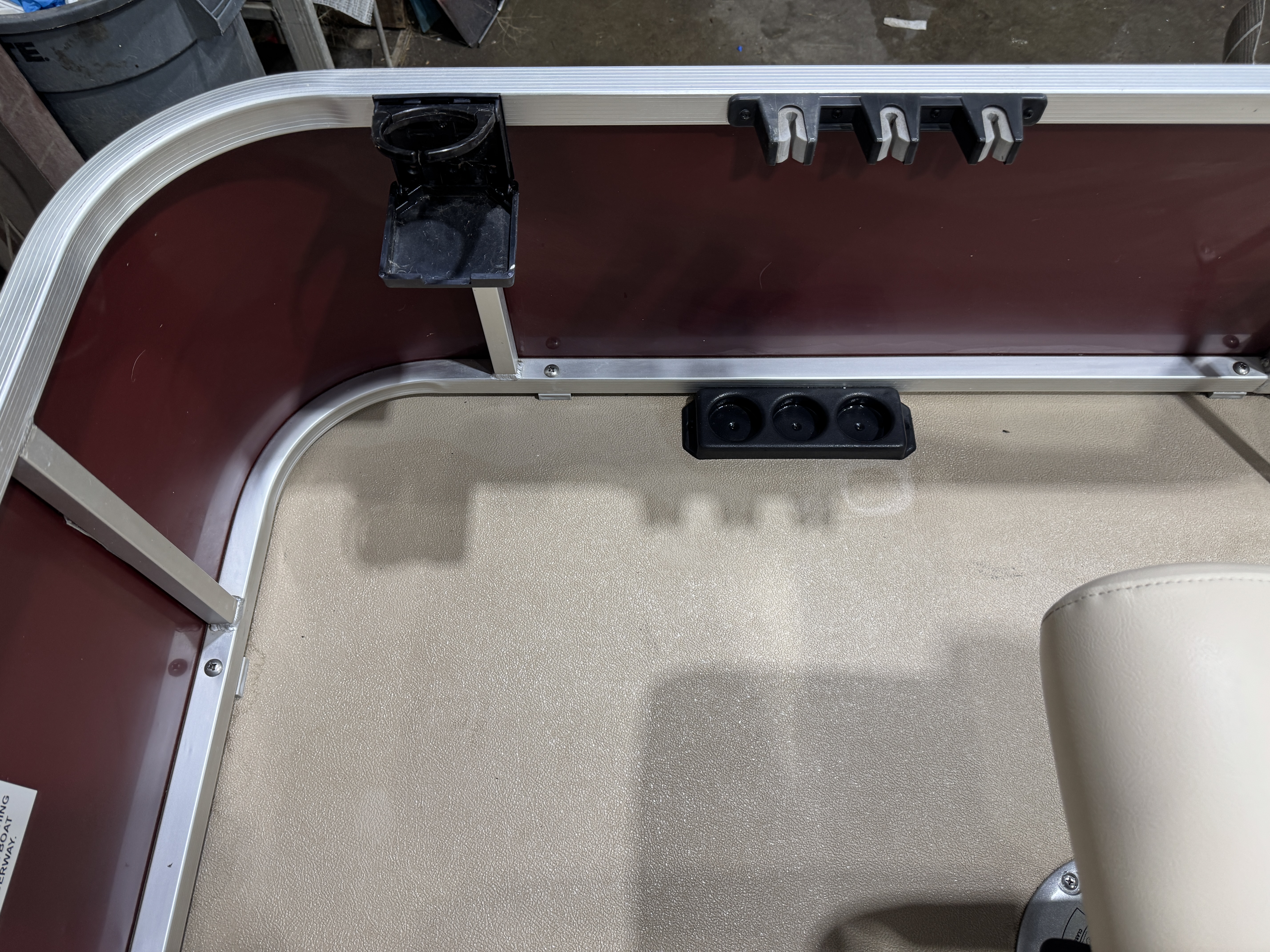 storage bracket and drink holder on the fence rail next to the seat. The
