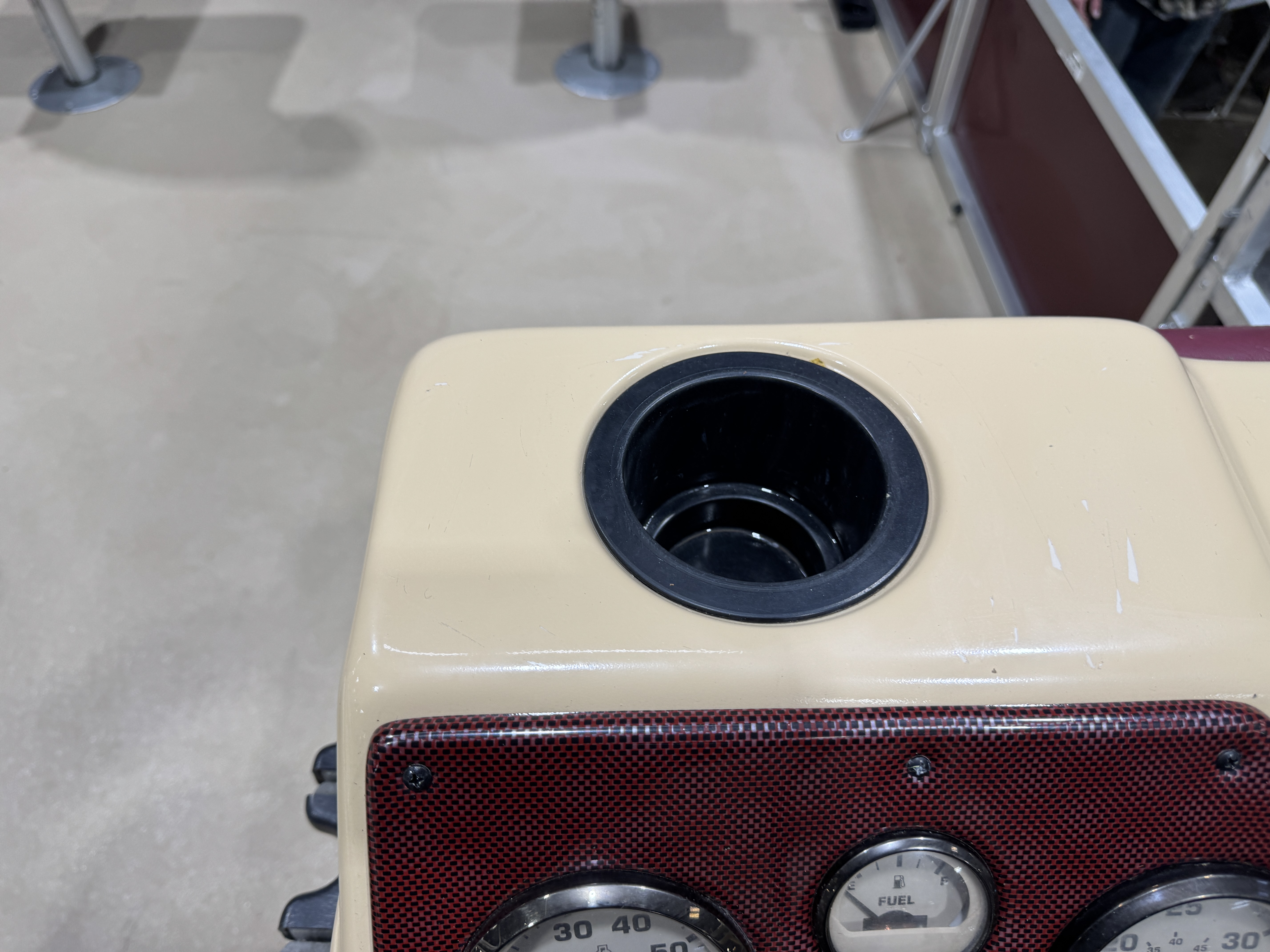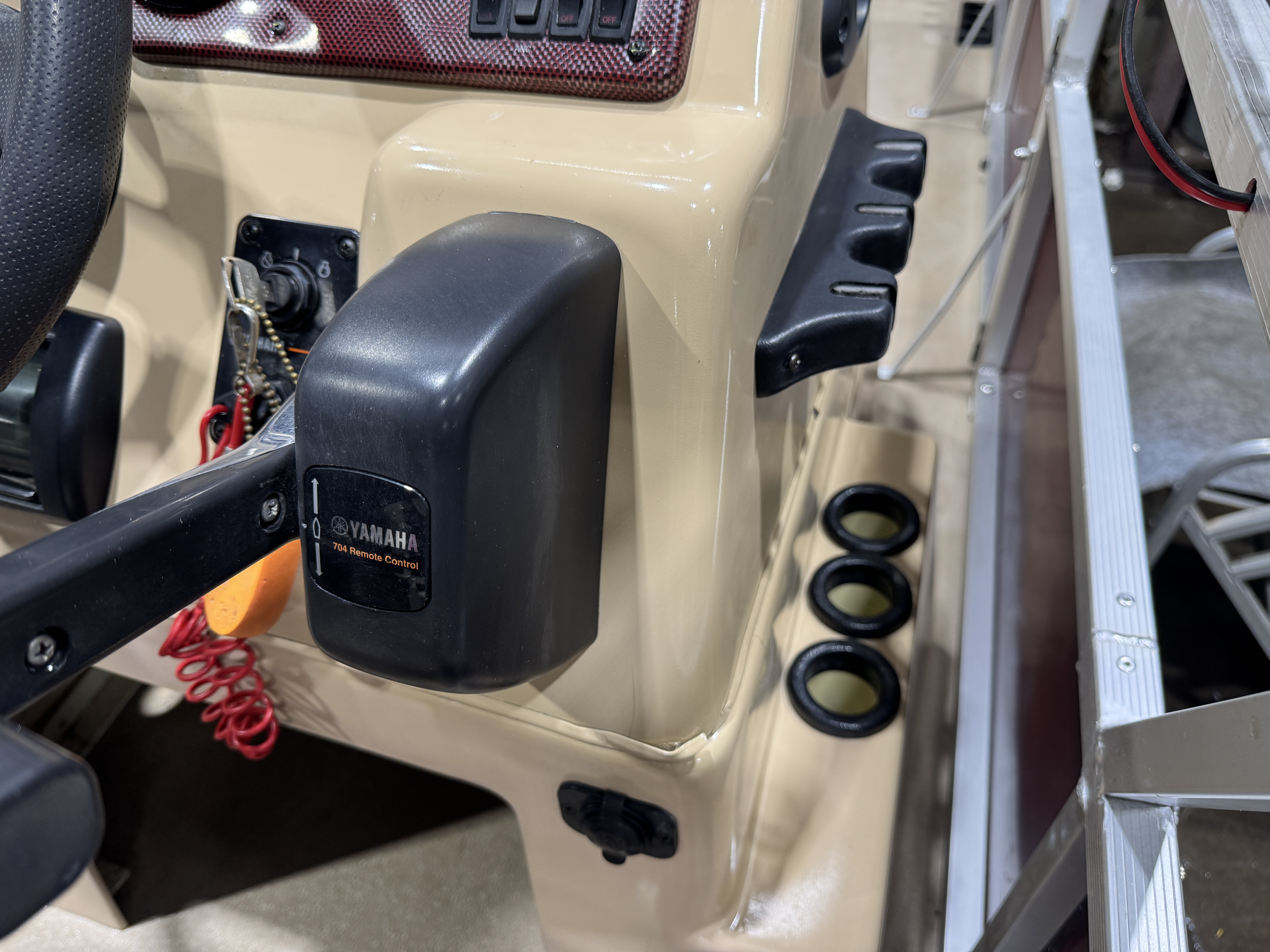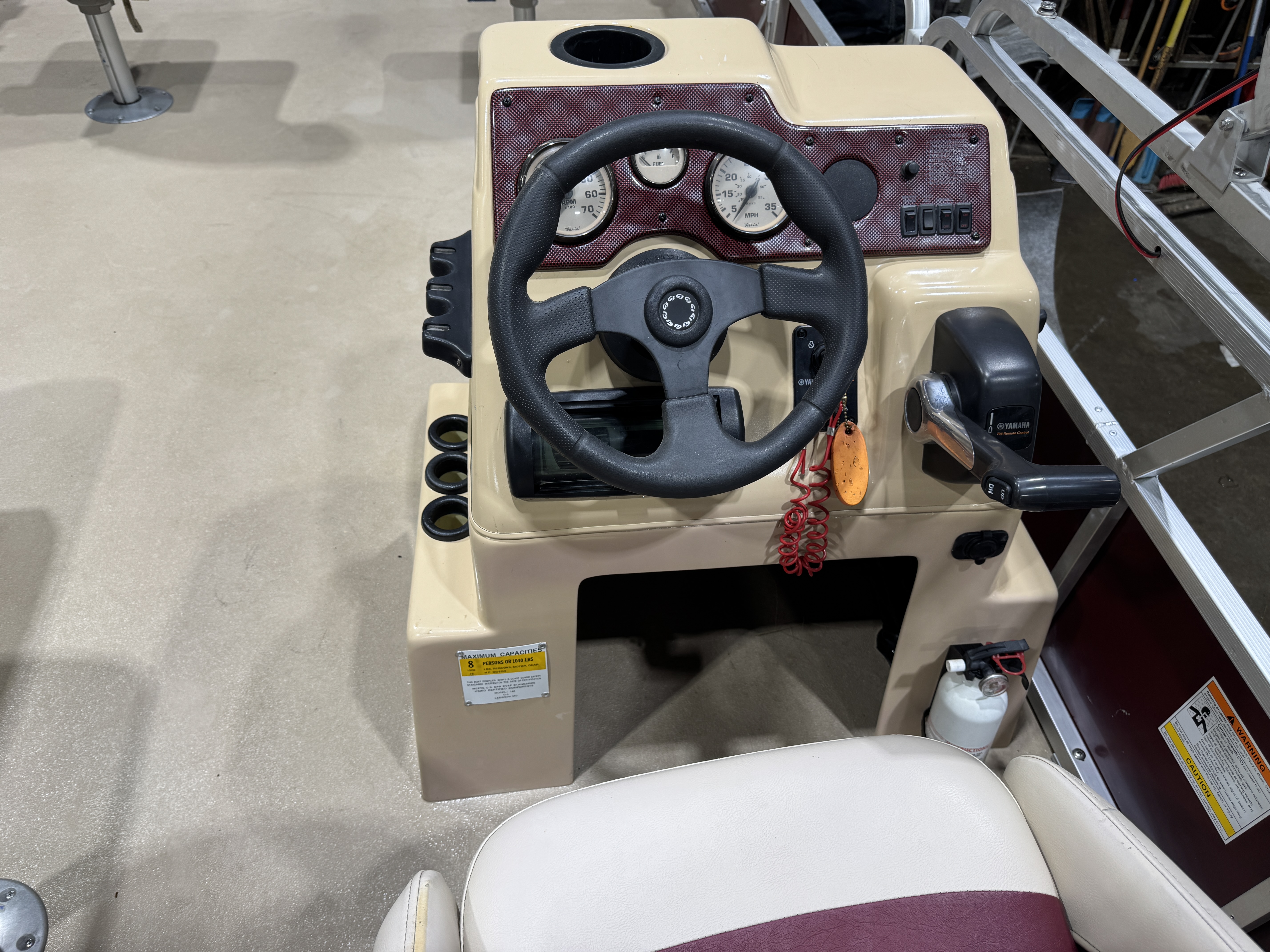 storage brackets on both sides of the helm and a drink holder on top. There is a