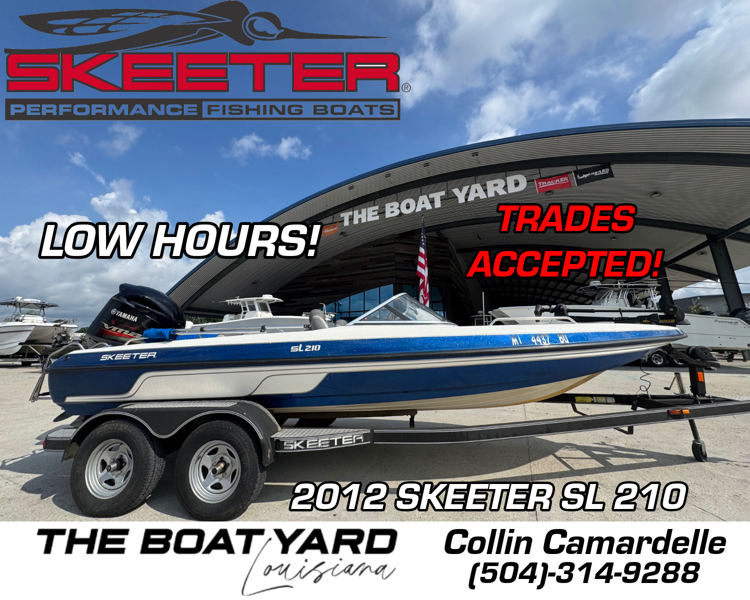 2012 Skeeter SL 210 powered by a reliable Yamaha 200 outboard. This versatile fish-and-ski boat is perfect for family fun or serious angling, offering smooth performance, plenty of storage, and a spacious layout. Well-maintained and water-ready—don’t miss your chance to own this all-around lake machine! Max HP: 200 hp