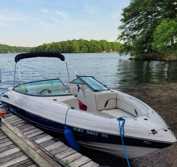 Features include captain and co-captain bolster seats, snap-in carpeting, bimini top for shade on sunny days, bow anchor storage, aft swim deck with boarding ladder, spacious cockpit seating layout, multiple onboard storage areas, and more!