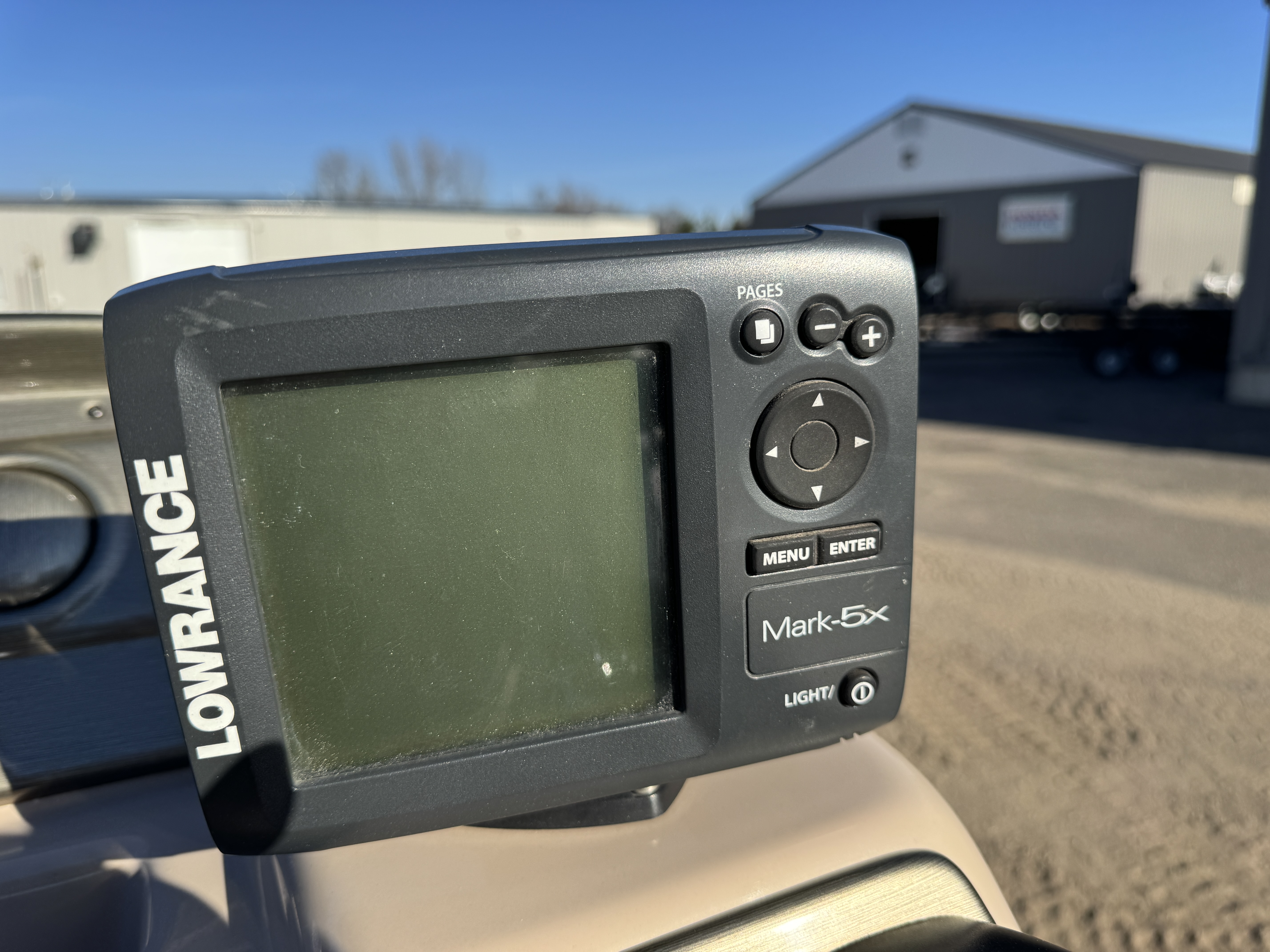 a Lowrance Mark-5X GPS depth/fish finder mounted on the helm. There is a Boss