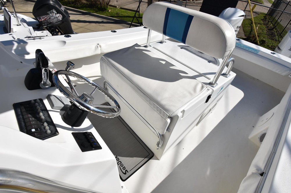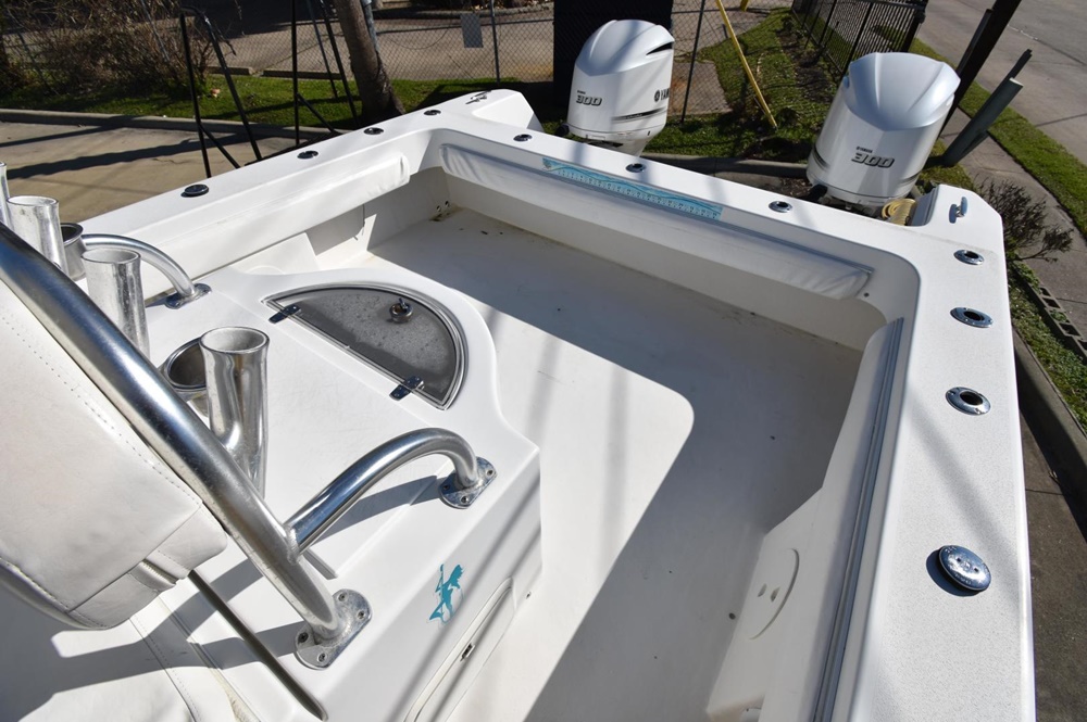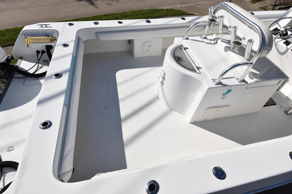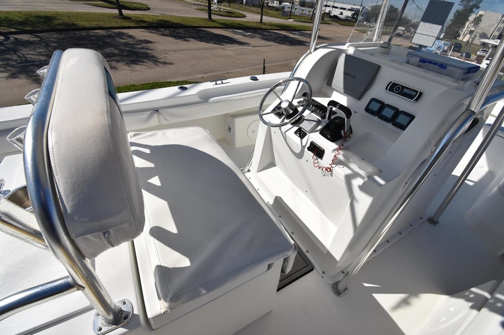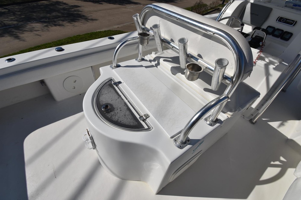 Designed for serious fishing, it features a spacious 50-gallon live well, outriggers, and a large fish box integrated into the leaning post. The thoughtfully equipped helm includes top-tier electronics like a Garmin 5212 with autopilot, VHF radio, Garmin Radar, and a Bluetooth-enabled sound system with an amplifier. LED spreader lights and hydraulic steering round out the features to ensure effortless handling and functionality on the water.