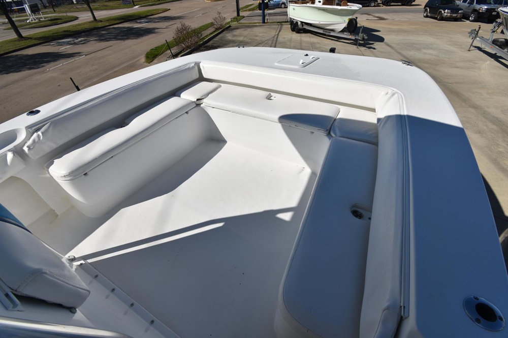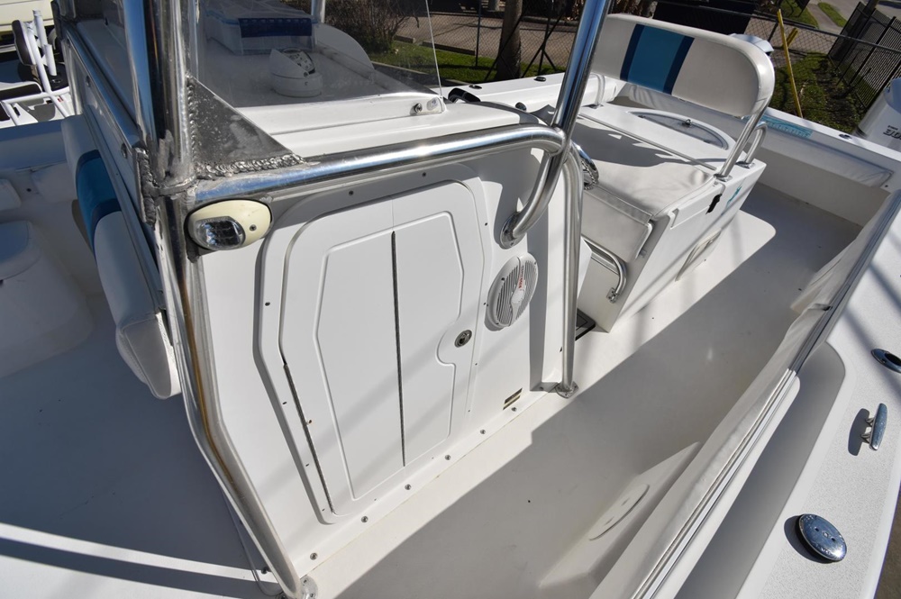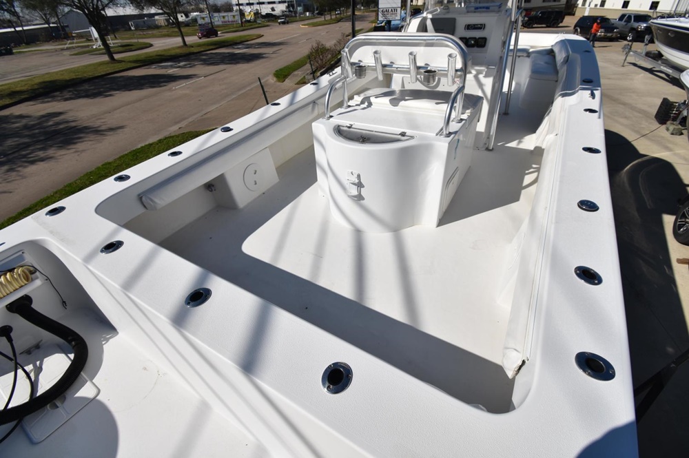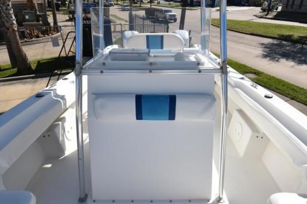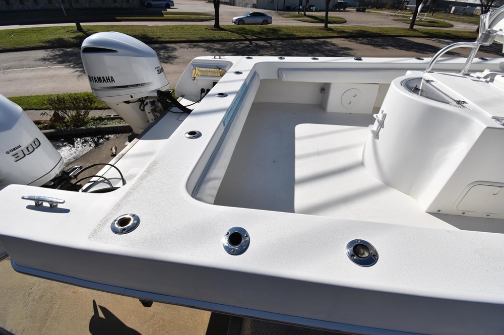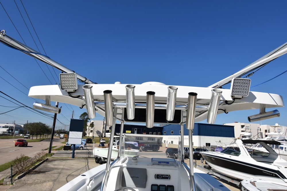 Designed for serious fishing, it features a spacious 50-gallon live well, outriggers, and a large fish box integrated into the leaning post. The thoughtfully equipped helm includes top-tier electronics like a Garmin 5212 with autopilot, VHF radio, Garmin Radar, and a Bluetooth-enabled sound system with an amplifier. LED spreader lights and hydraulic steering round out the features to ensure effortless handling and functionality on the water.