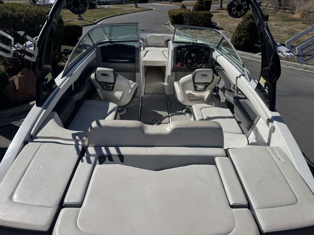 Up front, a wide walkway leads to adult-sized bow seats with storage underneath and an ice chest forward. Built to stay looking new for years to come, the 226 features fiberglass liner construction for precise fit and finish. Kevlar reinforcement adds strength. Key options include a bow filler cushion, snap- in carpet, a custom wakeboard tower and a swim platform logo mat.