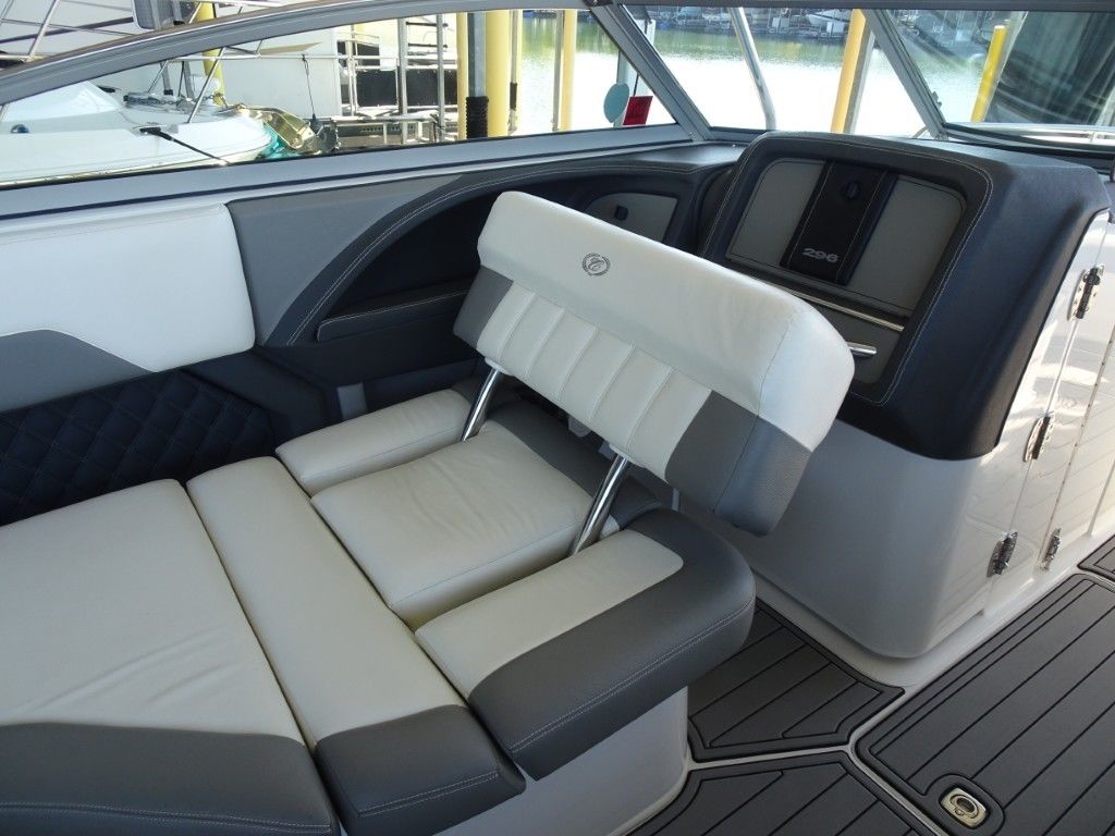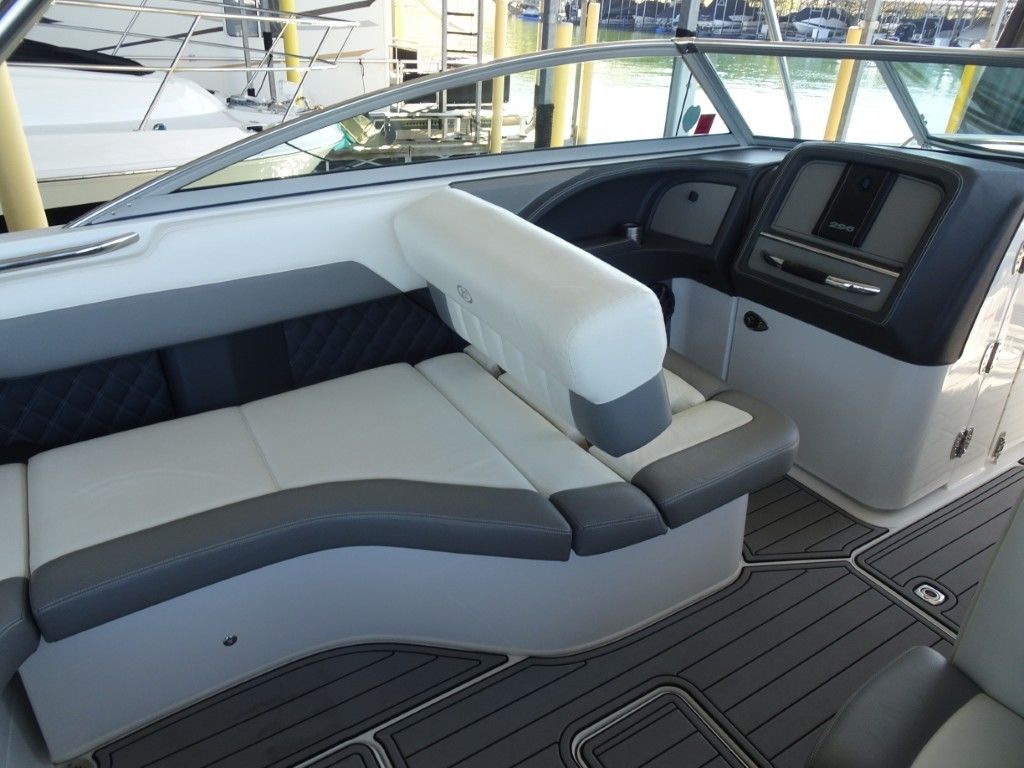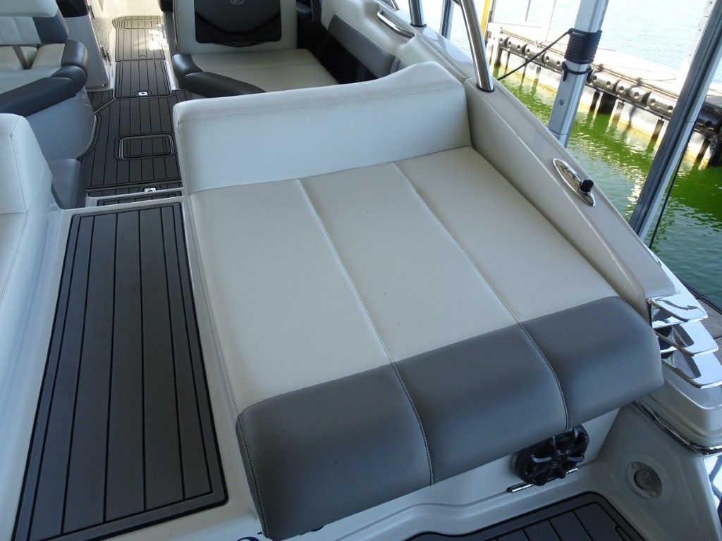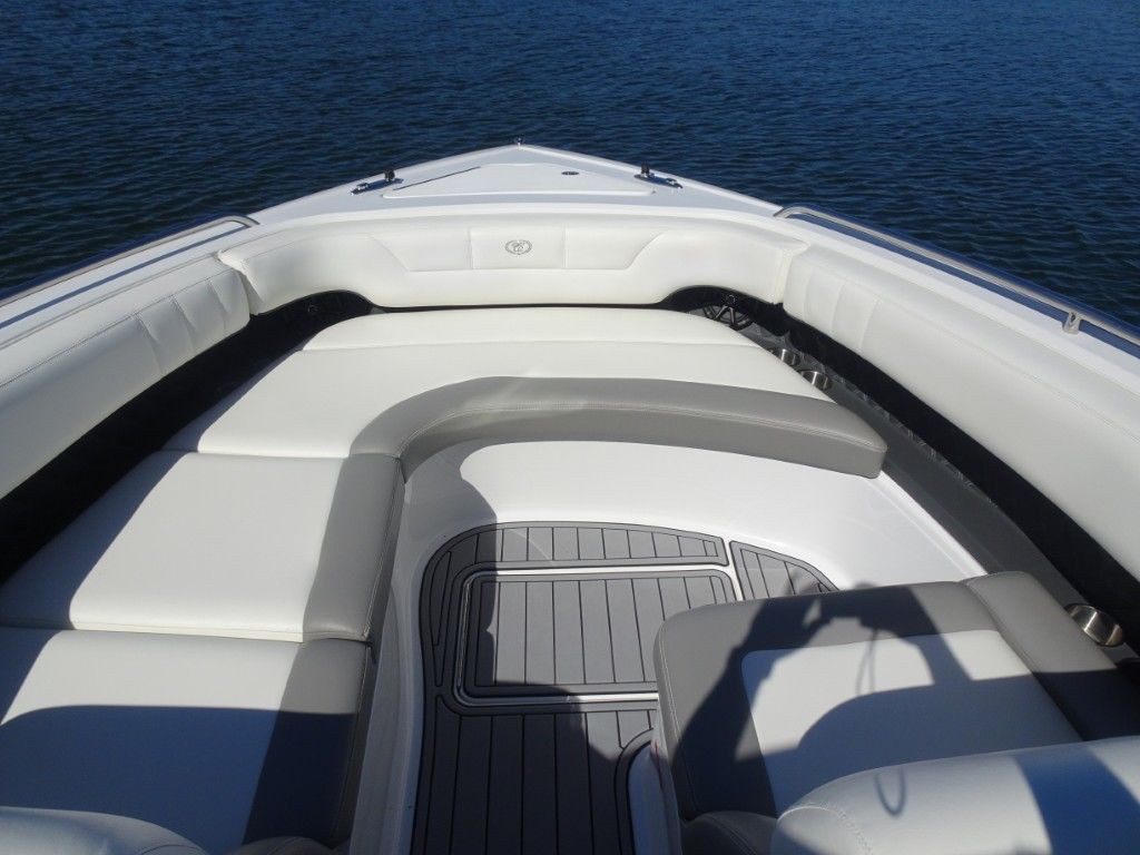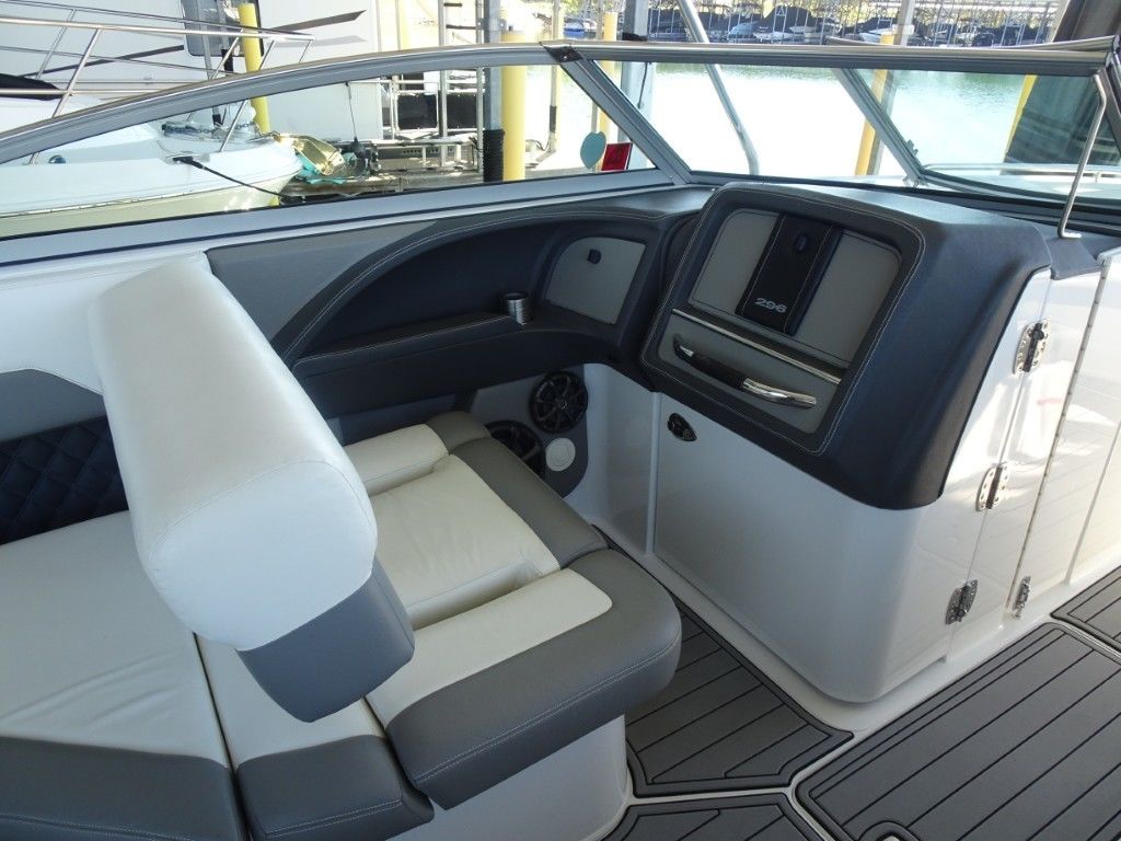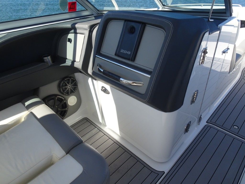 For a boat of its length and beam, the single-engine 296 jumps on plane with noteworthy suddenness. With two engines, the word is ‘launch.” That said, the ride here is hushed, soothing, and soft, much like the 296’s interior, with a layout here that is both custom –from throw pillows to club configuration – and unlike any other bowrider’s. A space more limousine than marine. The comfort accumulates astern in all-weather, personalized luxury straight out of your living room. Wraparound conversation is waiting in the bow.