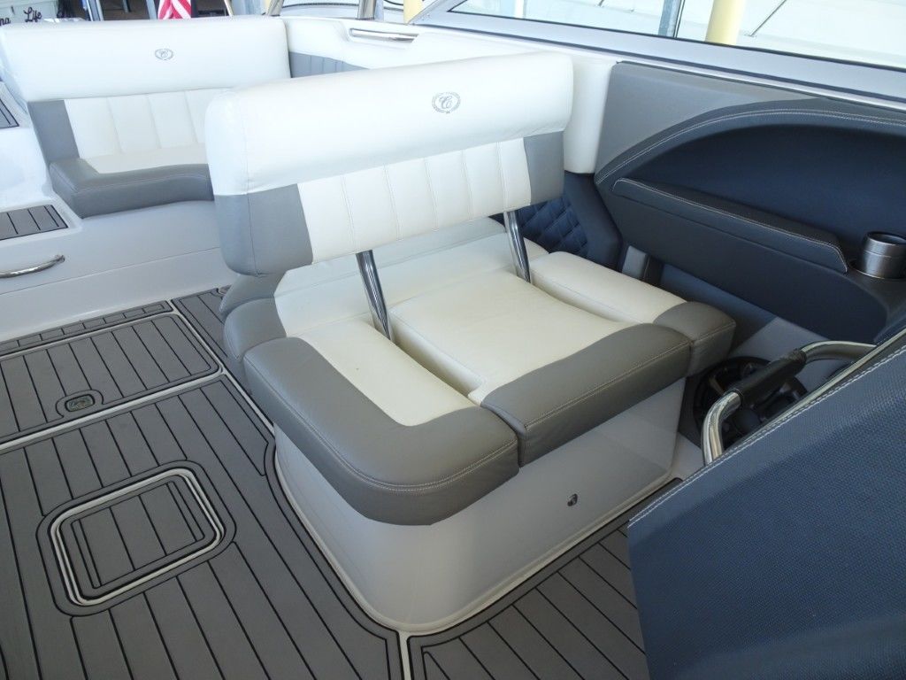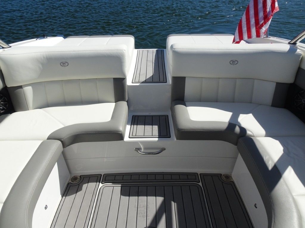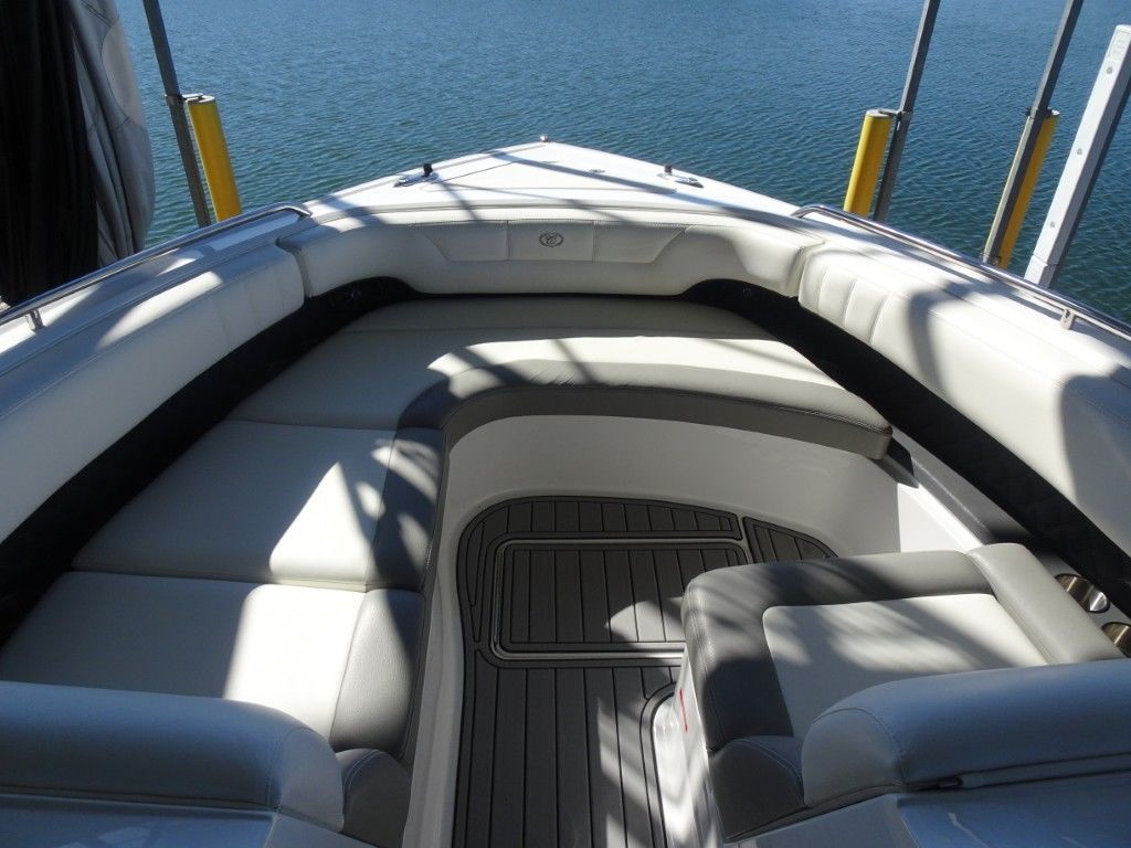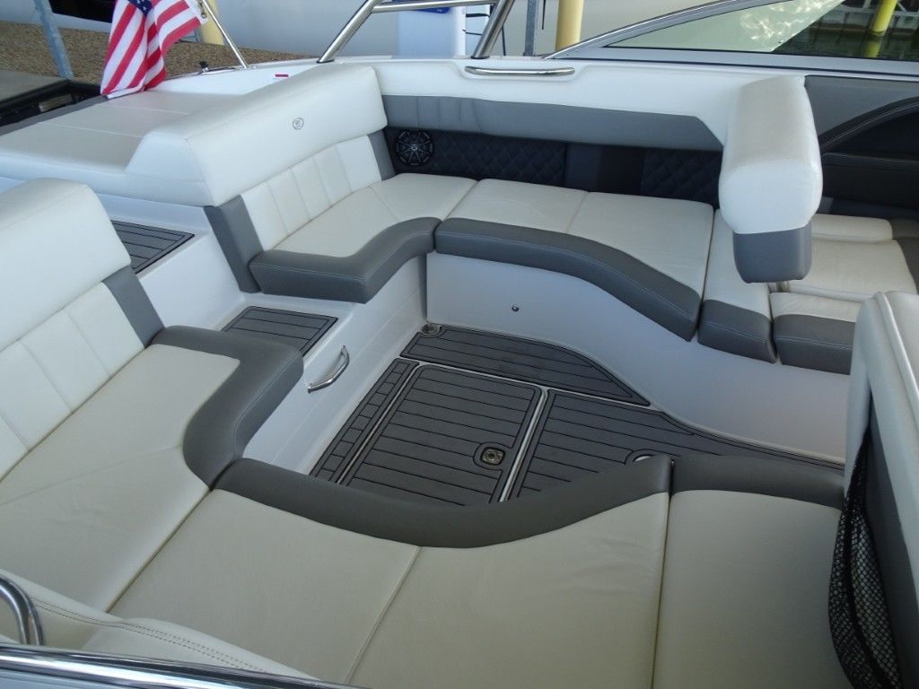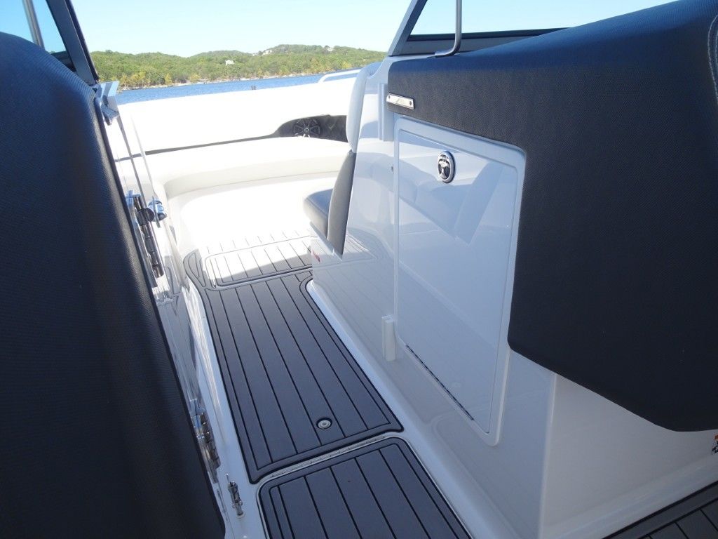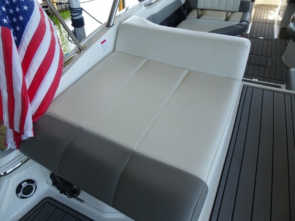 For a boat of its length and beam, the single-engine 296 jumps on plane with noteworthy suddenness. With two engines, the word is ‘launch.” That said, the ride here is hushed, soothing, and soft, much like the 296’s interior, with a layout here that is both custom –from throw pillows to club configuration – and unlike any other bowrider’s. A space more limousine than marine. The comfort accumulates astern in all-weather, personalized luxury straight out of your living room. Wraparound conversation is waiting in the bow.