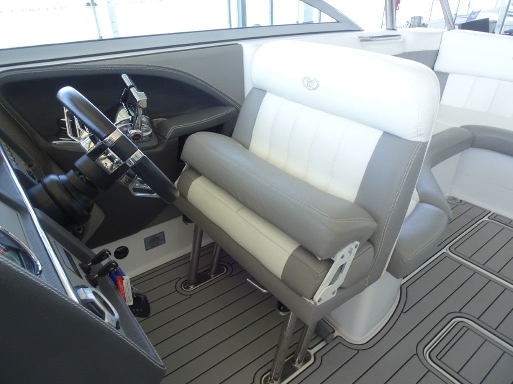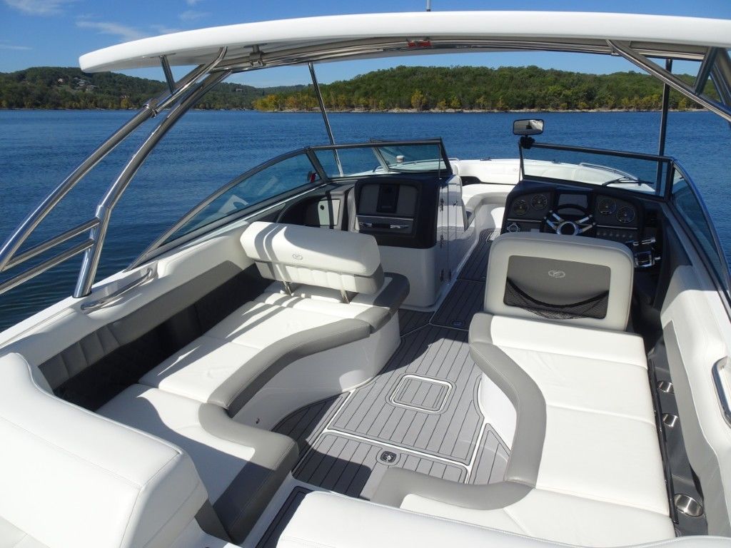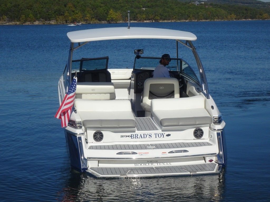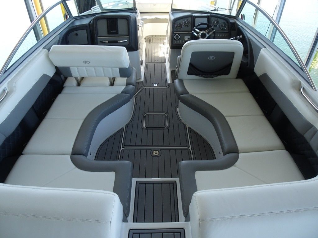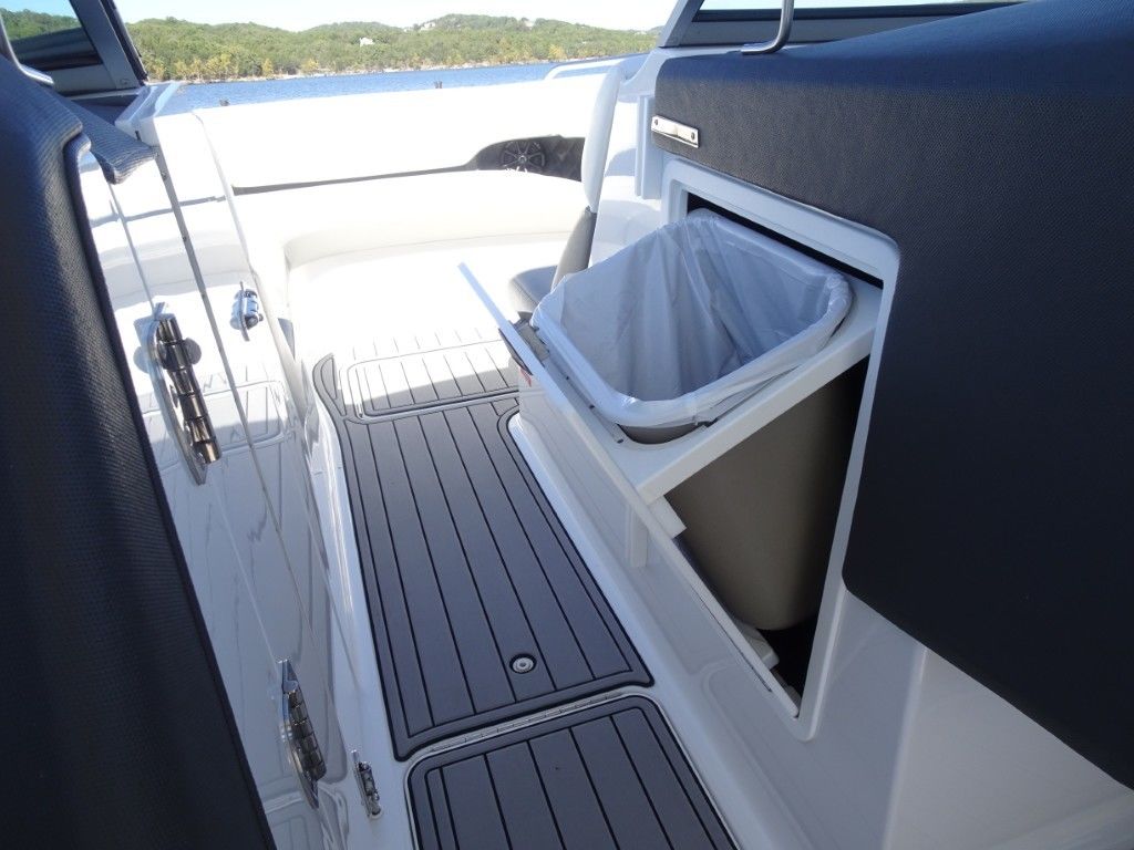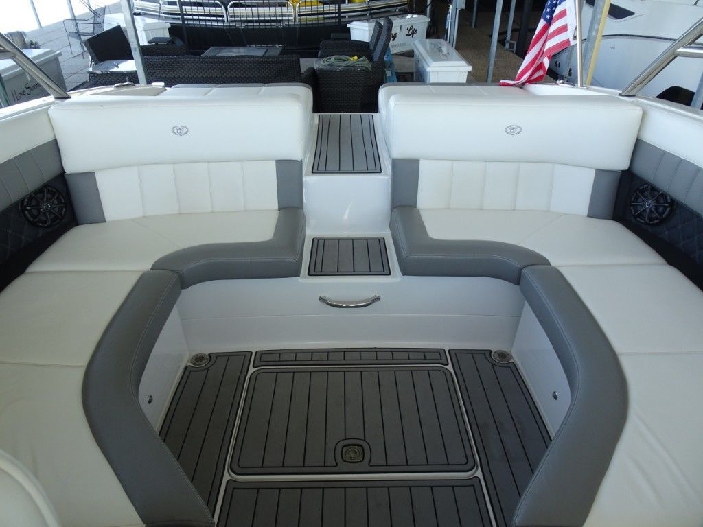 For a boat of its length and beam, the single-engine 296 jumps on plane with noteworthy suddenness. With two engines, the word is ‘launch.” That said, the ride here is hushed, soothing, and soft, much like the 296’s interior, with a layout here that is both custom –from throw pillows to club configuration – and unlike any other bowrider’s. A space more limousine than marine. The comfort accumulates astern in all-weather, personalized luxury straight out of your living room. Wraparound conversation is waiting in the bow.