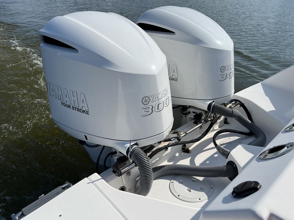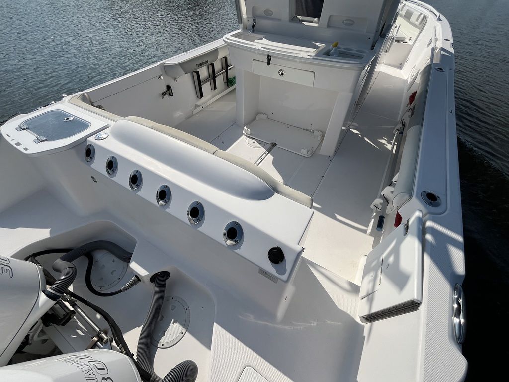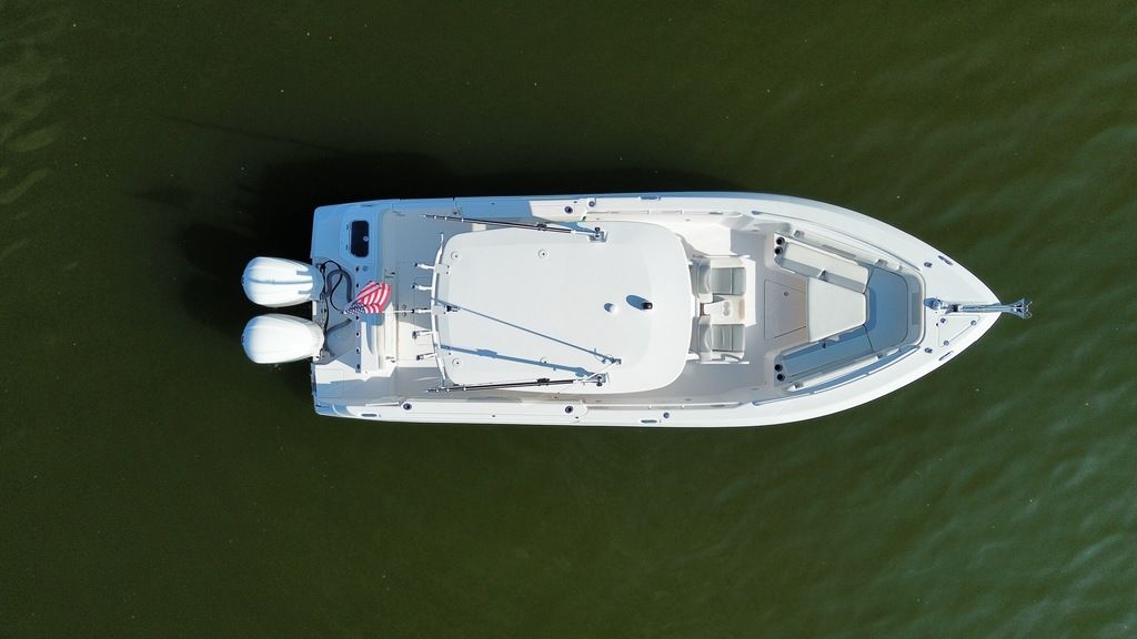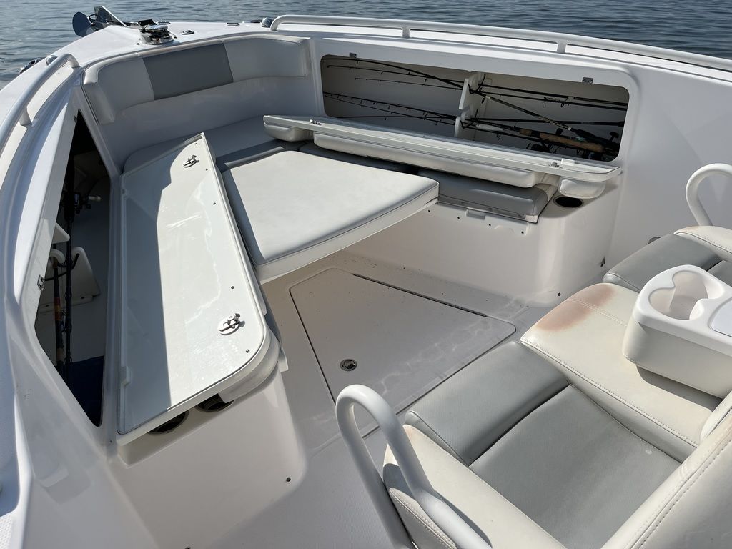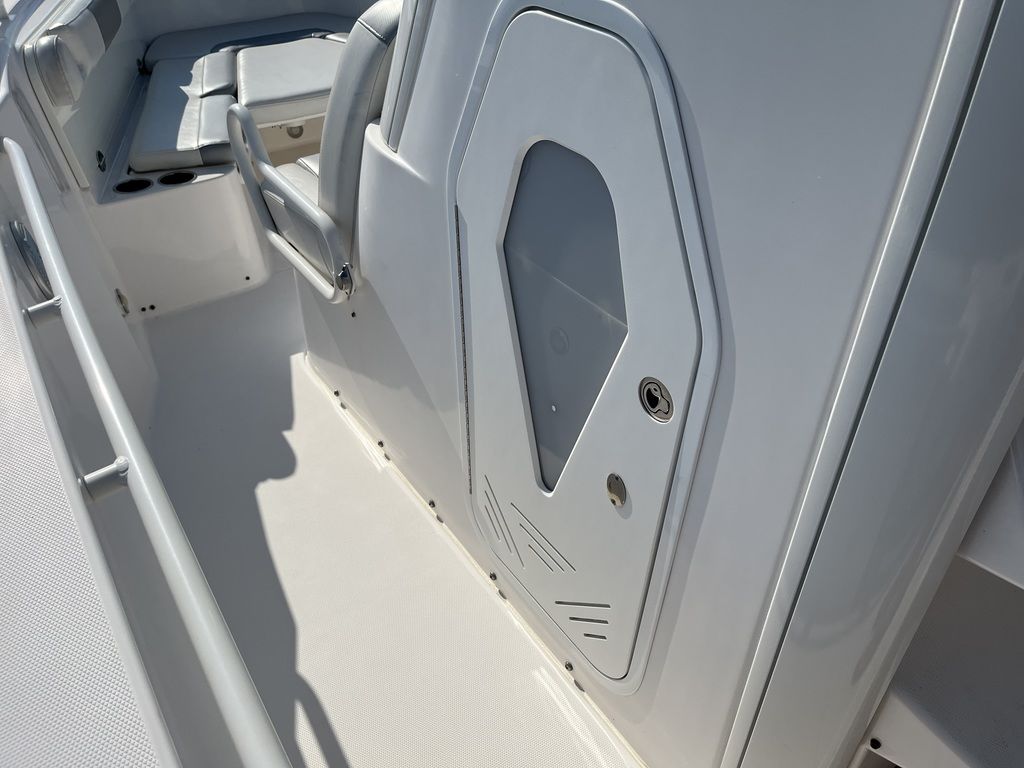 Unsinkable 10-year transferable hull warranty Patented closed molded RAMCAP® construction process Self-bailing cockpit Variable deadrise deep v-hull NMMA, ABYC, and CE certified No wood construction – all composite High density, closed cell, structural foam floatation Hull laminate – premium gel coat, vinyl-ester barrier coat, vinyl-ester skin coat, polyester print barrier and knitted biaxial fiberglass High density PVC composite transom Hull liner and deck mated perfectly for a rigid one-piece construction, adding to its long-term durability Hull liner completely finished inside with Class A surface Molded-in diamond non-skid Rigging troughs – molded-in and oversized for easy access ABS backing used to receive self tapping screws and bolts Aluminum frame work – custom fabricated in house meeting stringent standards, sand blasted then powder coated using premium marine grade materials Gunwale boards – all hand laid and extra heavy-duty Caulking – high grade, non-yellowing, mildew resistant polyurethane (not silicone bath caulk) Wire harnesses – manufactured in house using marine grade, tinned copper wire, high grade heat shrink connectors and waterproof Deutsch plugs Circuit protection – circuit breakers or fuses protect all electrical circuits Heavy-duty rub rail with 316 stainless steel insert and end caps 316-L stainless steel and chrome plated fasteners for additional corrosion and stain resistance All hardware bedded or gasketed to resist crevice corrosion 316-L cast stainless steel hinges and latches Heavy-duty, welded bow and stern eyes, bedded and sealed in polyurethane Upholstery – extra-heavy vinyl with acrylic top coat, Tenara™ thread, and anti-mildew backing - adhered to highdensity plastic backing (no wood) with flow through foam cushions Bronze high speed intake strainers Painted aluminum 200 gal fuel tankThis boat comes with the following options: