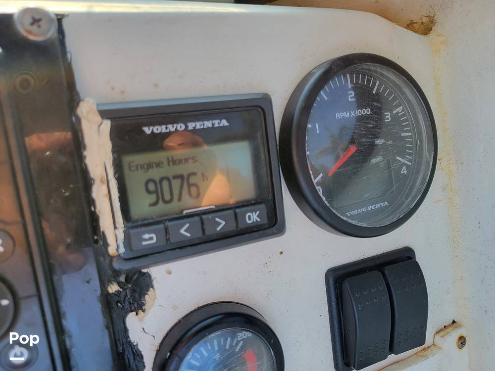 The 2019 Volvo D4 300 horsepower engine has over 9000 hours of run time. For maintenance, the cylinder head was pulled at 6000 hours. Most of the hours are at idle, as the motor is kept running while fishing. The seller is confident in the boat and continues to fish it.