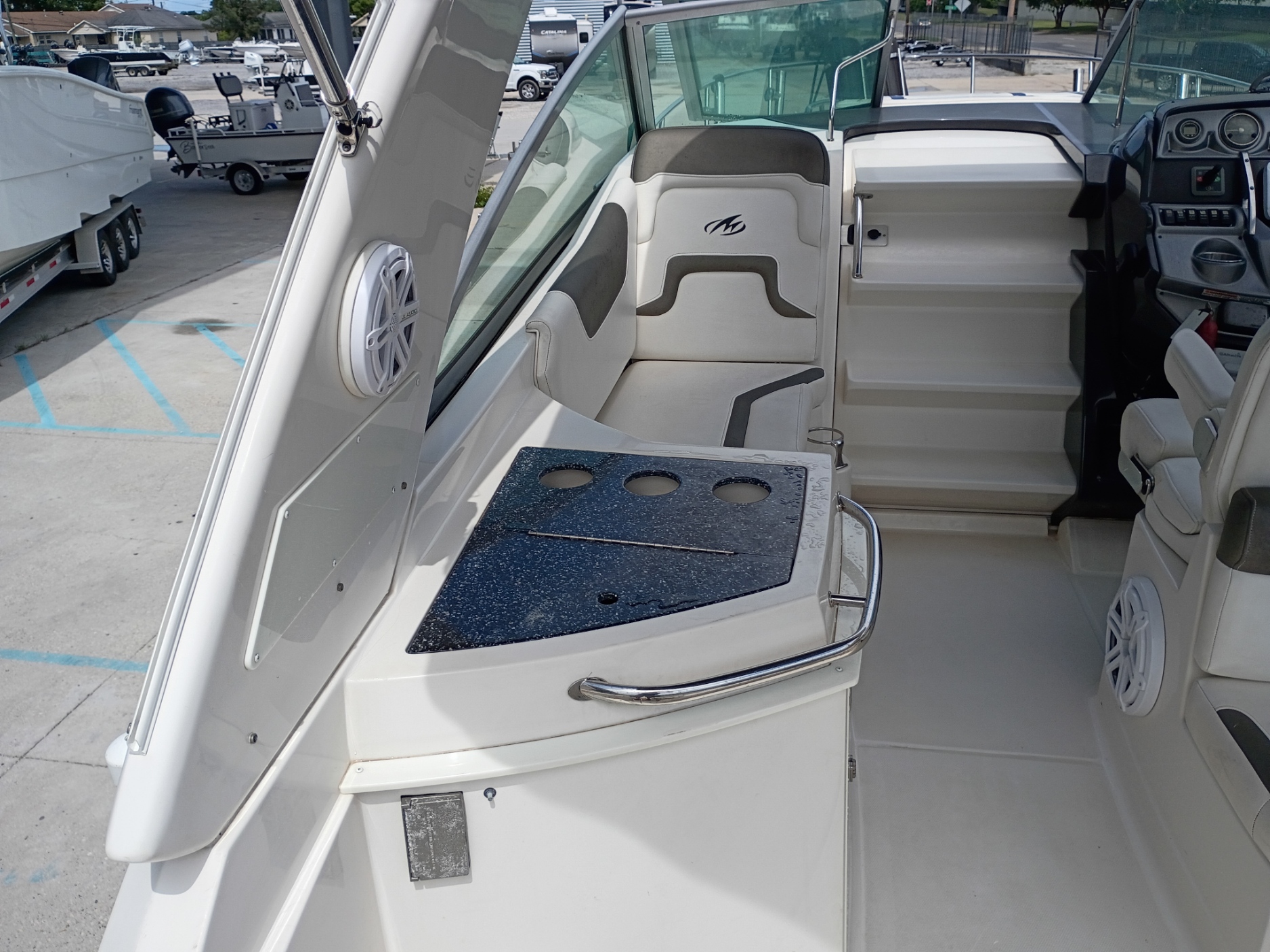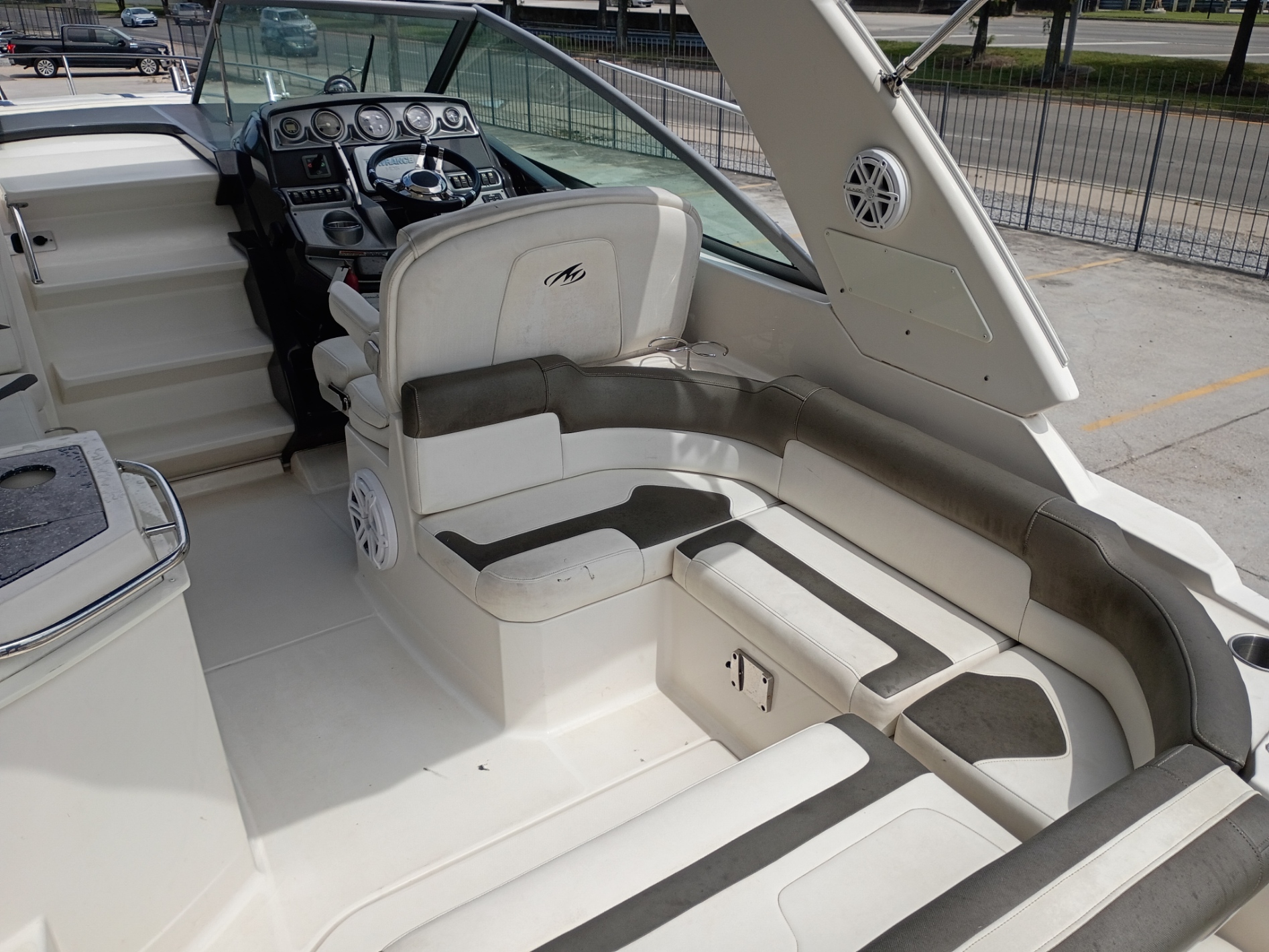 Cockpit: Spacious cockpit with seating, a wet bar, and a removable table.