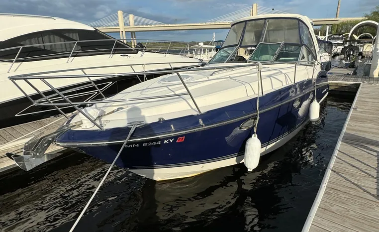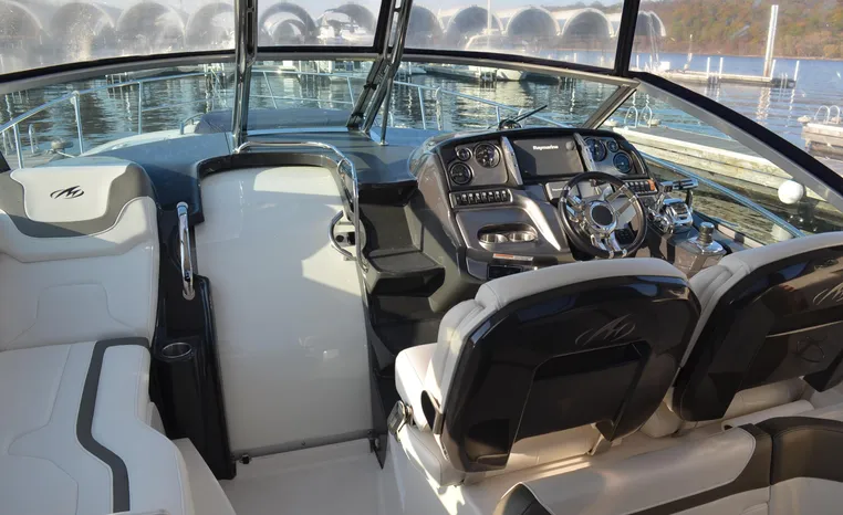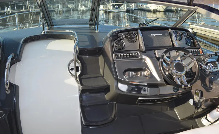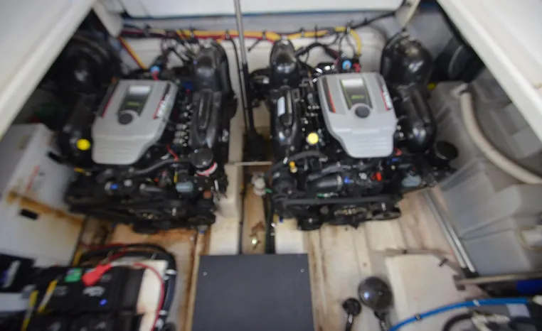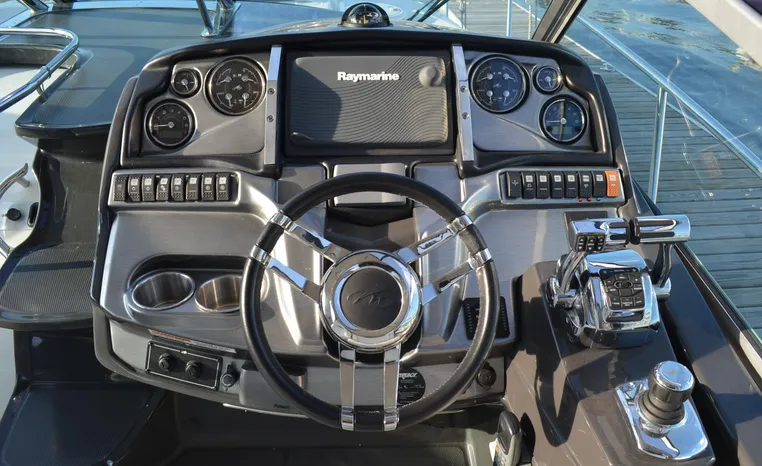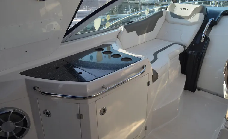 2013 Monterey 34 SY Hardtop Express, twin Mercruiser Magnum 300 HP, GM 350 CID, 6.2 litre, 730 approximate hours, Bravo III duo prop with Axius sterndrive control system, Kohler 5.0kw generator with sound shield, 165 approximate hours, dual 30 amp/125vac electrical shore service, two shore power cords, four batteries, Fireboy auto halon system, Marine Air reverse cycle air/heat, pressure water, water heater, Bemis head/shower/vanity, master stateroom forward with offset queen berth, guest stateroom mid-cabin with double berth, convertible sofa sleeps two, teak and holly cabin sole, white colored wall covering, tan upholstery, cherry interior, hatch screens, Fusion AM/FM/stereo /CD/Bluetooth player, single stainless sink, Isotherm 12vdc/115vac refrigerator/freezer, Kenyon two burner electric stove, Haier microwave oven, blue canvas, HDTP top with enclosure, additional new enclosure, Raymarine VHF marine radio, Raymarine digital depth finder, Raymarine GPS, Ritchie compass, RCL remote spotlight, bow cushion with cover, Plow style anchor, Lewmar electric windlass, four fenders, mooring lines, windshield wiper, arch, tilt steering wheel, cockpit table, cockpit wet bar with Isotherm refrigerator, walk thru windshield, transom shower, transom door, trim tabs, integral swim platform with extension, boarding ladder.