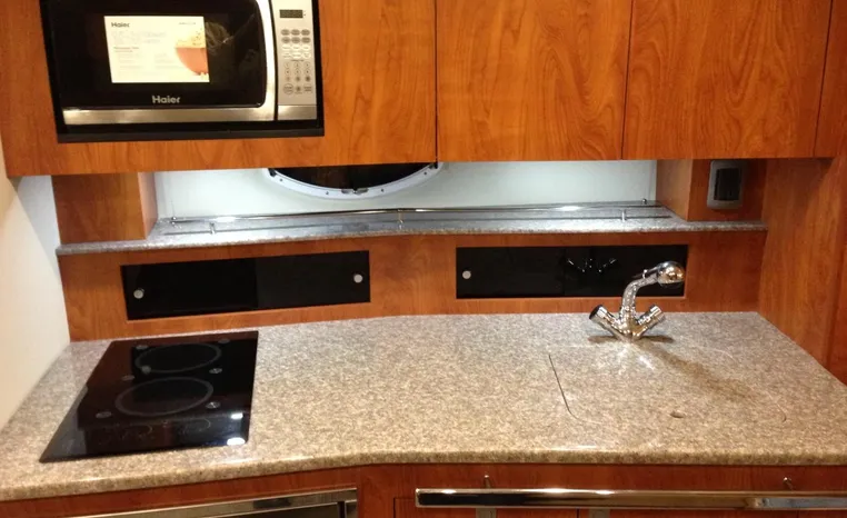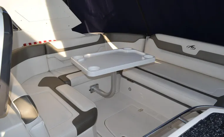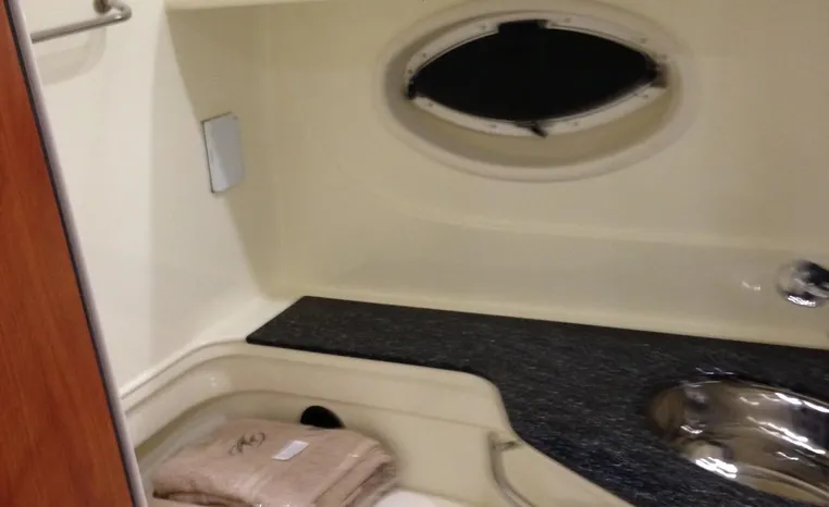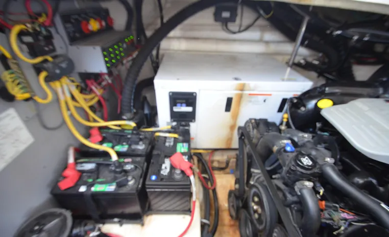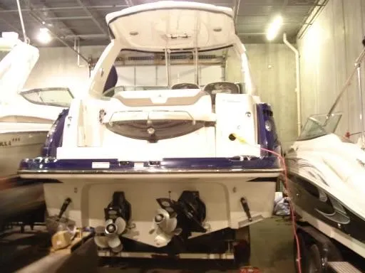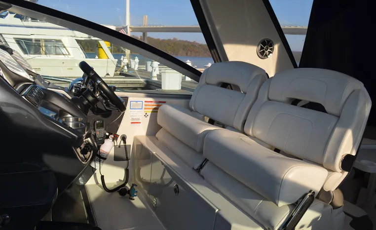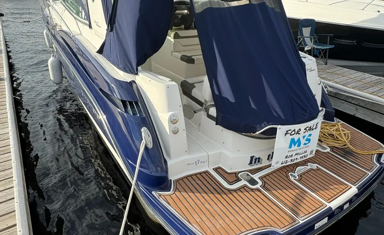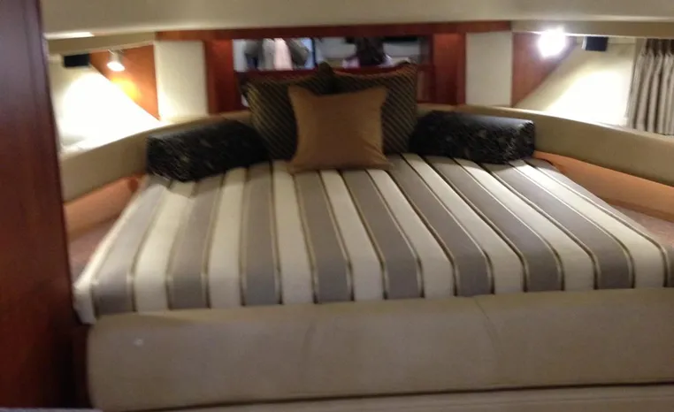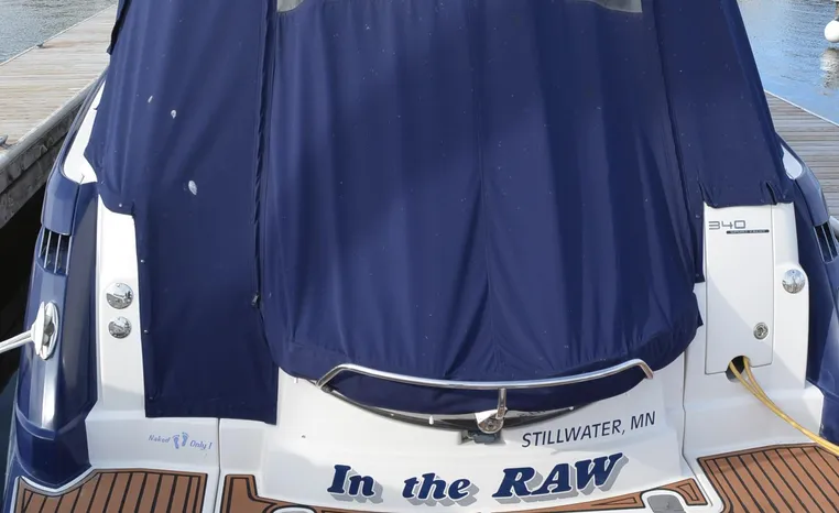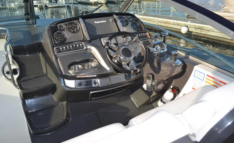 2013 Monterey 34 SY Hardtop Express, twin Mercruiser Magnum 300 HP, GM 350 CID, 6.2 litre, 730 approximate hours, Bravo III duo prop with Axius sterndrive control system, Kohler 5.0kw generator with sound shield, 165 approximate hours, dual 30 amp/125vac electrical shore service, two shore power cords, four batteries, Fireboy auto halon system, Marine Air reverse cycle air/heat, pressure water, water heater, Bemis head/shower/vanity, master stateroom forward with offset queen berth, guest stateroom mid-cabin with double berth, convertible sofa sleeps two, teak and holly cabin sole, white colored wall covering, tan upholstery, cherry interior, hatch screens, Fusion AM/FM/stereo /CD/Bluetooth player, single stainless sink, Isotherm 12vdc/115vac refrigerator/freezer, Kenyon two burner electric stove, Haier microwave oven, blue canvas, HDTP top with enclosure, additional new enclosure, Raymarine VHF marine radio, Raymarine digital depth finder, Raymarine GPS, Ritchie compass, RCL remote spotlight, bow cushion with cover, Plow style anchor, Lewmar electric windlass, four fenders, mooring lines, windshield wiper, arch, tilt steering wheel, cockpit table, cockpit wet bar with Isotherm refrigerator, walk thru windshield, transom shower, transom door, trim tabs, integral swim platform with extension, boarding ladder.