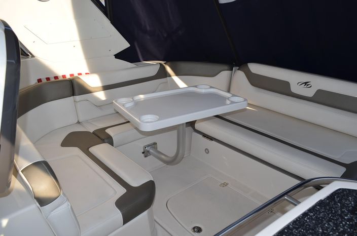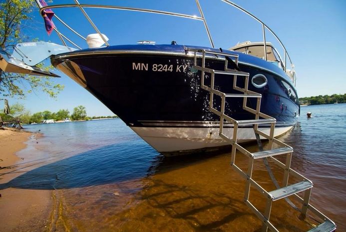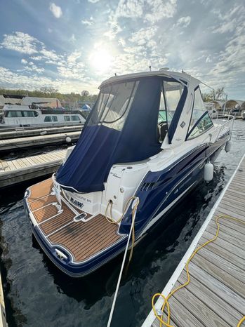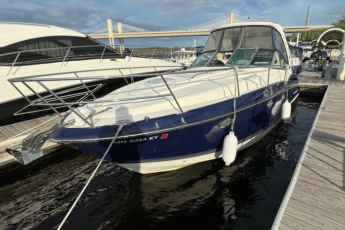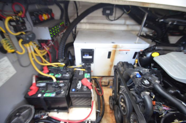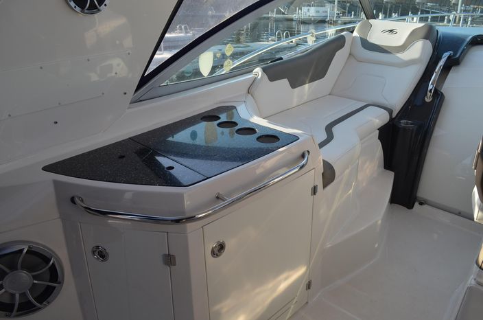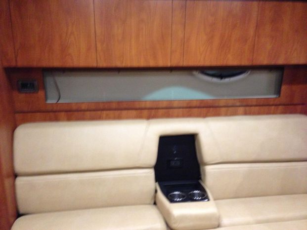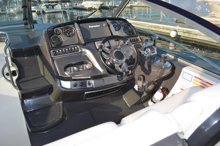 2013 Monterey 34 SY Hardtop Express, twin Mercruiser 300 HP, GM 350 CID, 6.2 litre, 730 approximate hours, Bravo III duo prop with Axius sterndrive control system, Kohler 5.0kw generator with sound shield, 165 approximate hours, dual 30 amp/125vac electrical shore service, two shore power cords, four batteries, Fireboy auto halon system, Marine Air reverse cycle air/heat, pressure water, water heater, Bemis head/shower/vanity, master stateroom forward with offset queen berth, guest stateroom mid-cabin with double berth, convertible sofa sleeps two, teak and holly cabin sole, white colored wall covering, tan upholstery, cherry interior, hatch screens, Fusion AM/FM/stereo /CD/Bluetooth player, single stainless sink, Isotherm 12vdc/115vac refrigerator/freezer, Kenyon two burner electric stove, Haier microwave oven, blue canvas, HDTP top with enclosure, additional new enclosure new 2023, Raymarine VHF marine radio, Raymarine digital depth finder, Raymarine GPS, Ritchie compass, RCL remote spotlight, bow cushion with cover, Plow style anchor, Lewmar electric windlass, four fenders, mooring lines, windshield wiper, arch, tilt steering wheel, cockpit table, cockpit wet bar with Isotherm refrigerator, walk thru windshield, transom shower, transom door, trim tabs, integral swim platform with extension, boarding ladder.